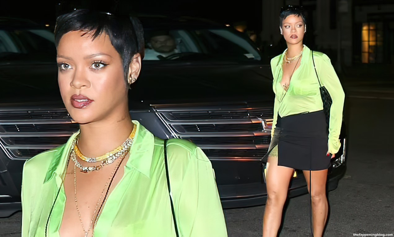 Rihanna deslumbra frente al hotel Bowery con una blusa transparente verde lima y una falda negra que muestra sus largas piernas, 28/06/2021.