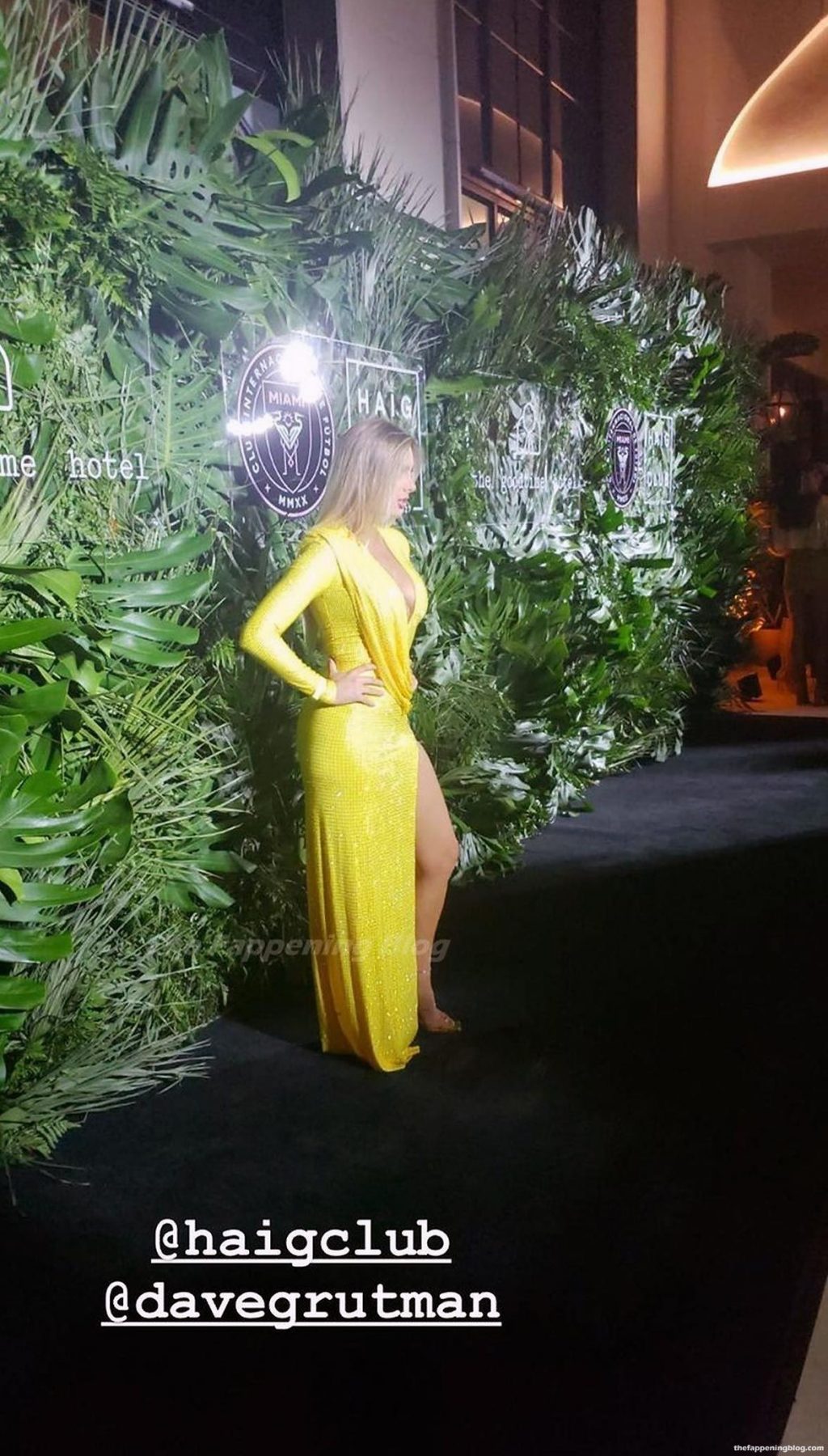 Check this out, guys! Lele Pons tits almost fell out of her dress! She wore a long yellow dress with a deep cleavage at The Goodtime Hotel opening in Miami. The cleavage is there, but the mask is not.