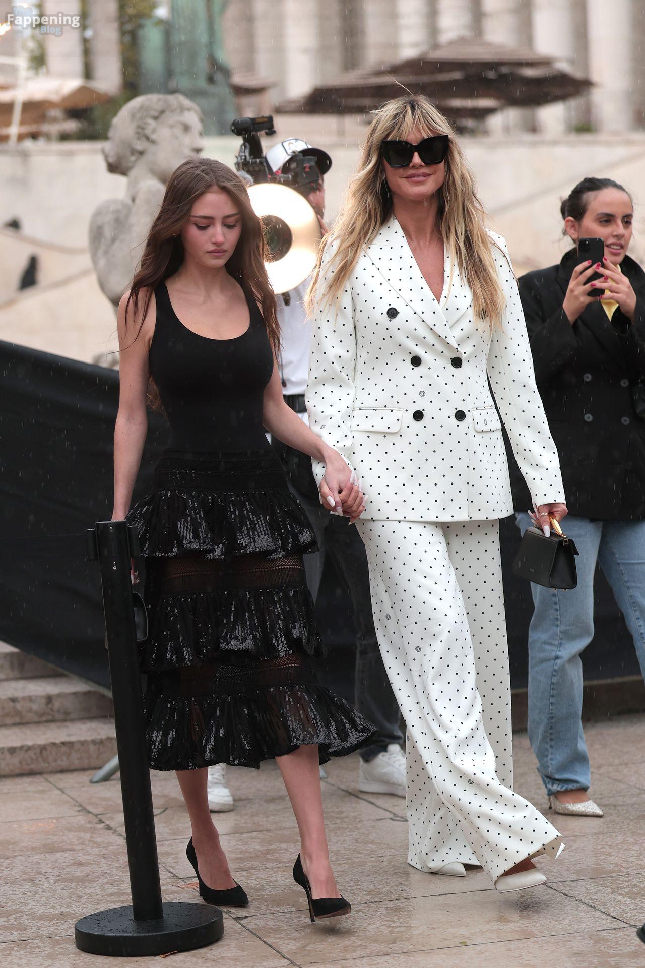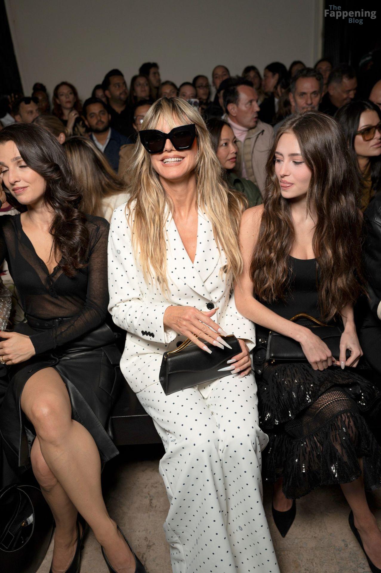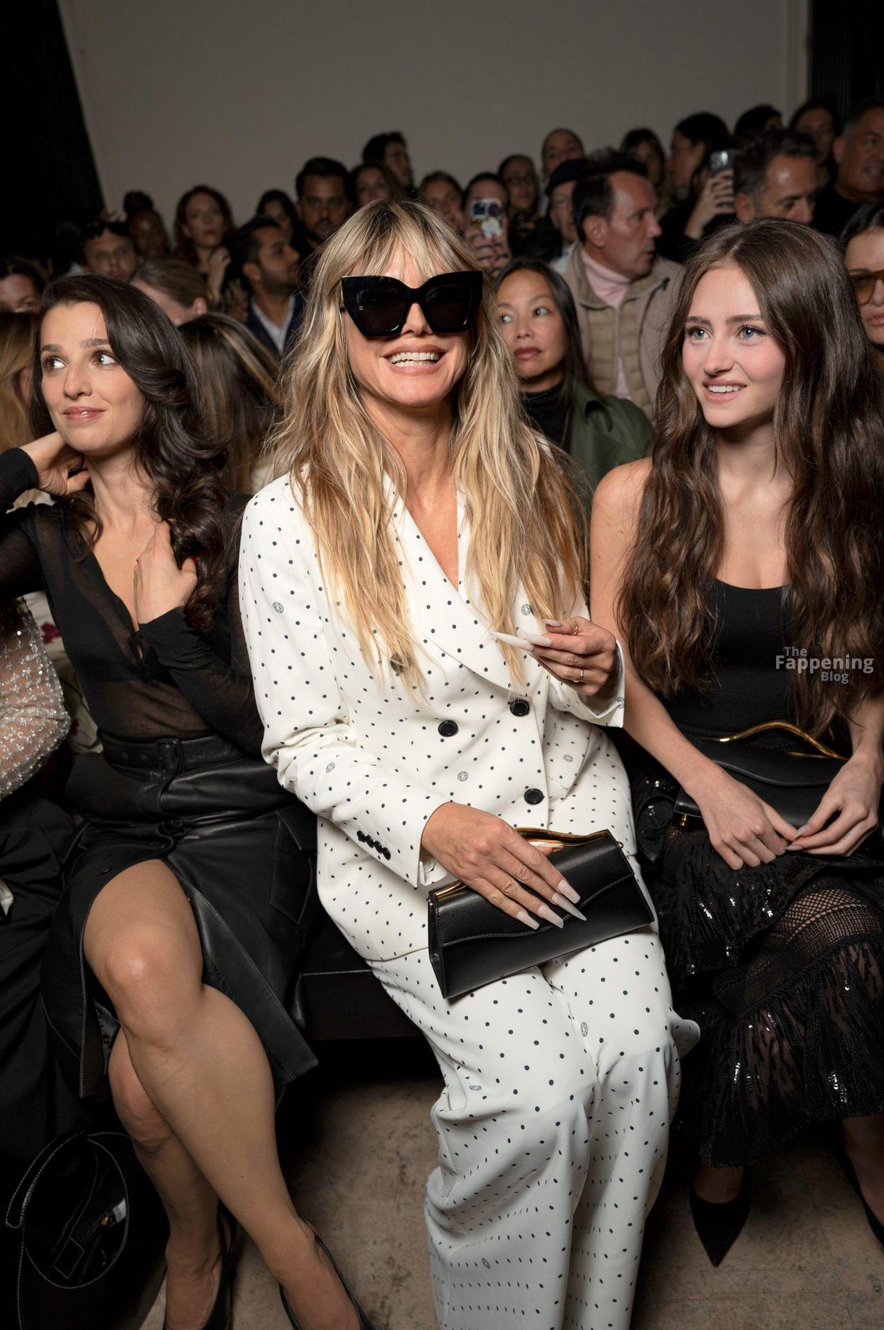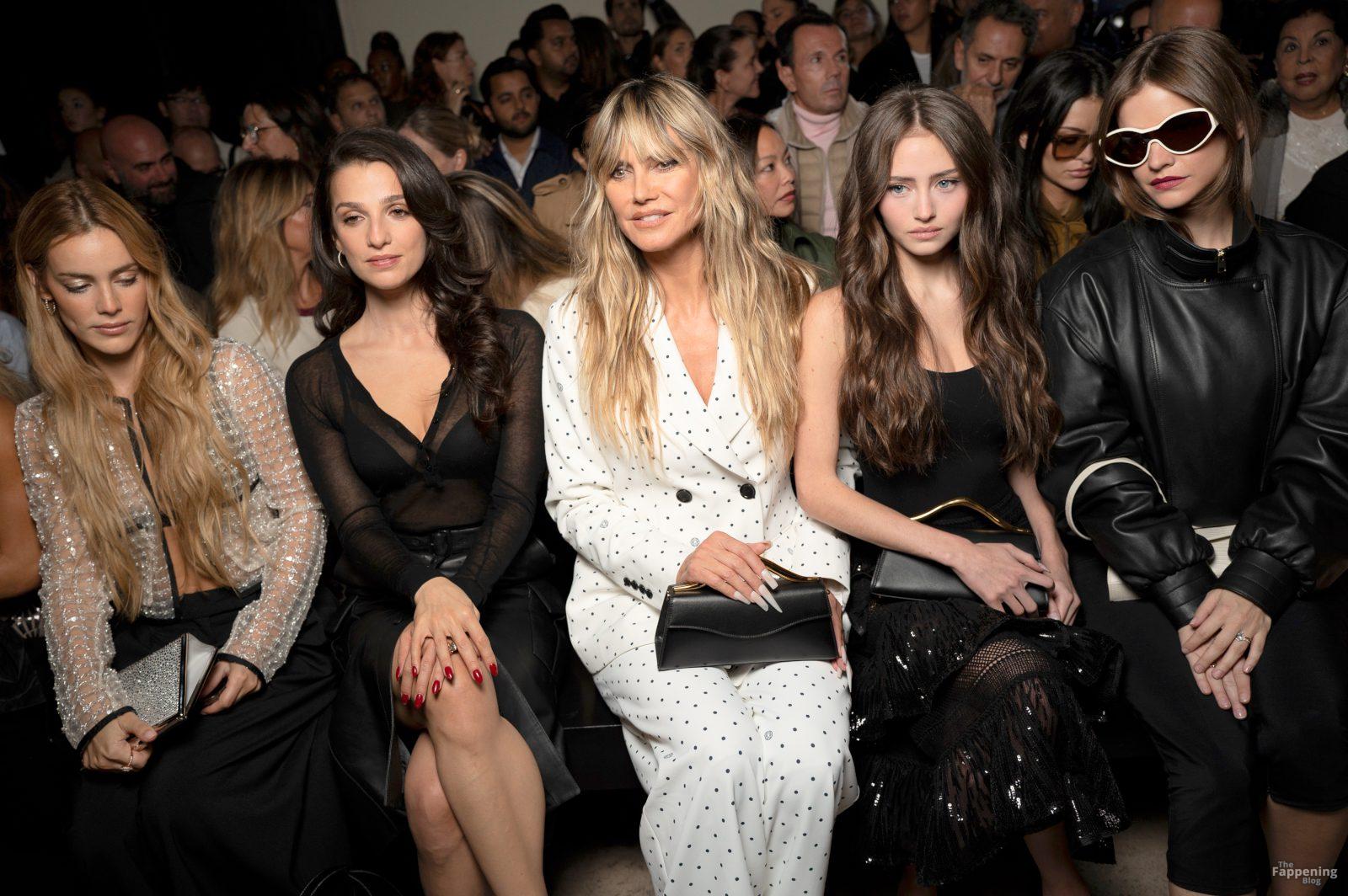 Leni Klum apareció en el desfile de ropa femenina primavera/verano 2026 de Elie Saab durante la Semana de la Moda de París. Lució un ajustado body negro y una falda transparente con lentejuelas, mostrando su escote y piernas.