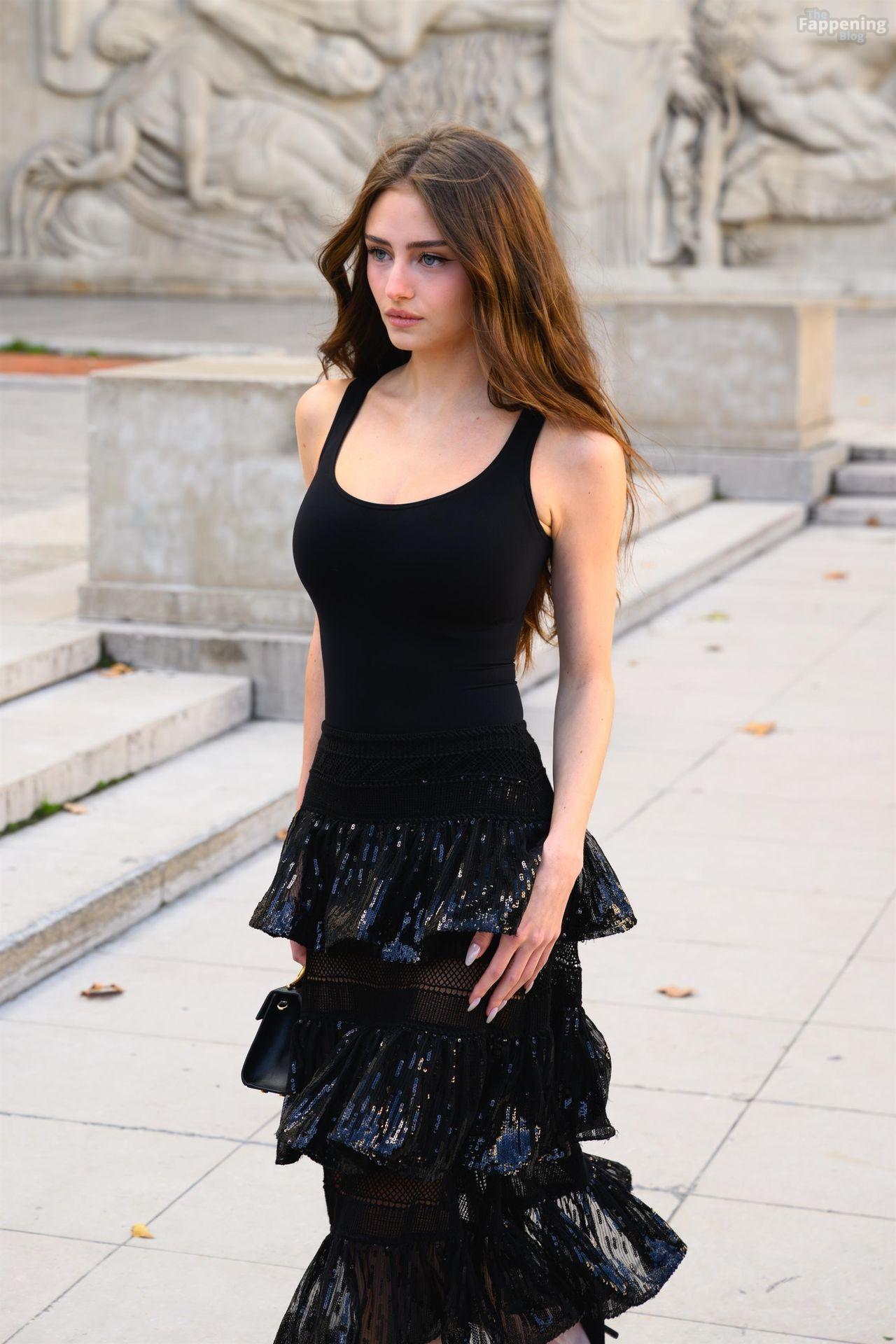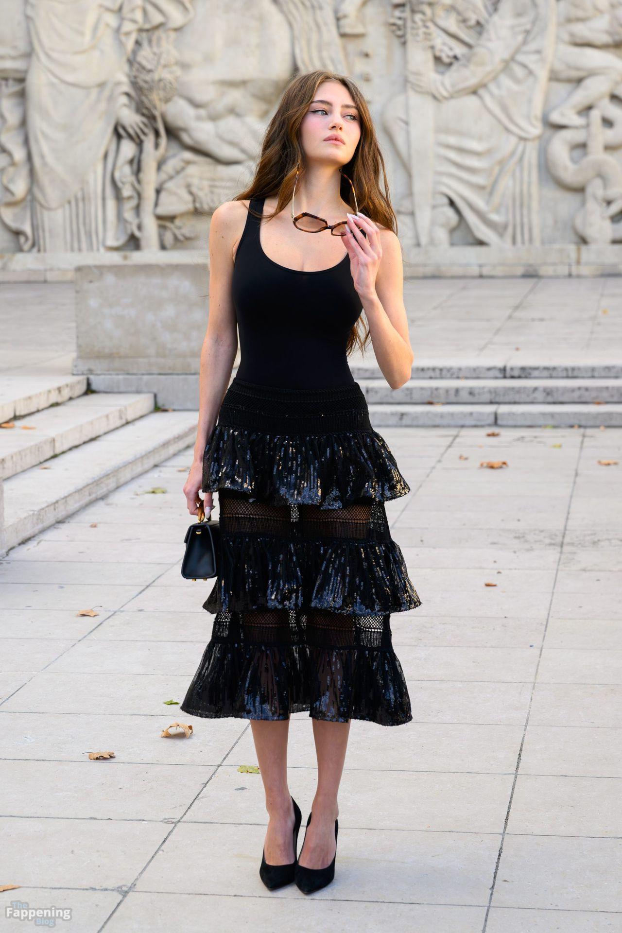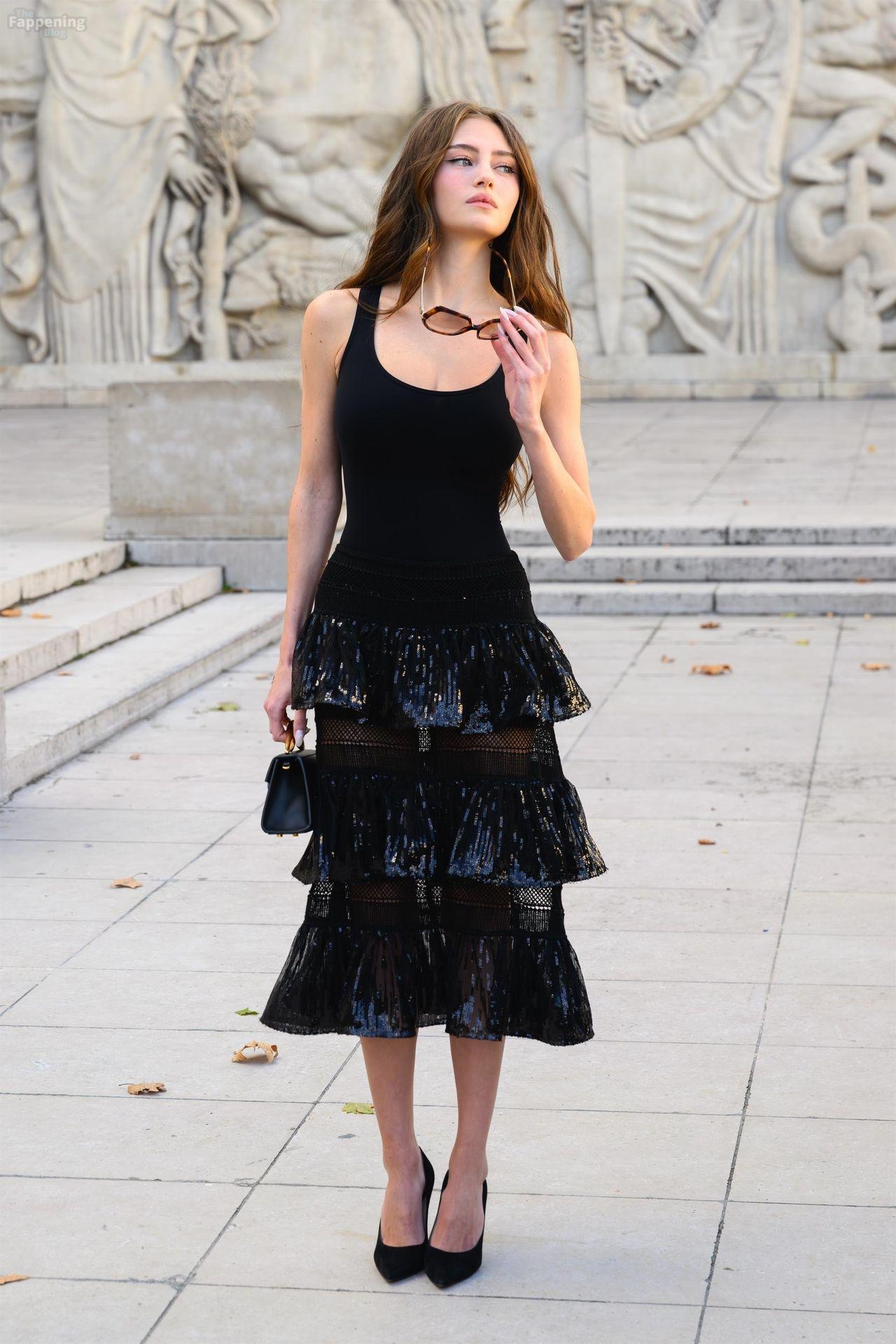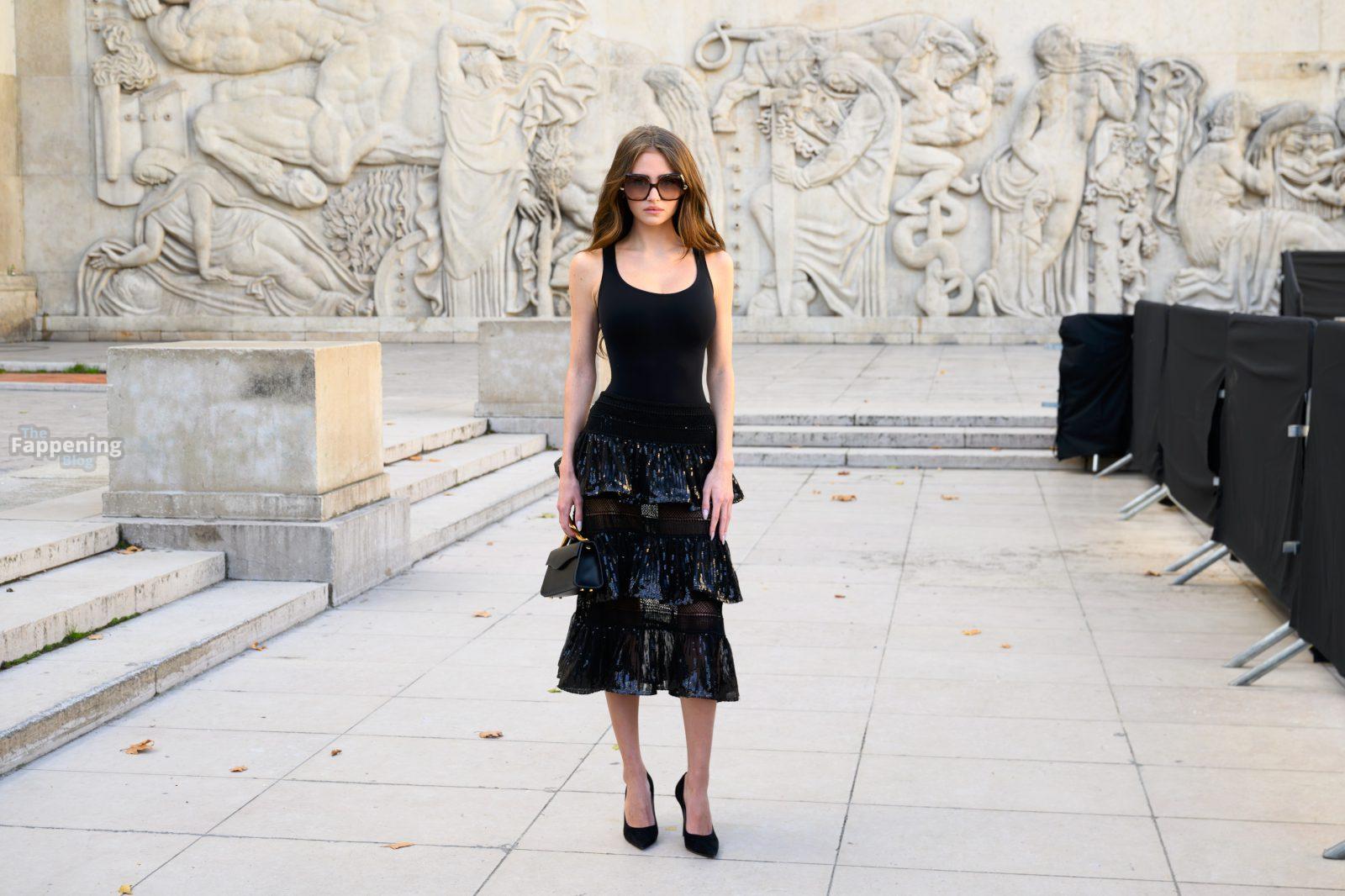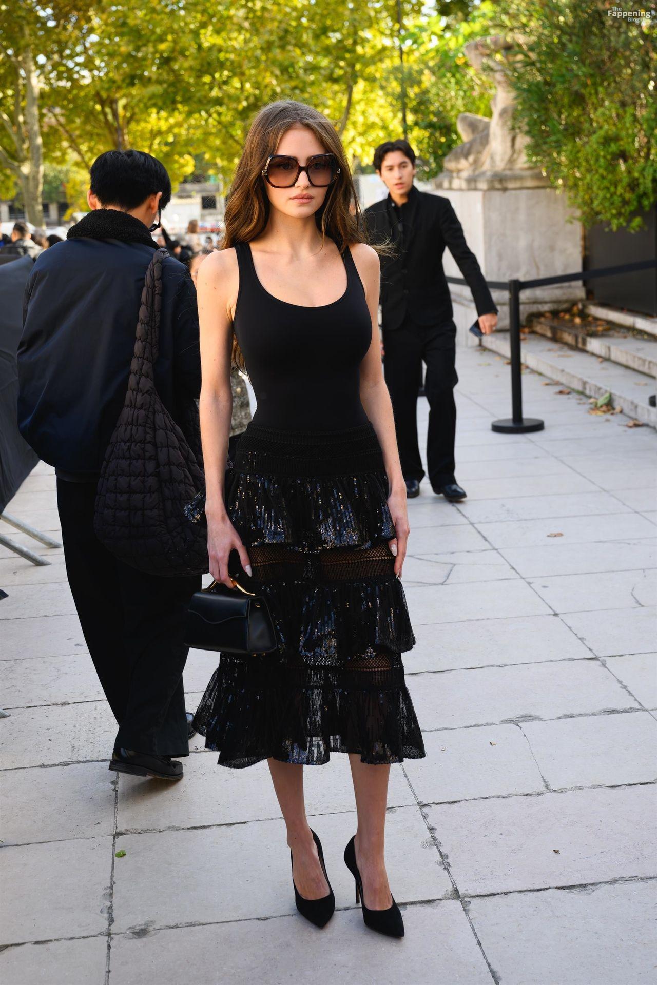 Leni Klum apareció en el desfile de ropa femenina primavera/verano 2026 de Elie Saab durante la Semana de la Moda de París. Lució un ajustado body negro y una falda transparente con lentejuelas, mostrando su escote y piernas.