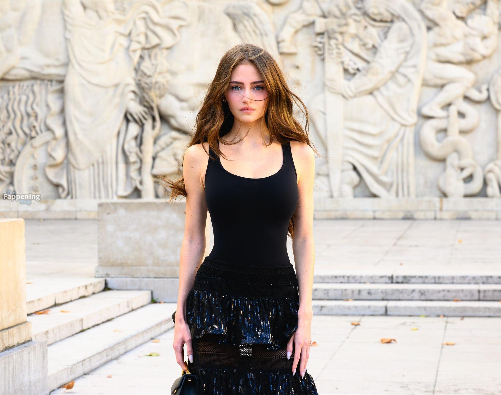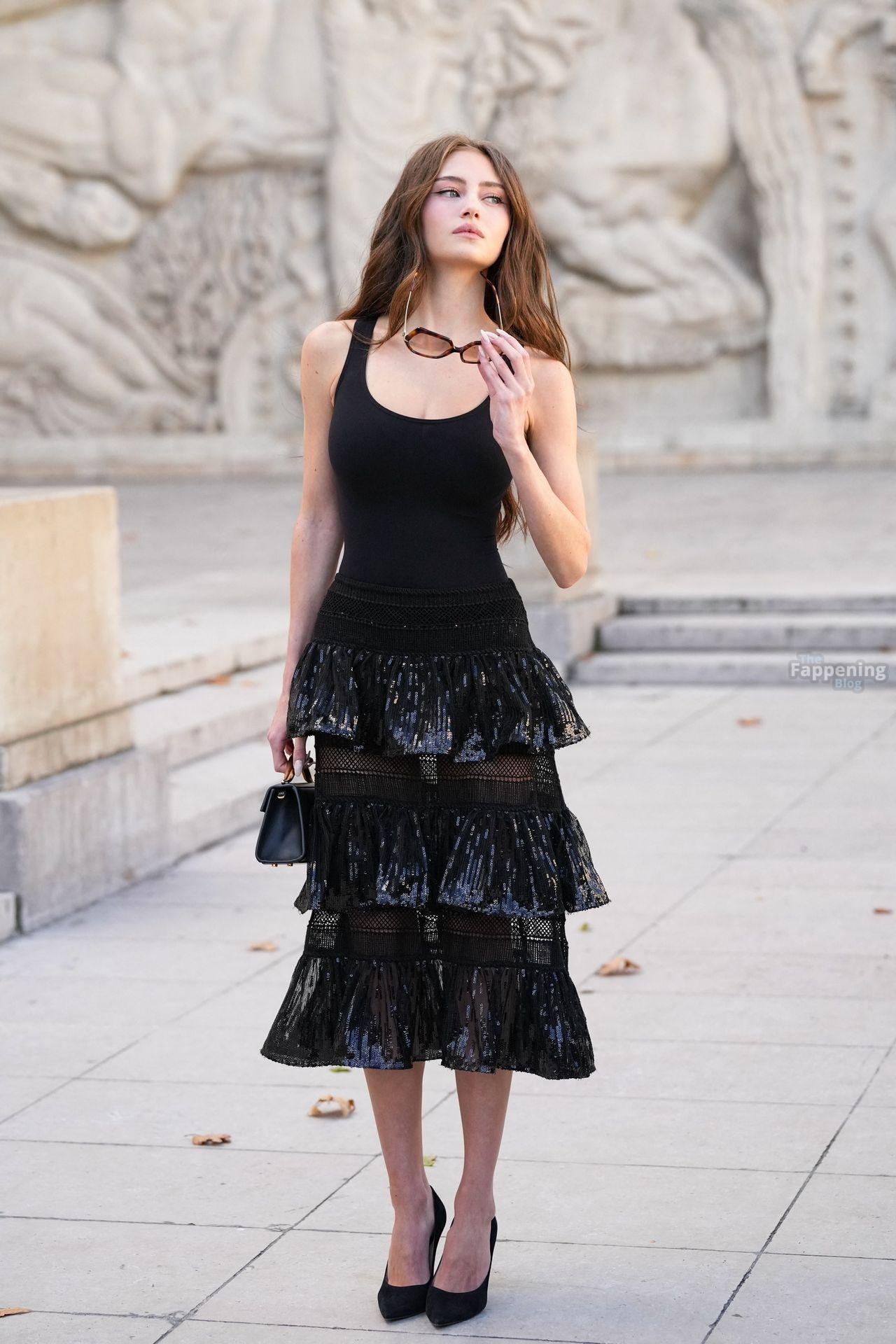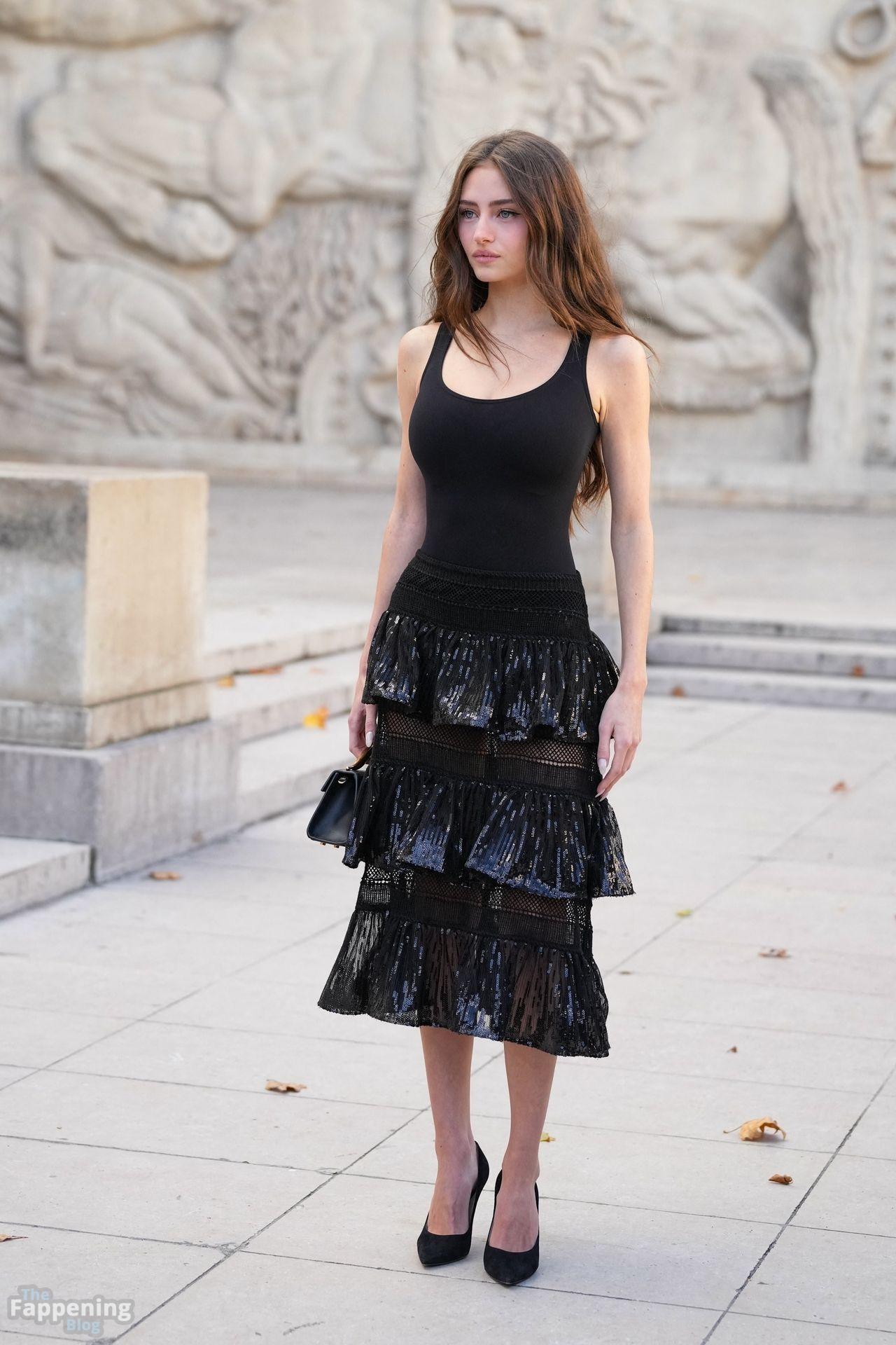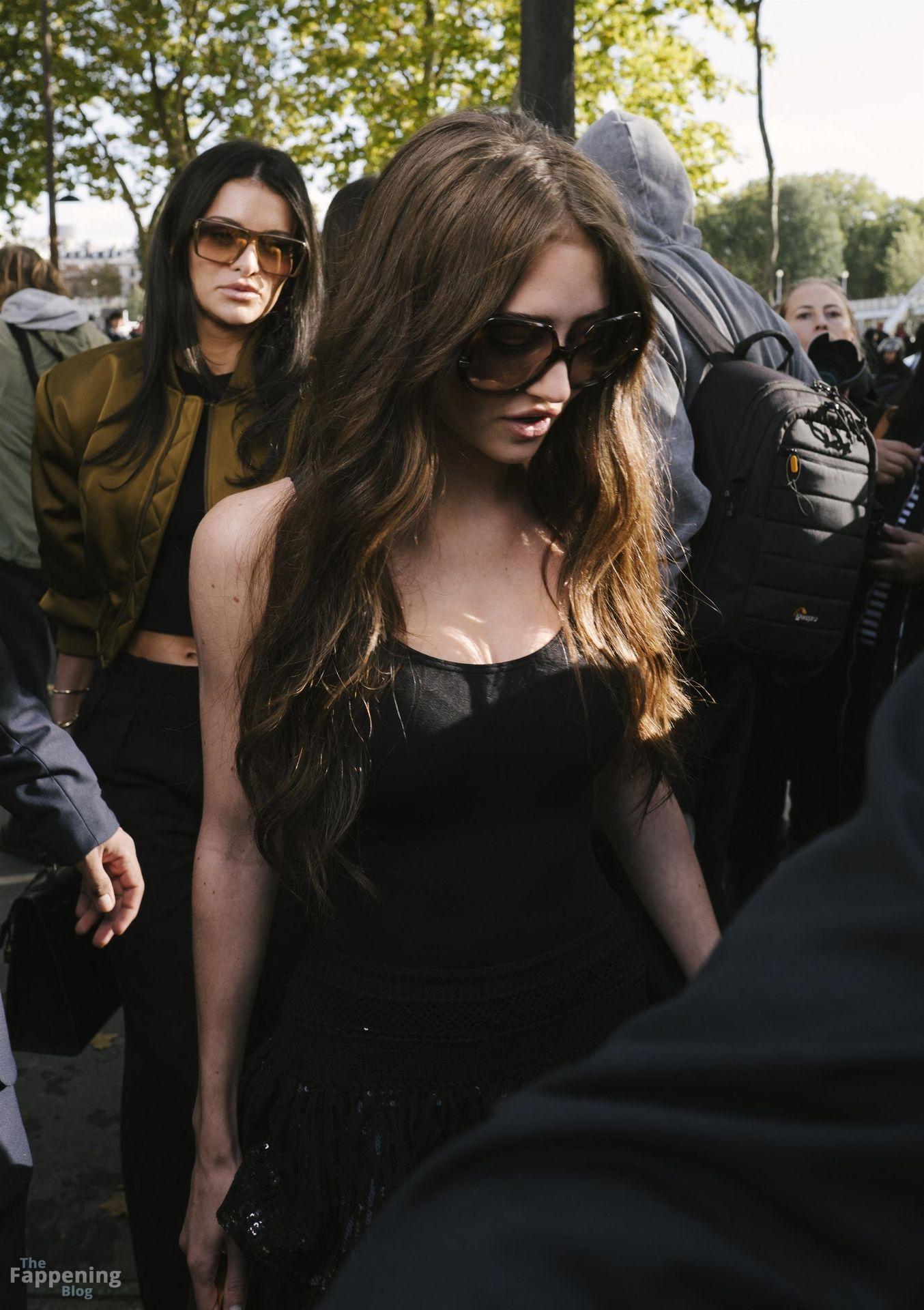 Leni Klum apareció en el desfile de ropa femenina primavera/verano 2026 de Elie Saab durante la Semana de la Moda de París. Lució un ajustado body negro y una falda transparente con lentejuelas, mostrando su escote y piernas.