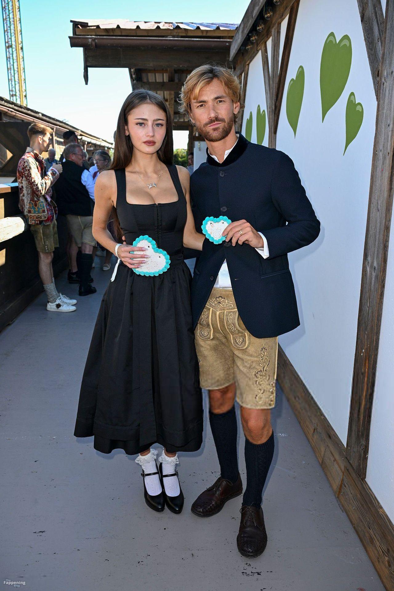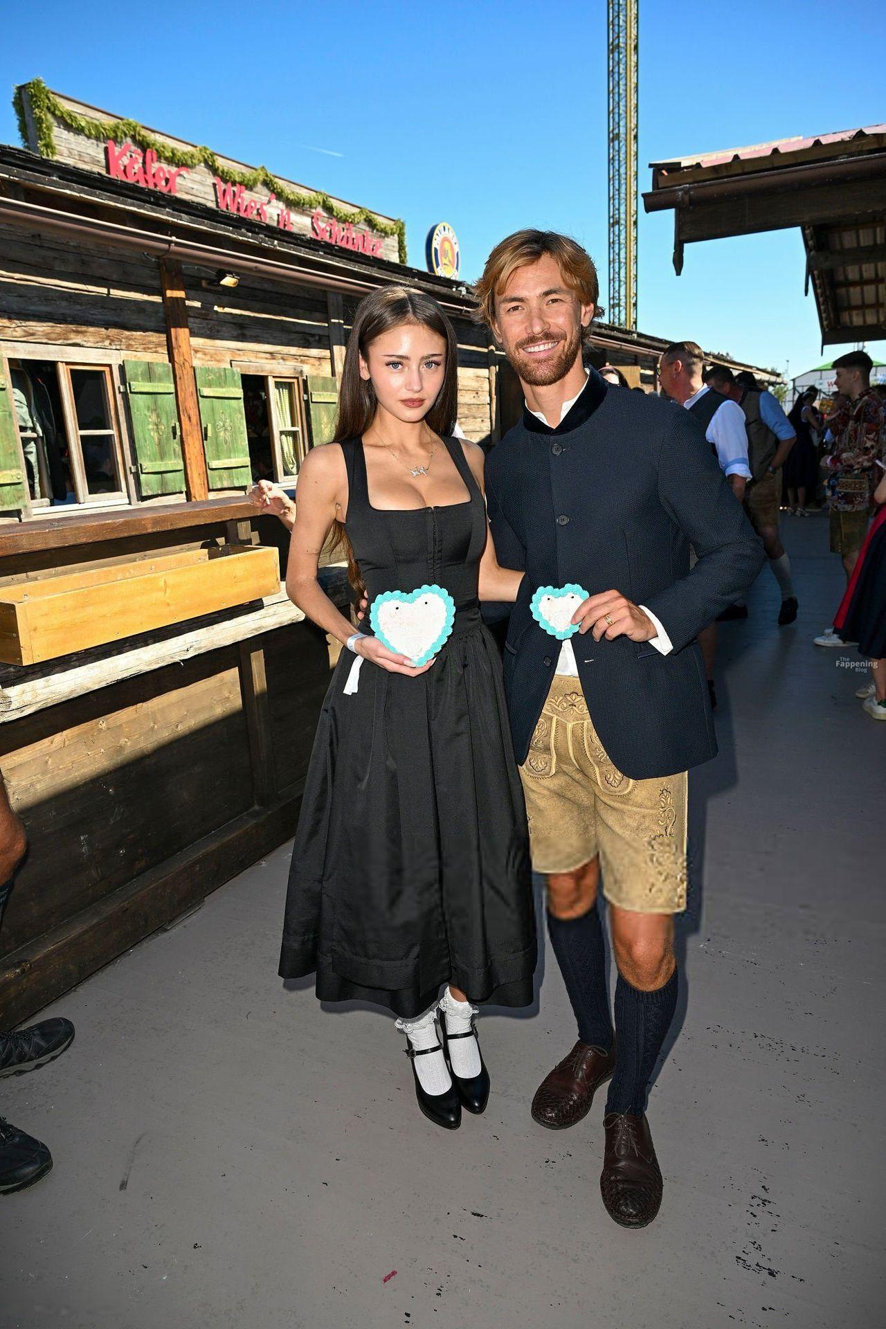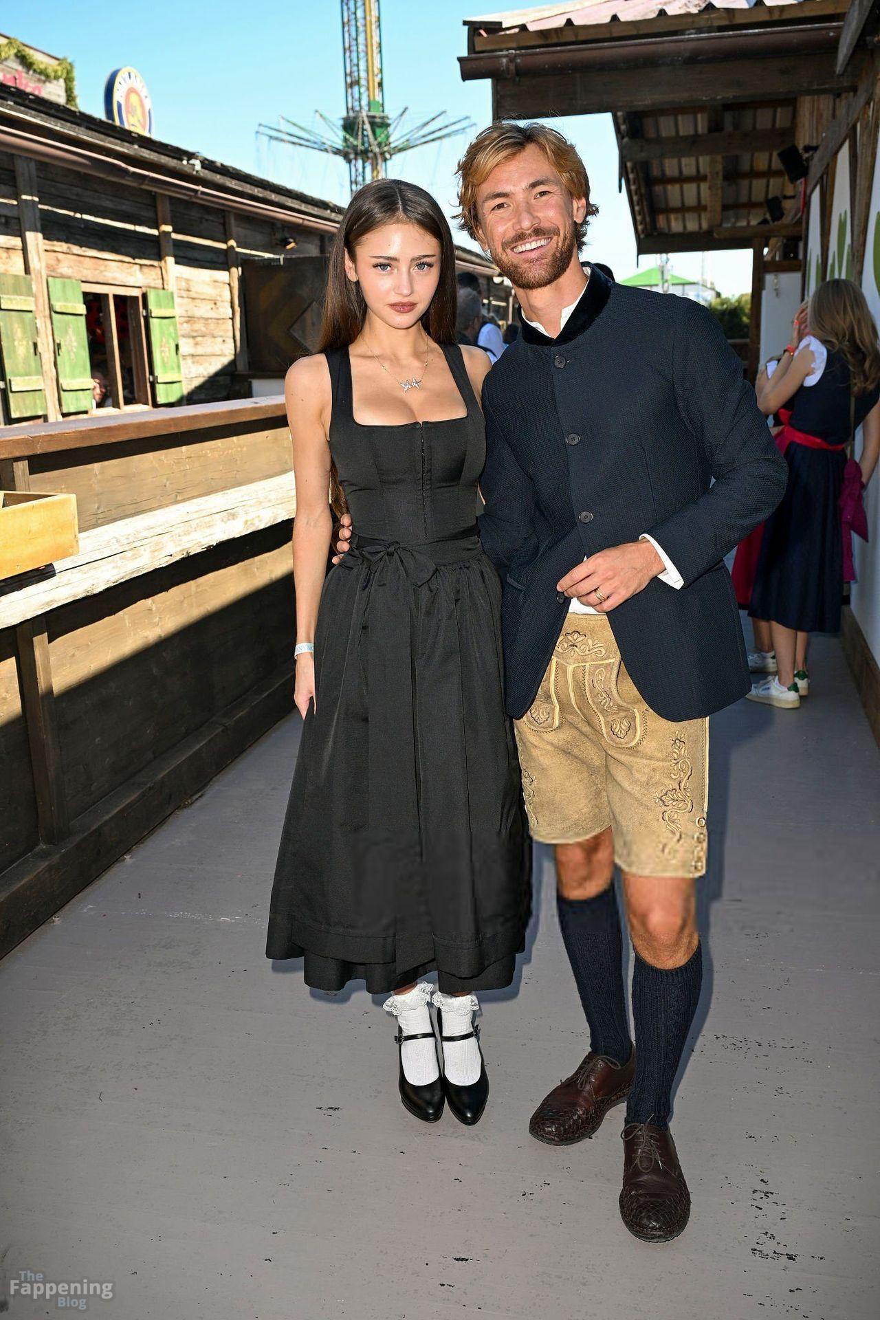 Leni Klum muestra sus pechos presionando contra un corsé dirndl ajustado en el evento Oktoberfest de Tiffany, poniendo su busto prominente en el centro de atención.