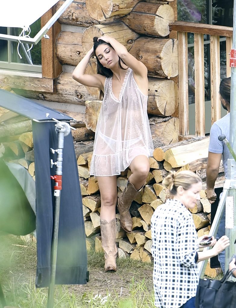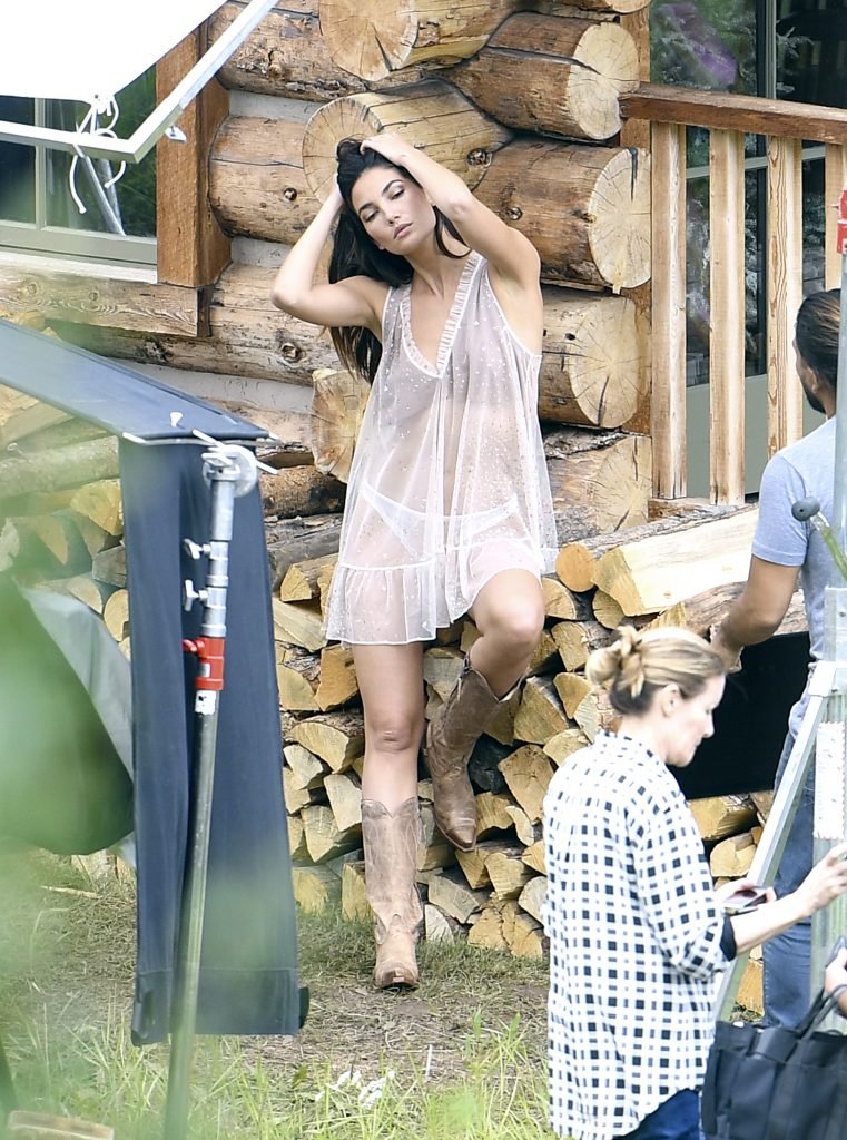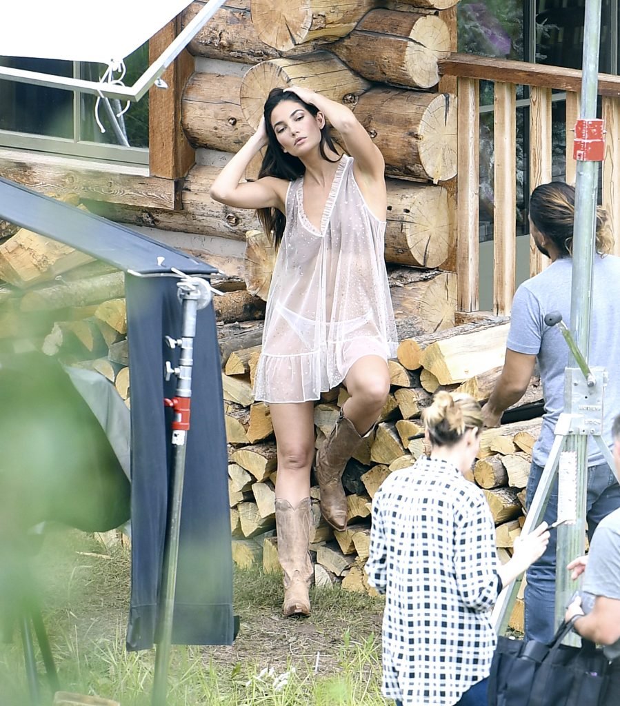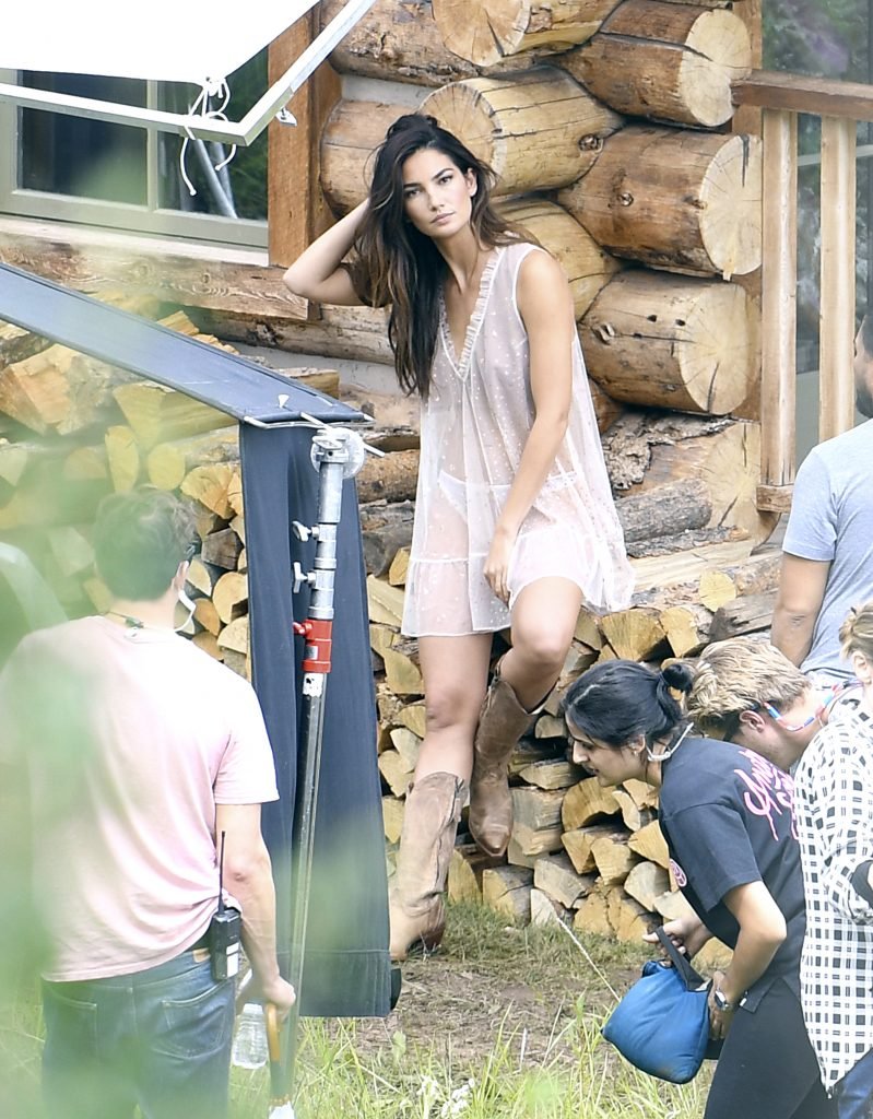 Model Lily Aldridge posa con pijamas sexys para el próximo catálogo navideño de Victoria’s Secret en Aspen, 13/08/2017.