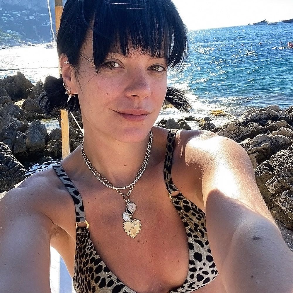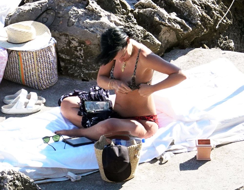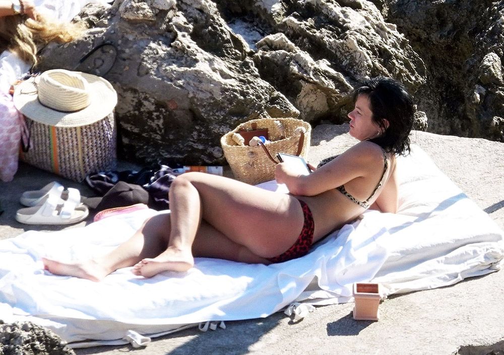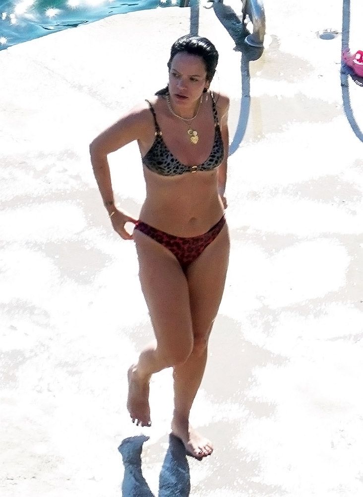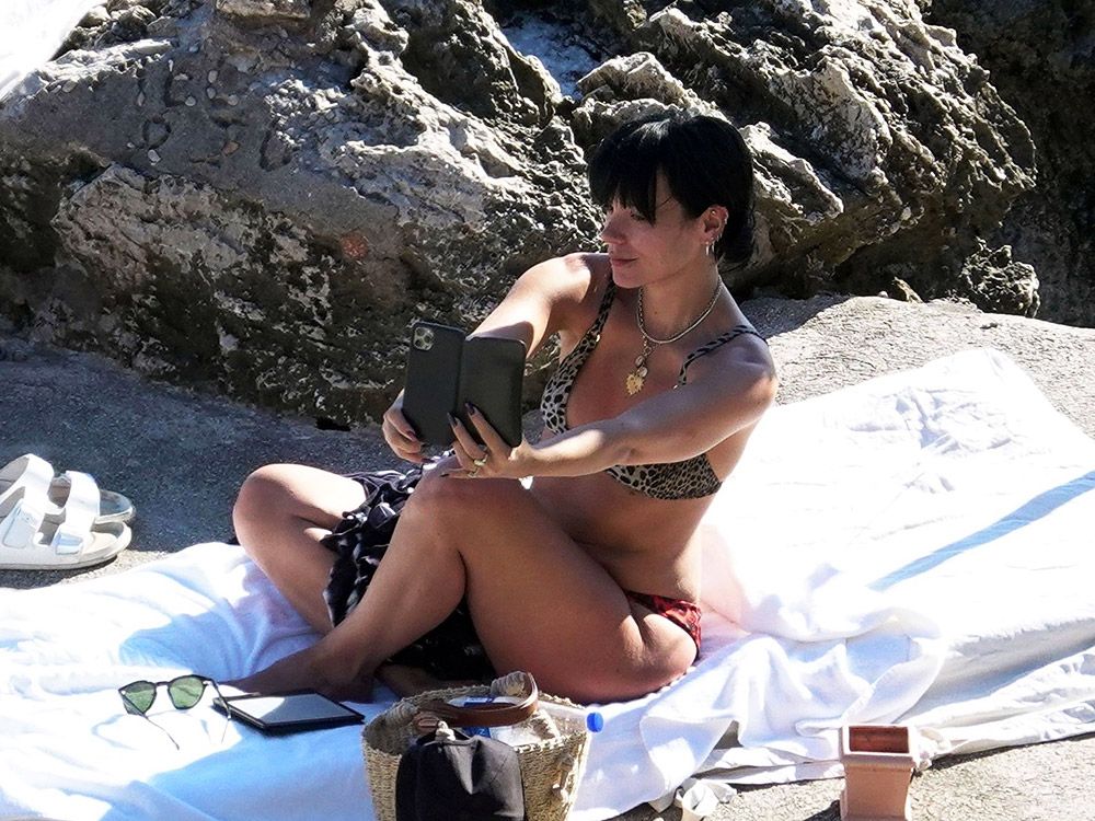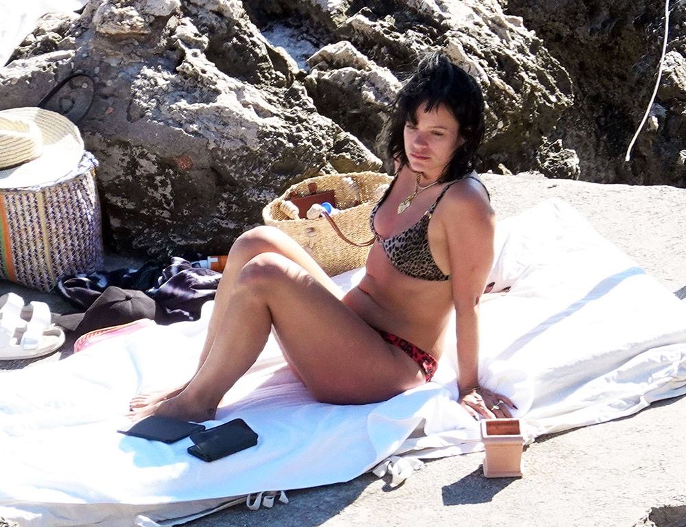 Lily Allen showed her boobs and hard nipples again! Now she is seen in Capri, wearing an animal print bikini. Lily looked like always, stoned and ugly. This July was waited for too long!