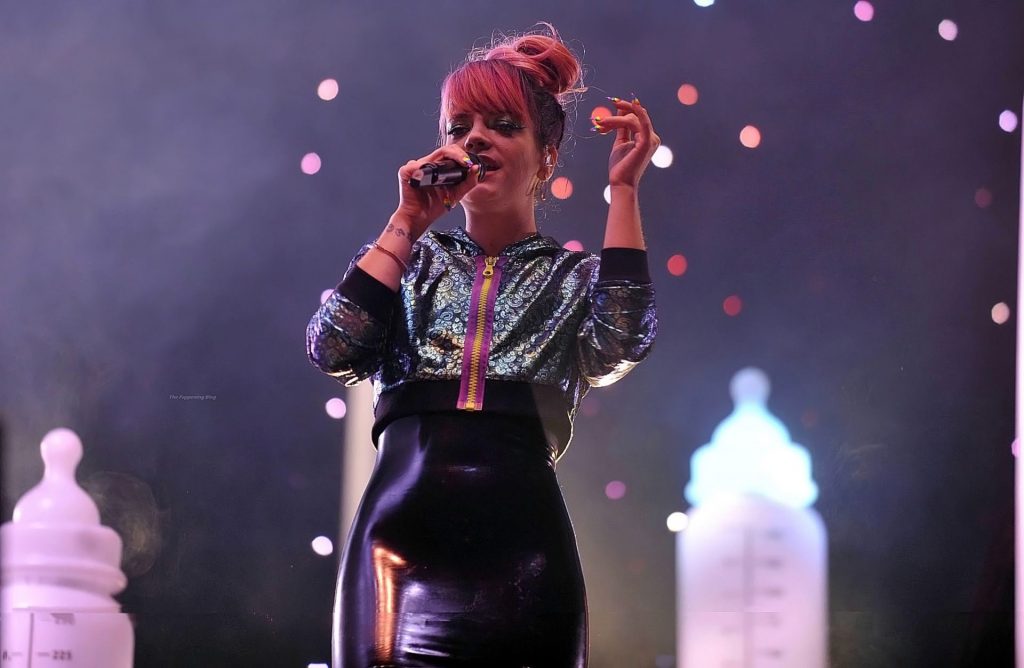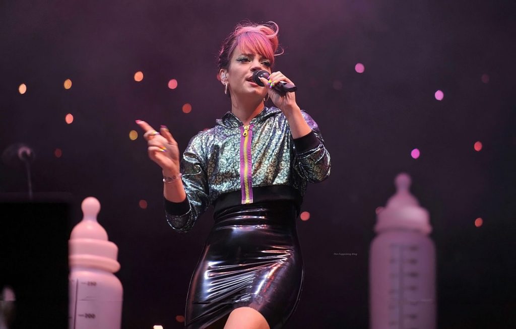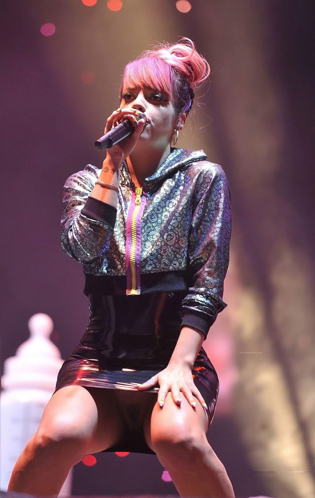 British pop singer Lily Allen flashes her pussy. She was wearing a rubber dress while performing on stage at the Hurricane Festival in Scheeßel, Germany. Attentive fans were able to get a double portion of pleasure during her performance. The celebrity showed her non-shaved vagina and added great pictures to her nude collection!