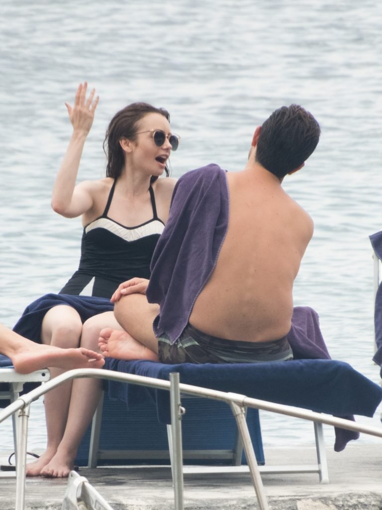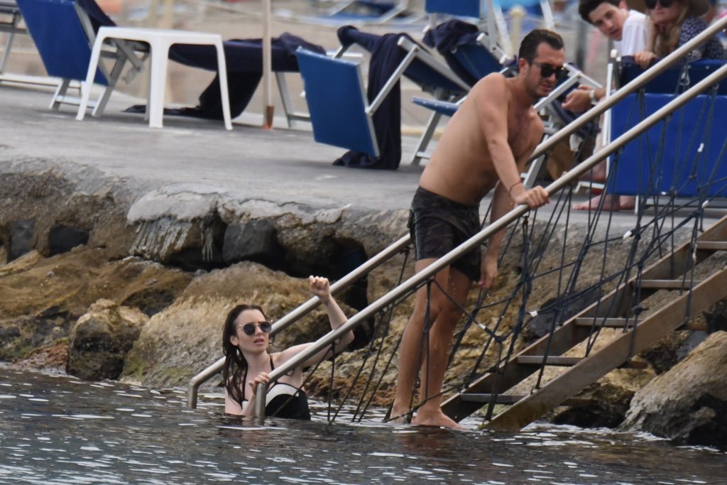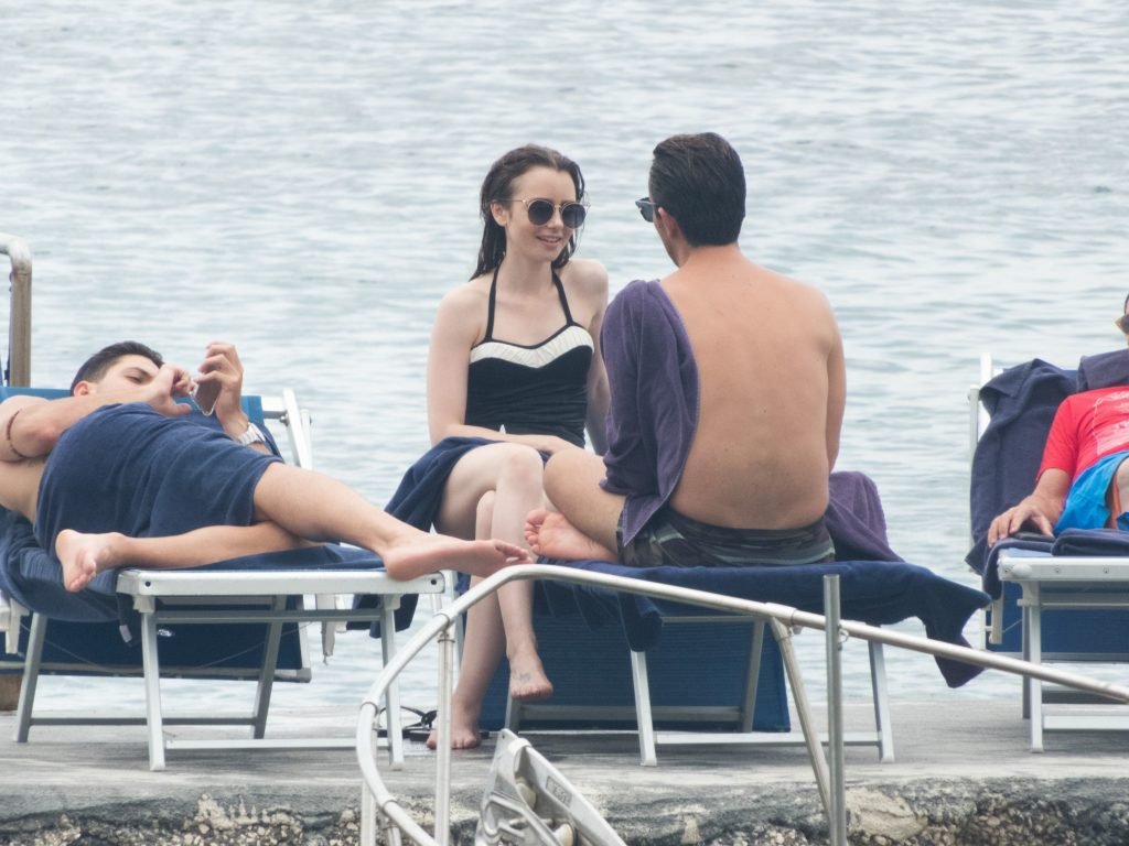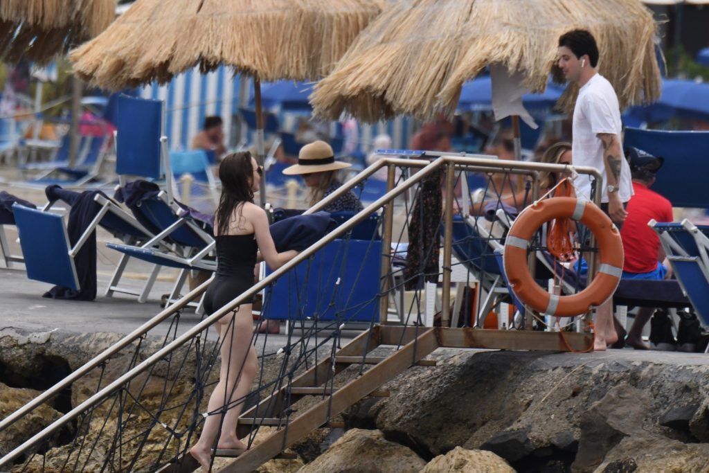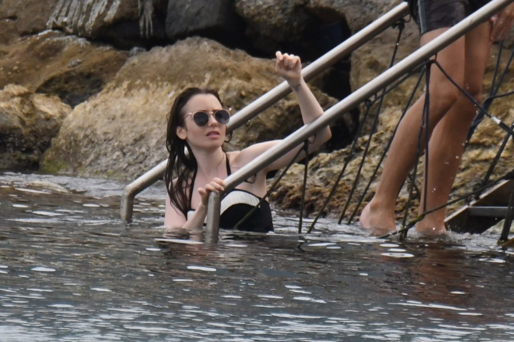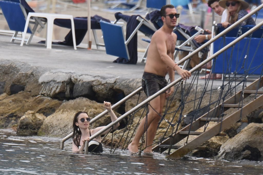 La actriz británico-estadounidense Lily Collins (29) fue vista con un traje de baño de una pieza negro mientras se zambullía en las aguas del hotel Albergo Della Regina Isabella en Ischia, Italia, 16/07/2018.