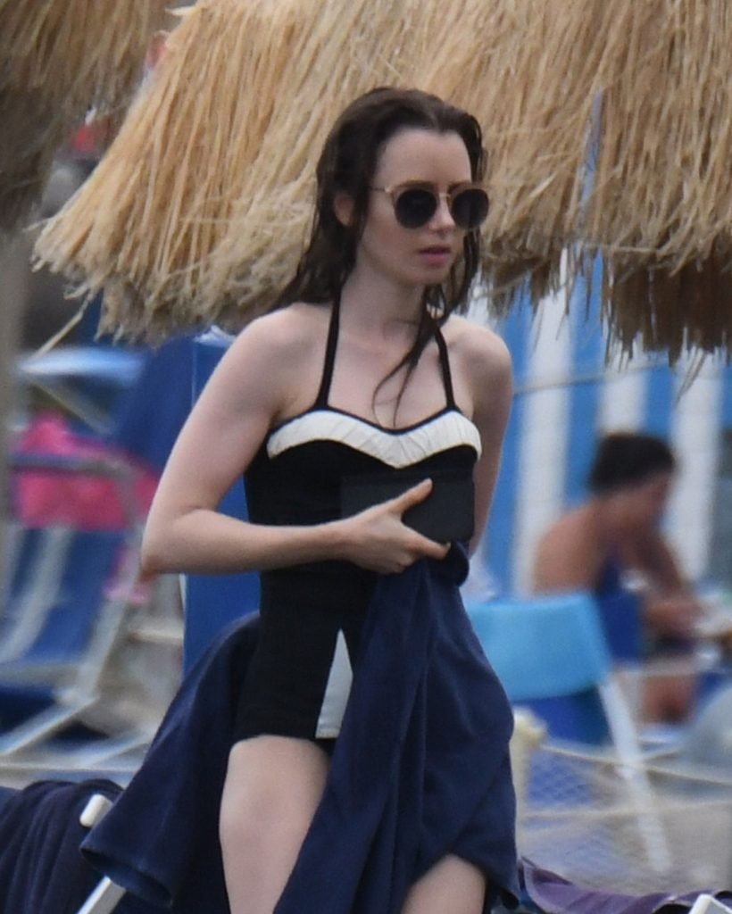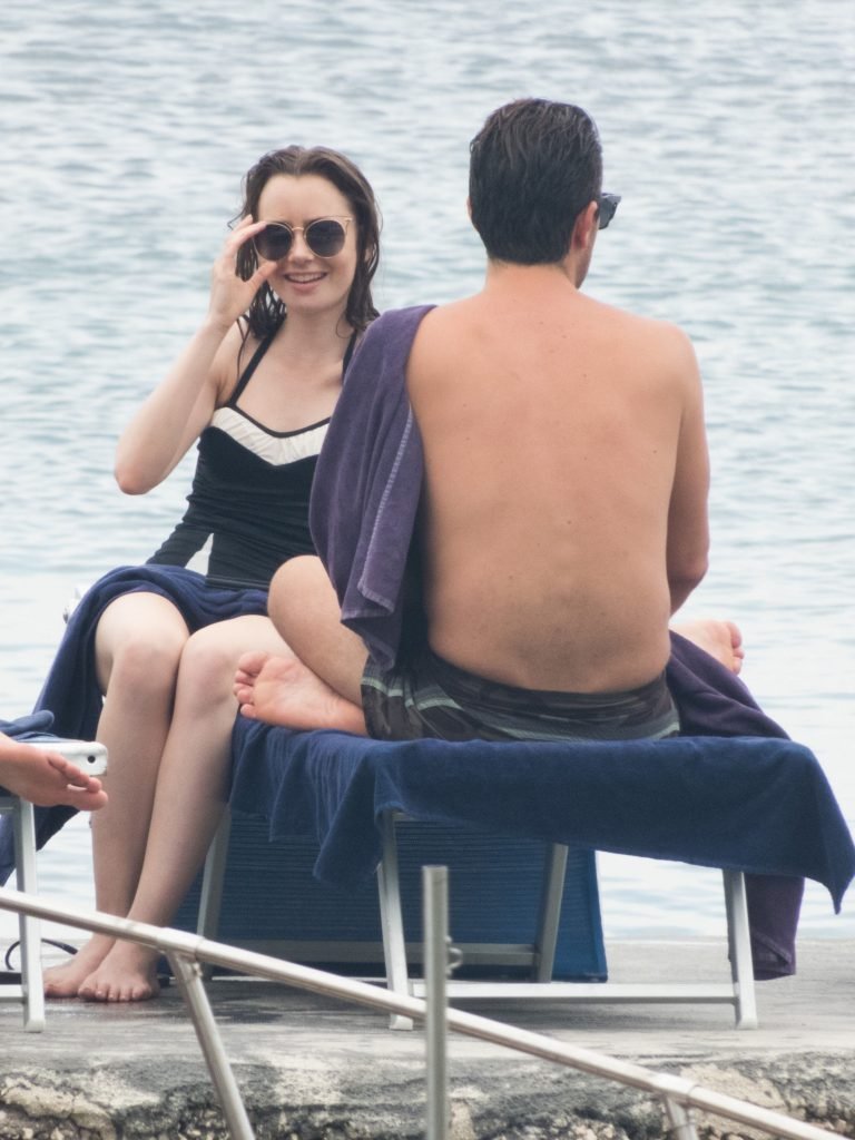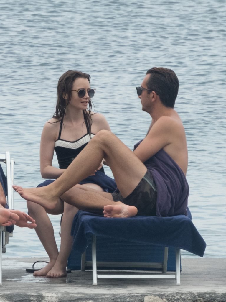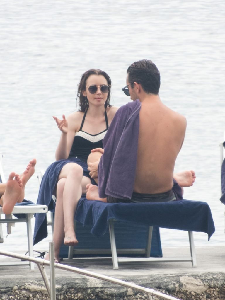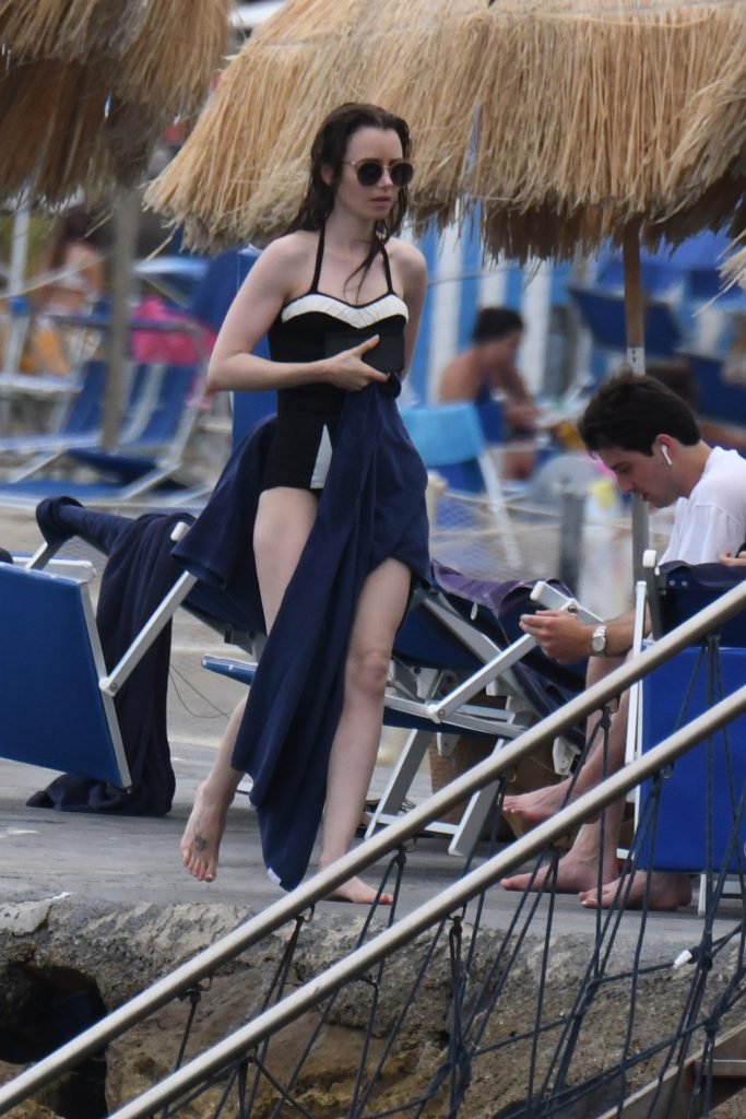 La actriz británico-estadounidense Lily Collins (29) fue vista con un traje de baño de una pieza negro mientras se zambullía en las aguas del hotel Albergo Della Regina Isabella en Ischia, Italia, 16/07/2018.