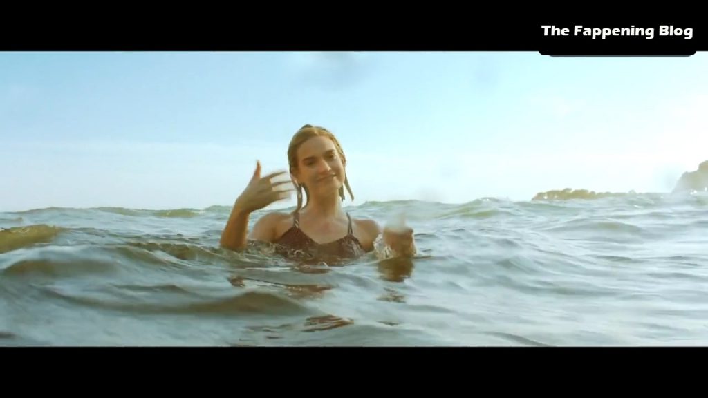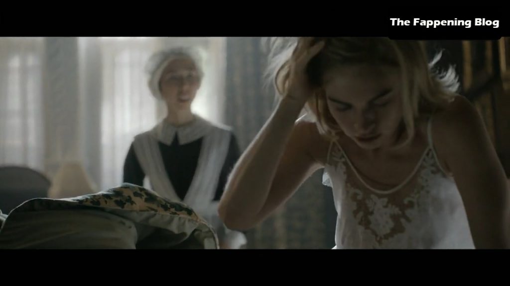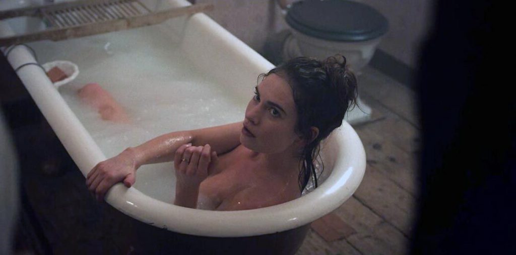 The next and last scene is from the ‘The Dig’ movie. Lily James is taking a bath when she is distracted by a man who opens the bathroom door slightly, causing Lily to turn and nearly expose her breasts above the water when she stares at the man. As she meets the man and lowers the dress from her shoulders, she appears from the bathroom wearing a robe, revealing her side boob and bareback. He then walks away, and she puts on her robe again, showing a few pokey nipples as she sits on a bed.