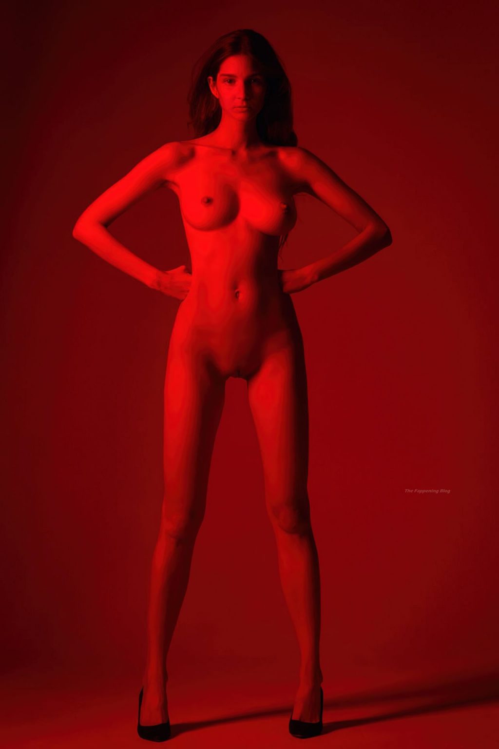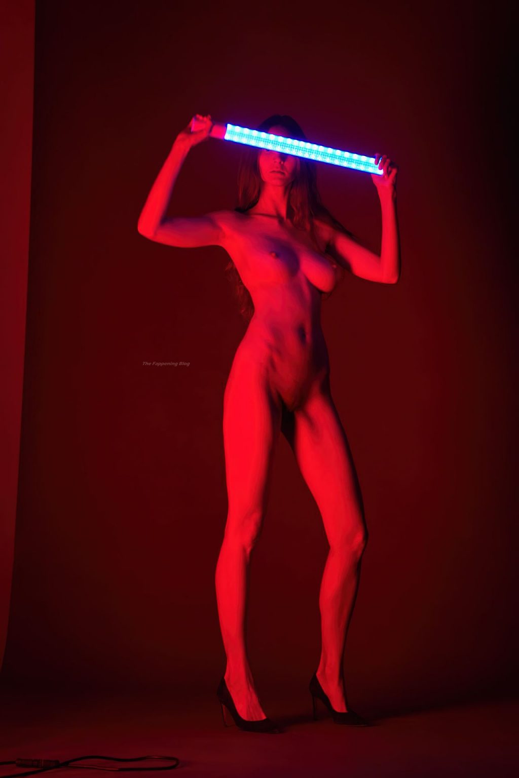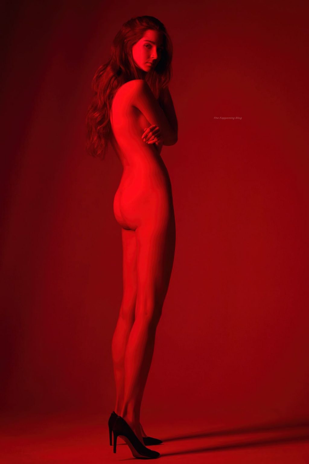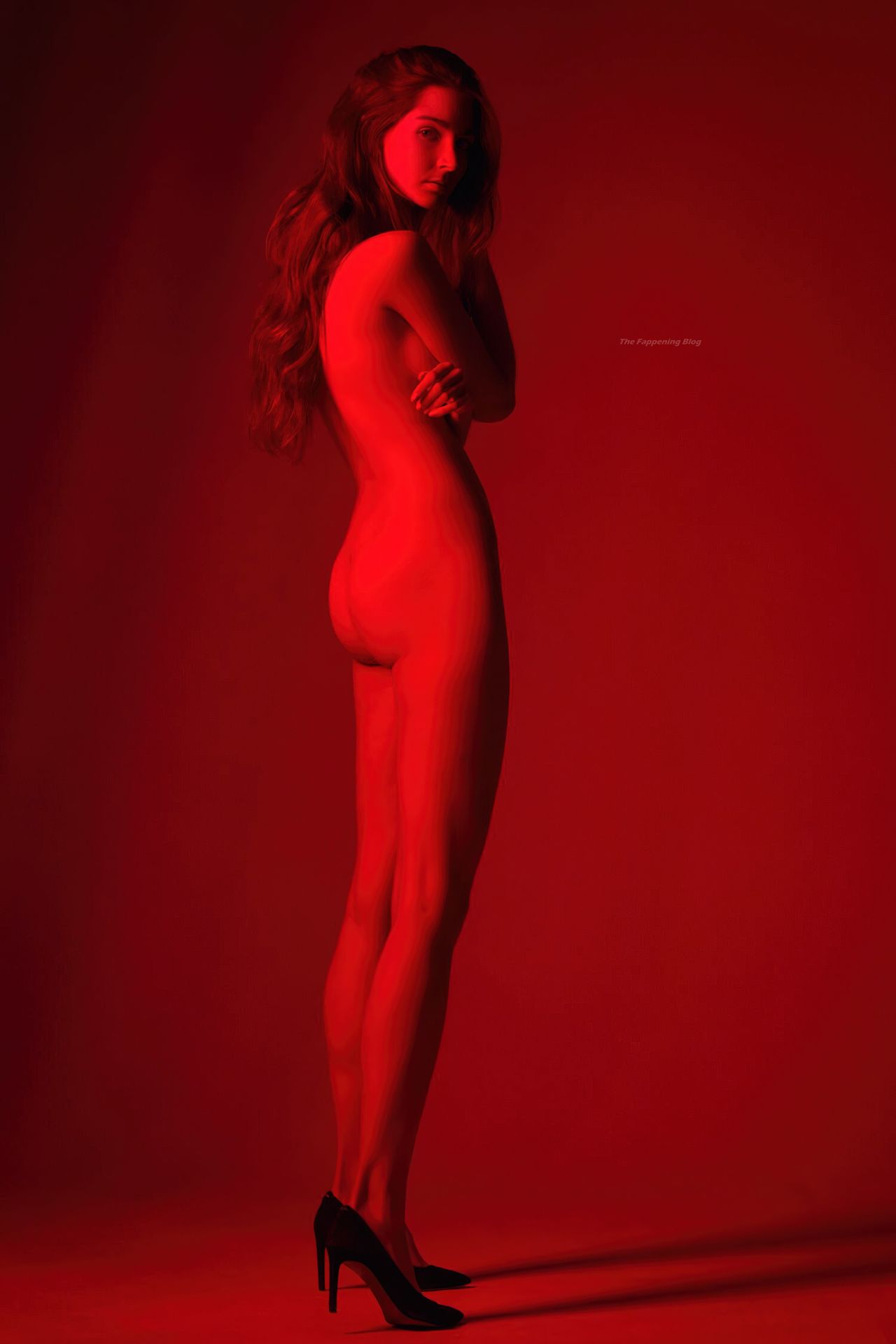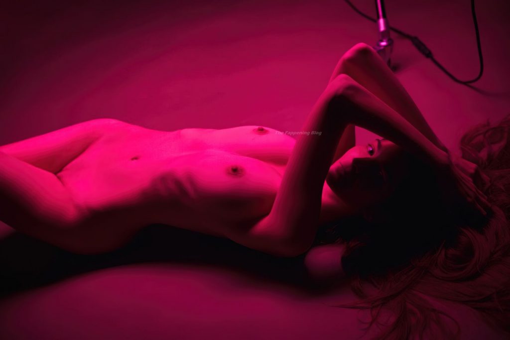 Hermosa modelo Lina Lorenza (Aschermann) posa completamente desnuda, mostrando su impresionante cuerpo desnudo en colores rojo y púrpura en una sesión fotográfica de Francesco Rizzato (2020).