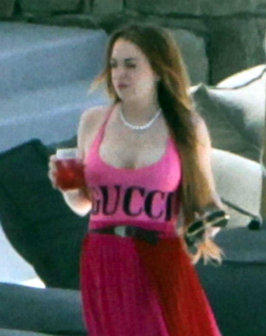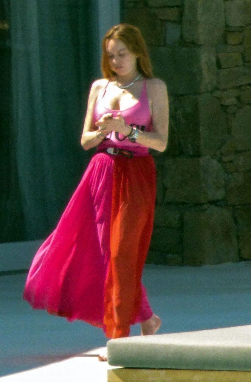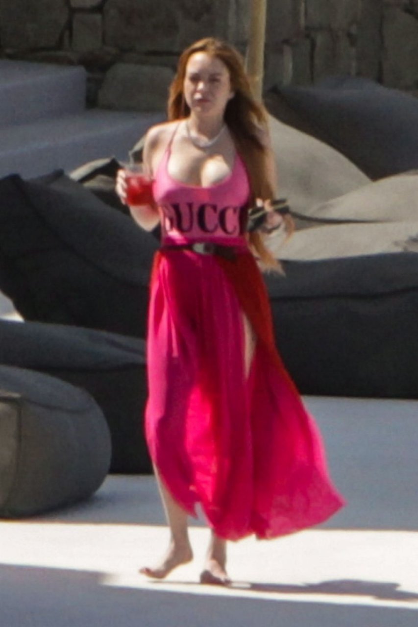 Lindsay Lohan vista con un traje de baño rosa de GUCCI en la isla de Mykonos, Grecia, 22/06/2019. Se informó esta semana que MTV ha cancelado el reality show Lindsay Lohan’s Beach Club.