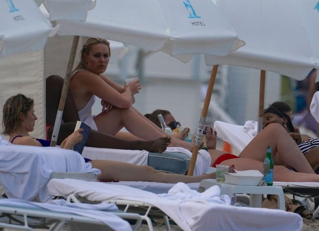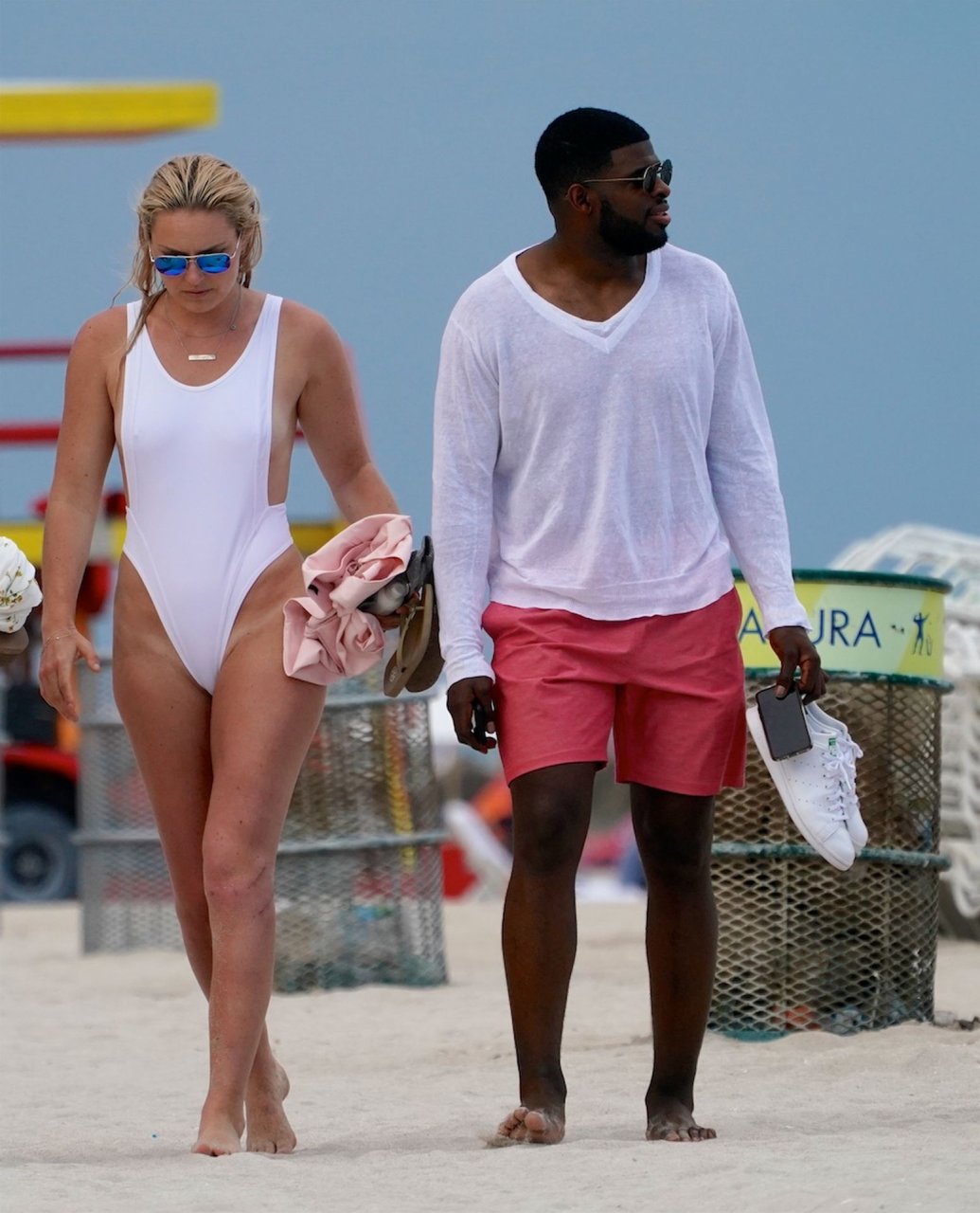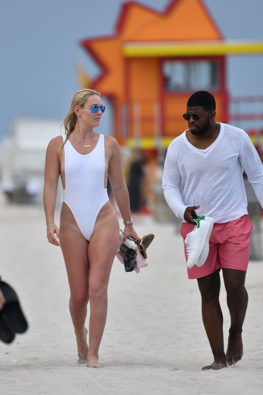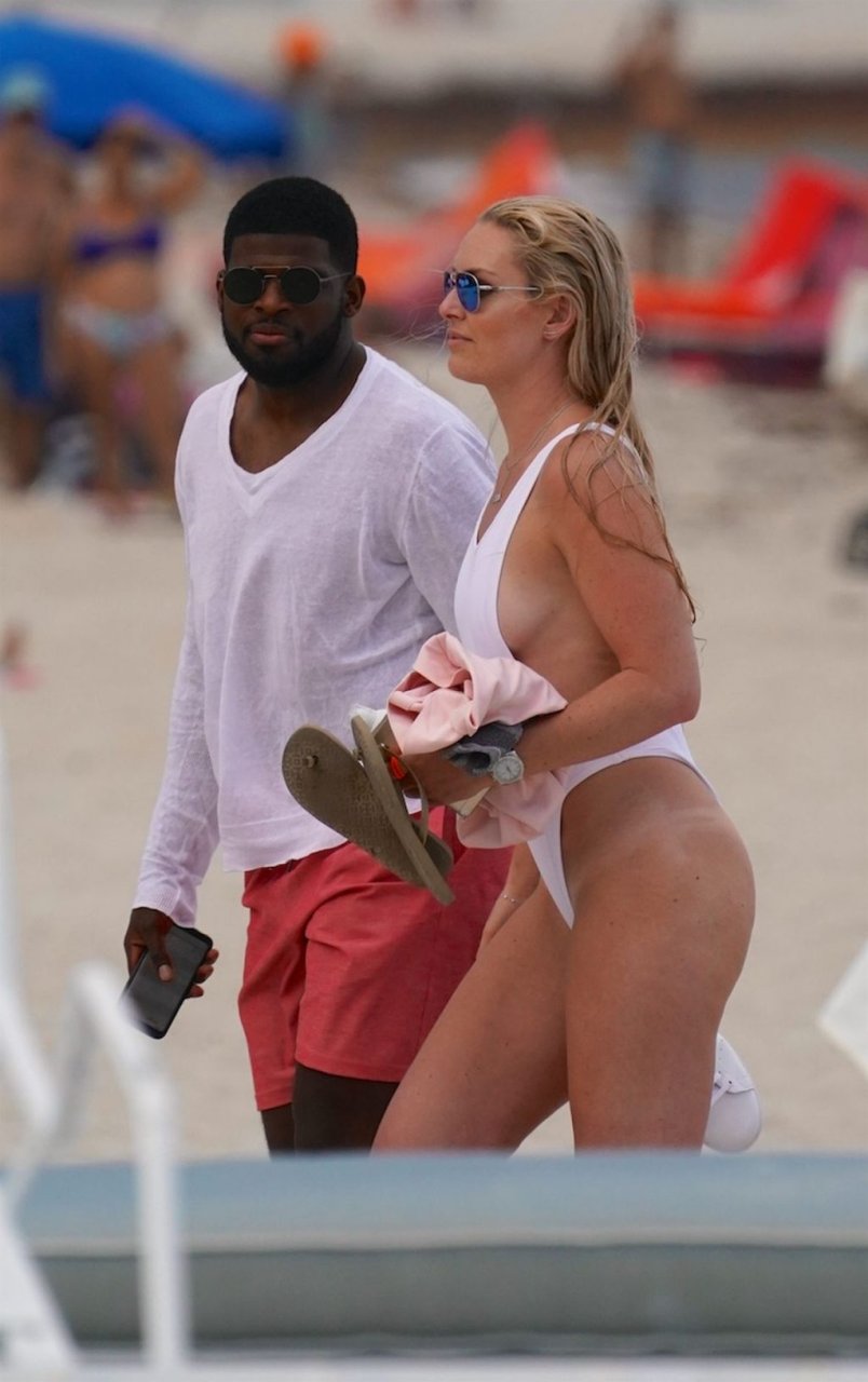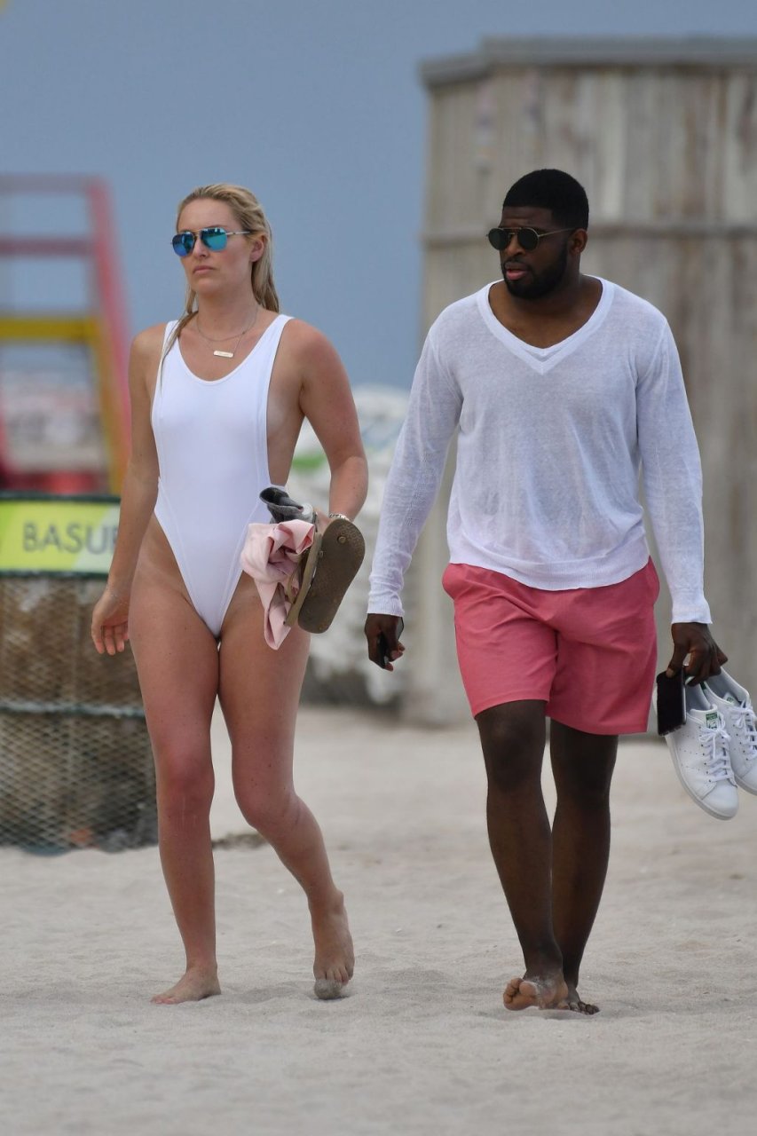 Lindsey Vonn muestra su figura atlética en un muy sexy traje de baño blanco de una pieza mientras pasea con su novio P.K. Subban y un amigo en la playa de Miami, 04/05/2019.