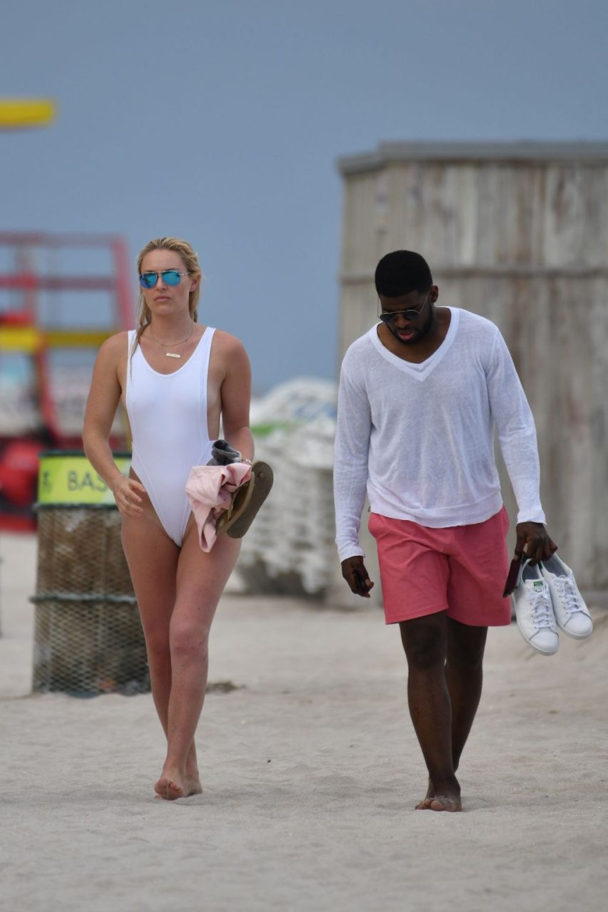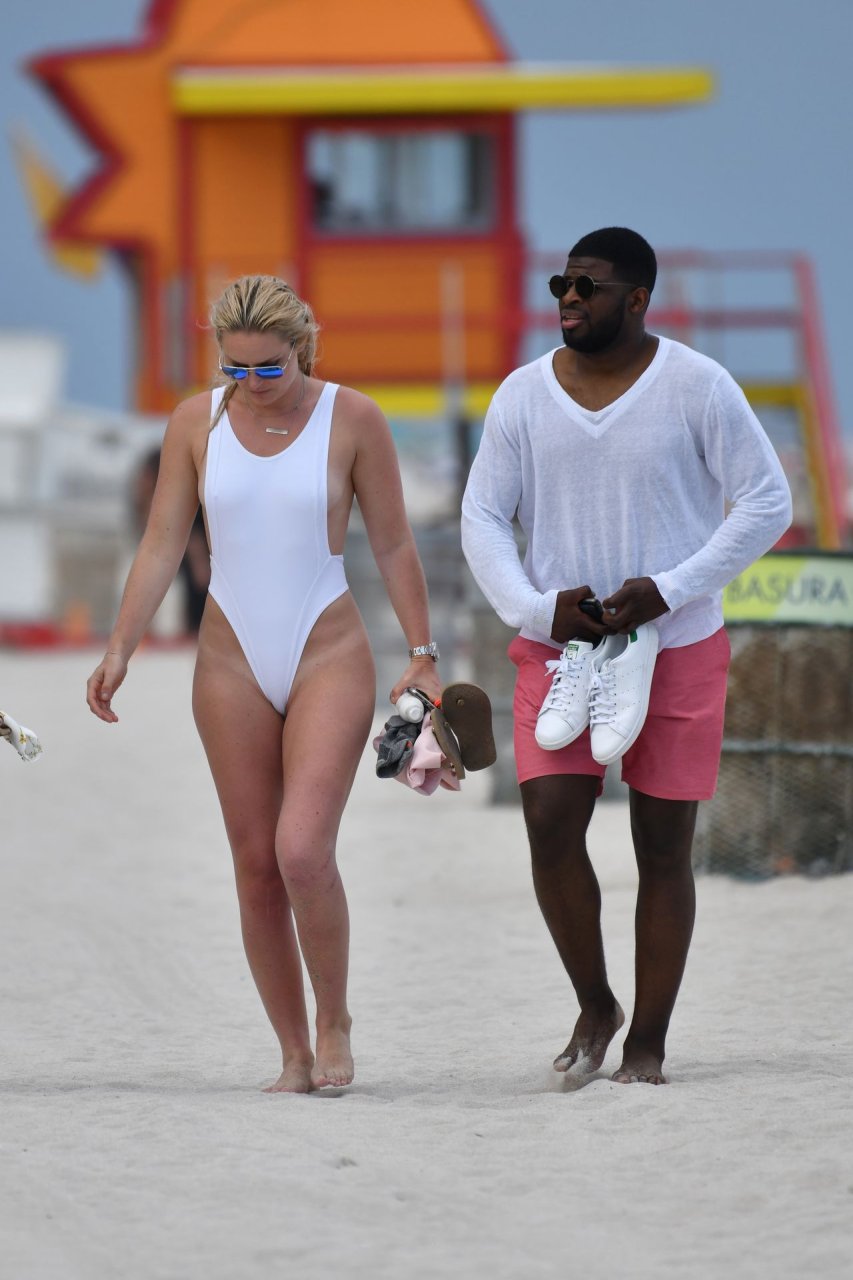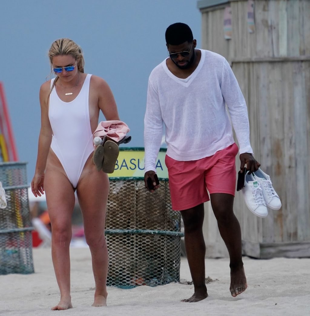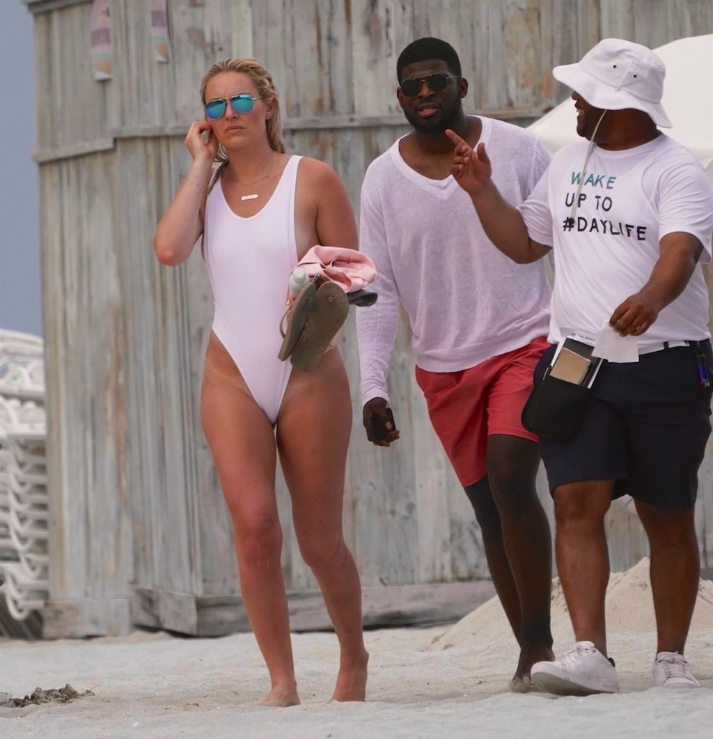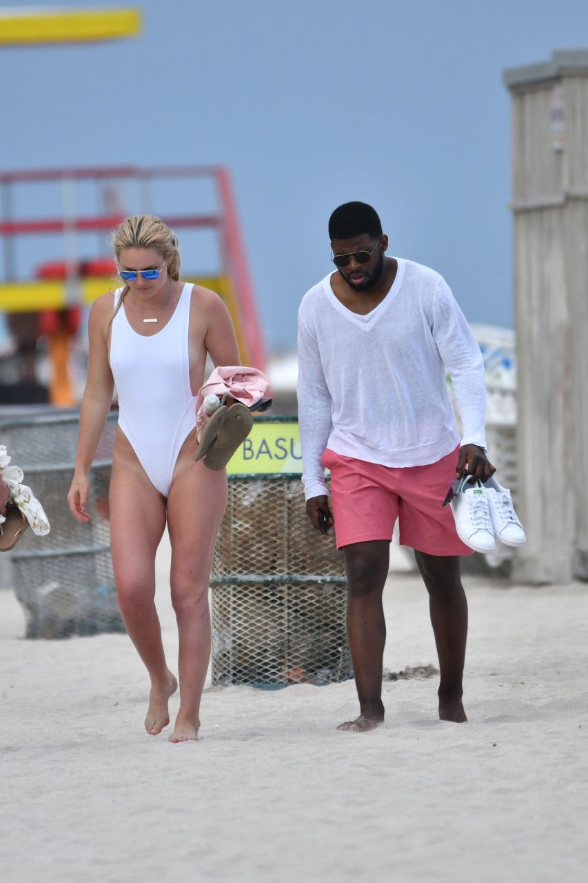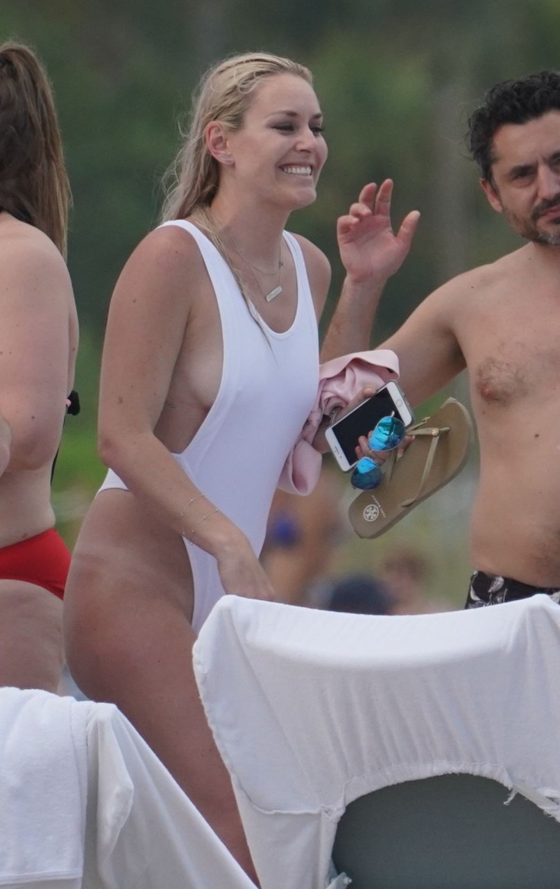 Lindsey Vonn muestra su figura atlética en un muy sexy traje de baño blanco de una pieza mientras pasea con su novio P.K. Subban y un amigo en la playa de Miami, 04/05/2019.