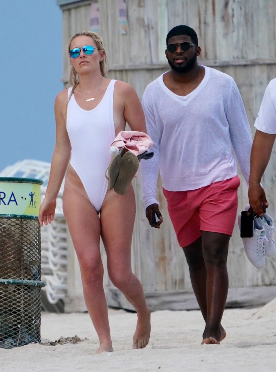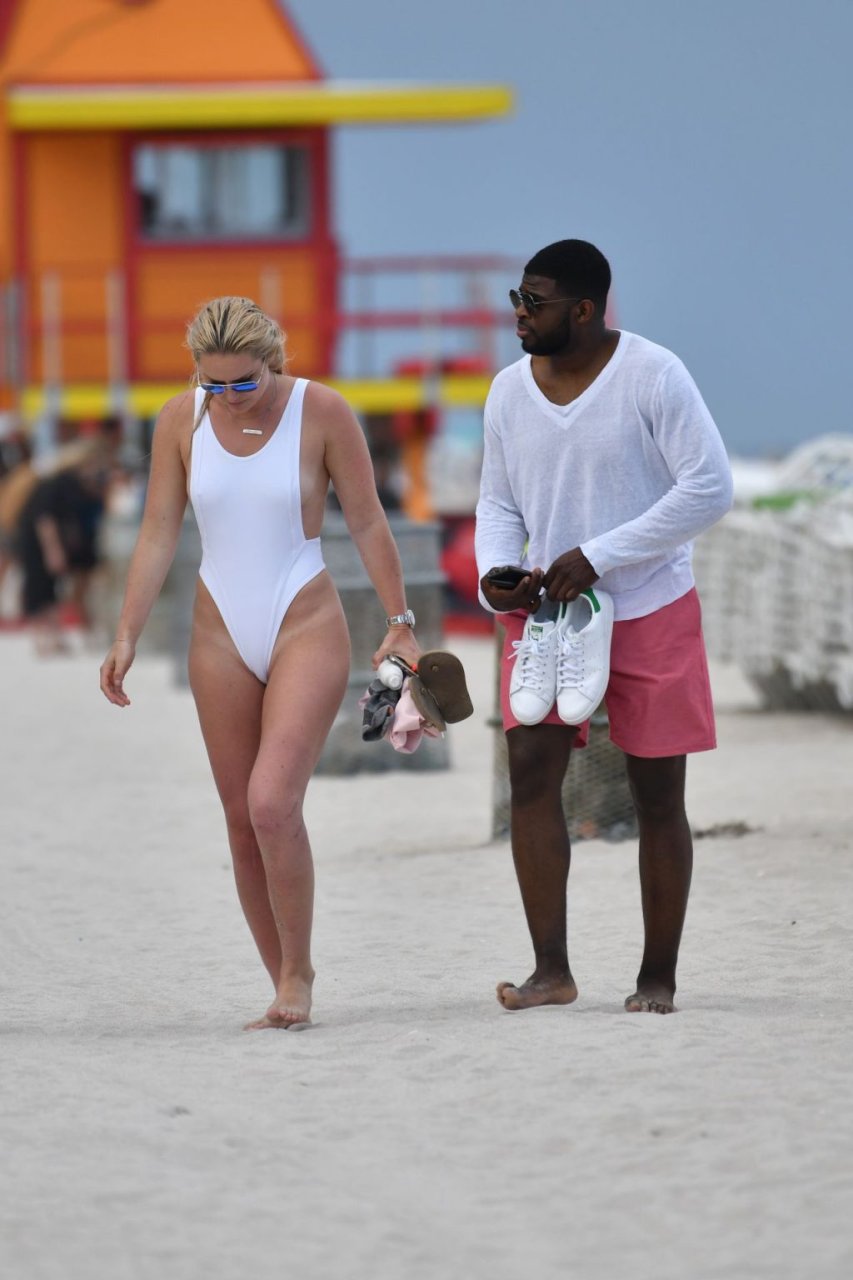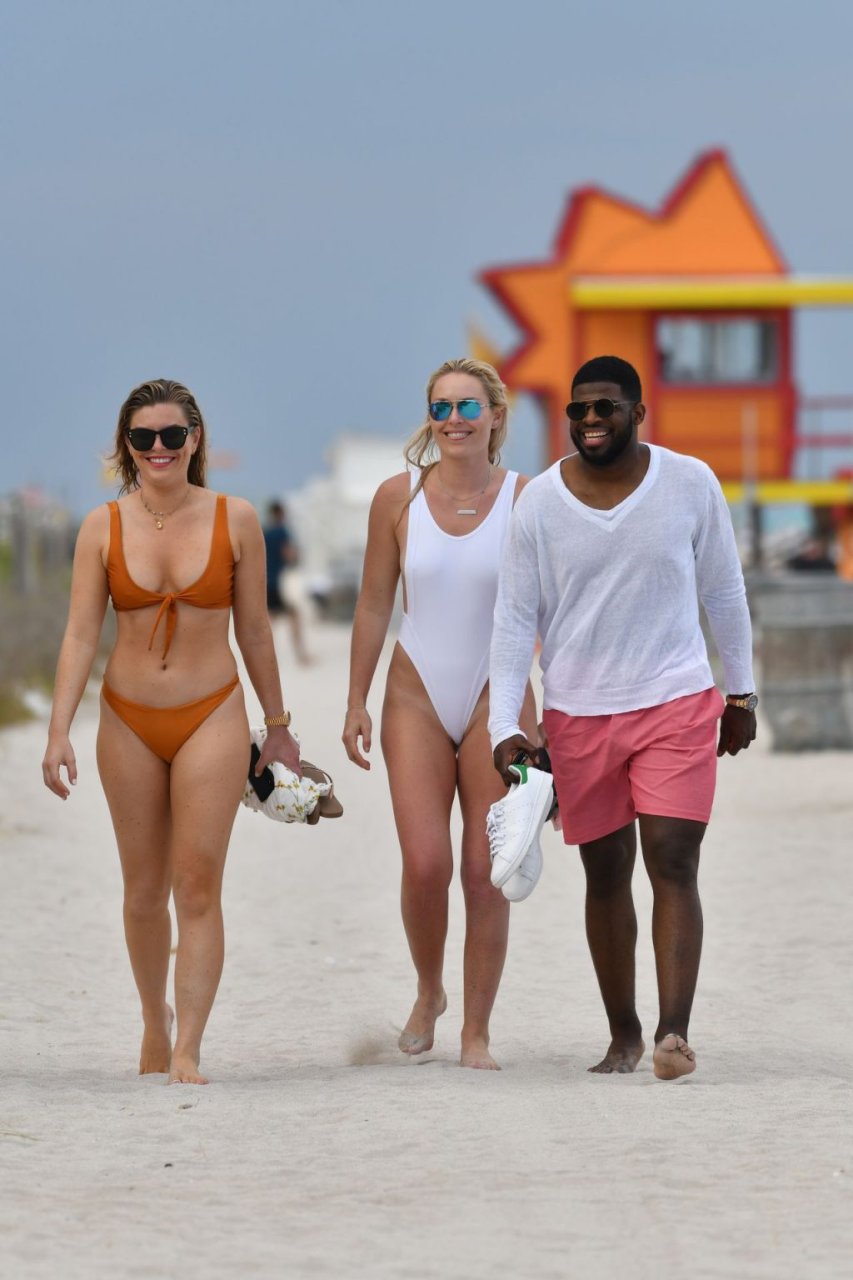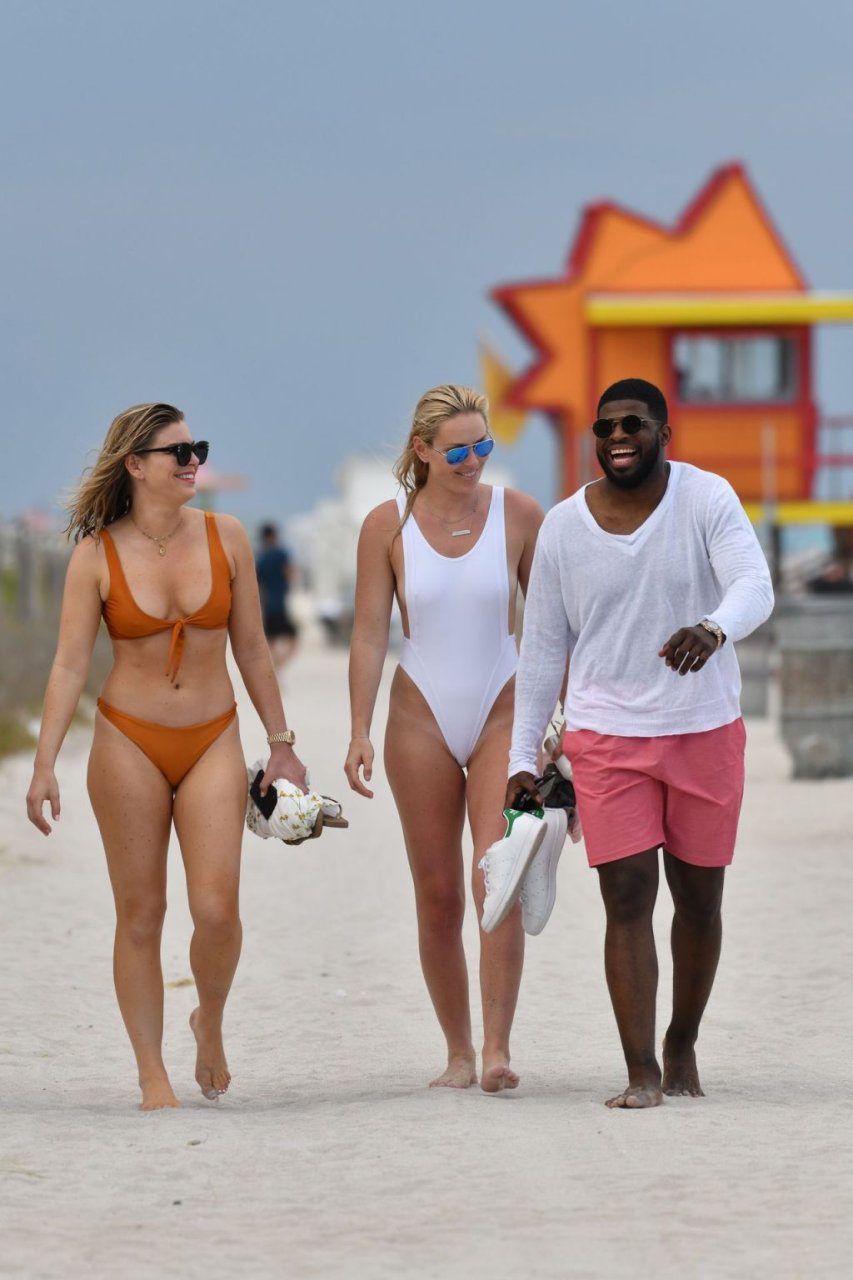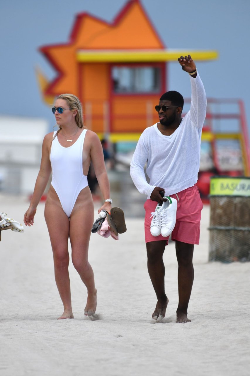 Lindsey Vonn muestra su figura atlética en un muy sexy traje de baño blanco de una pieza mientras pasea con su novio P.K. Subban y un amigo en la playa de Miami, 04/05/2019.