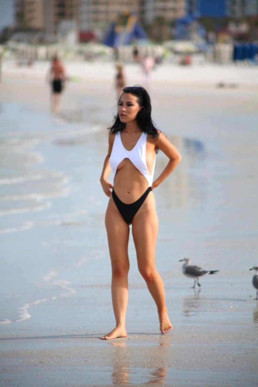 Ex reina de belleza convertida en diseñadora de bikinis y bloguera de moda, Lisa Opie sorprendió a los visitantes de la playa con su traje de baño de una sola pieza casi inexistente. La estrella tonificada se tomó muchas selfies mientras disfrutaba del sol y las olas en la playa en Miami, 11/09/2018.