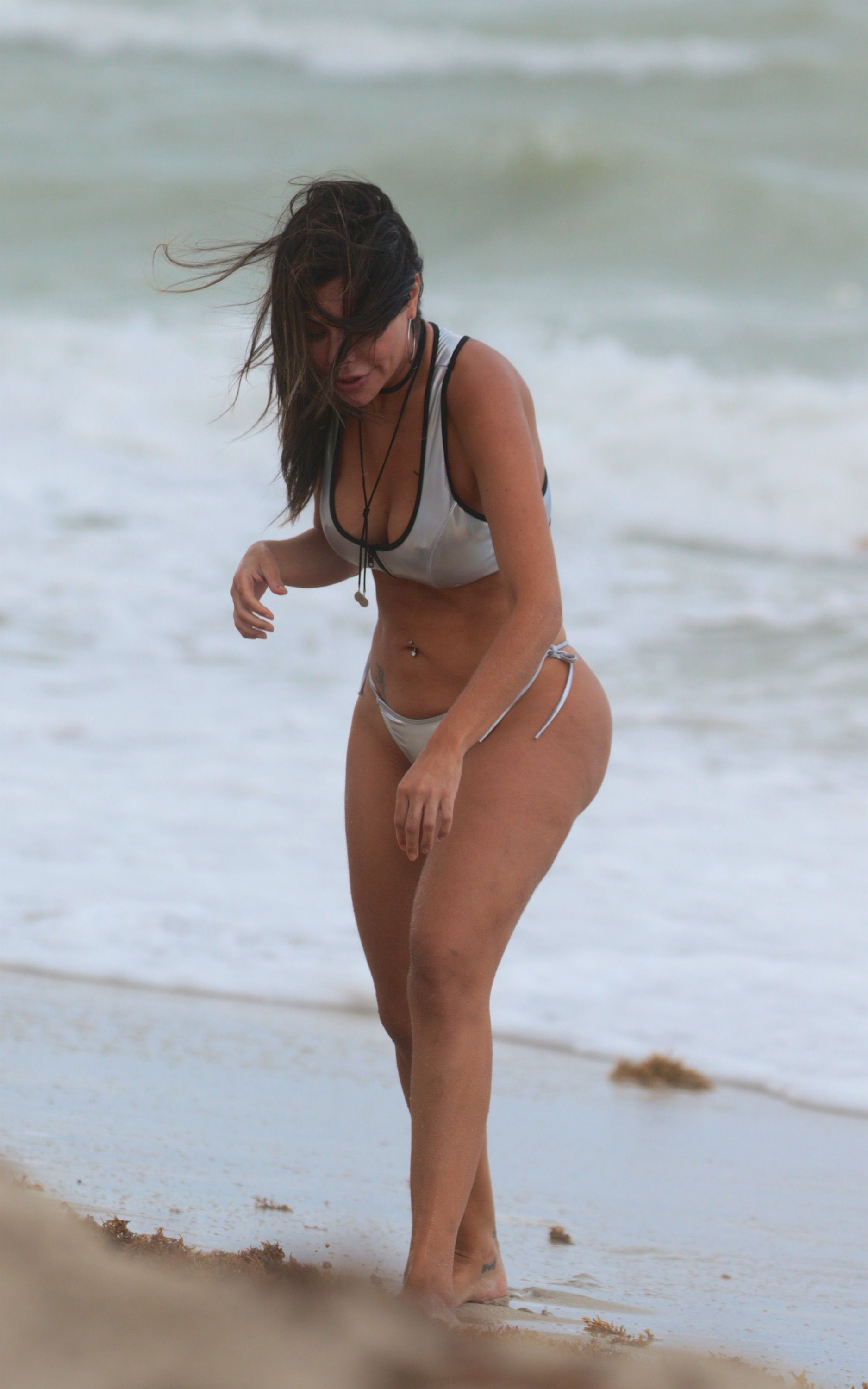 La modelo brasileña Liziane Gutierrez con un bikini tanga plateado es vista en la playa de Miami Beach, 10/04/2017. Liziane ajustó su bikini antes de entrar al océano para nadar con su amigo Diego.