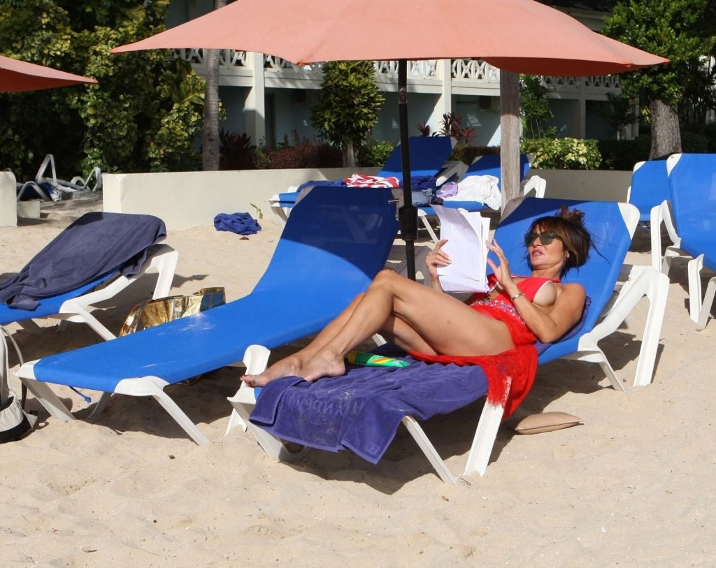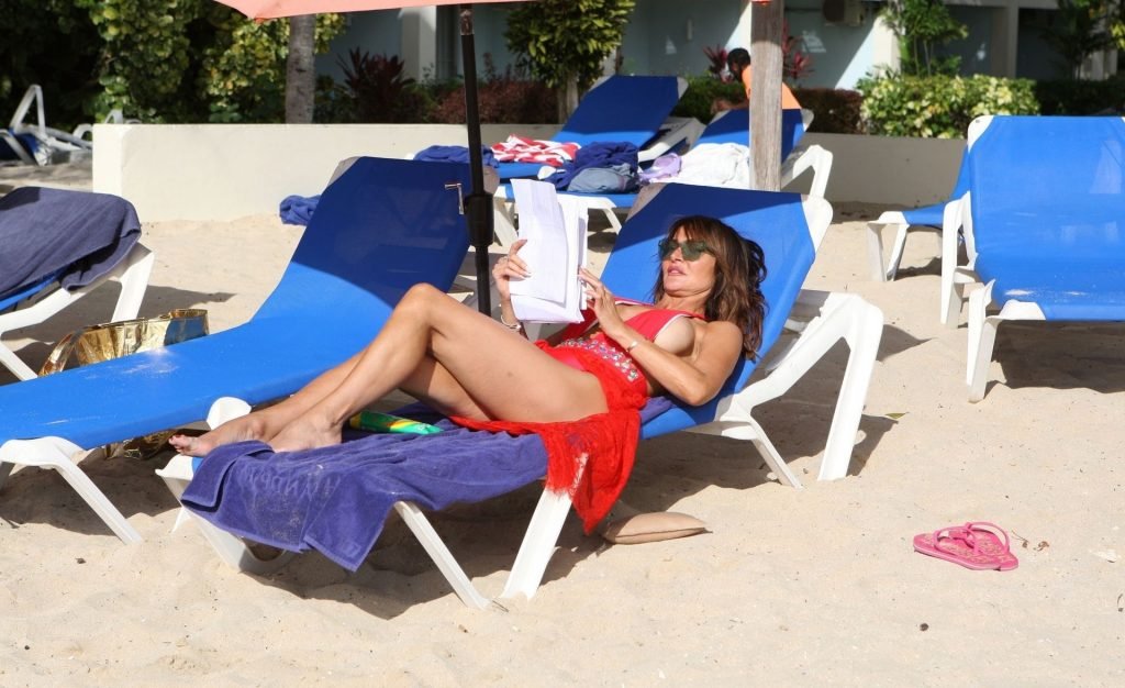 Lizzie Cundy parece estar aprendiendo sus líneas leyendo un guion en su tumbona mientras disfruta de unas vacaciones en la soleada isla de Barbados, 30/12/2018. Lizzie deslumbró con un vestido de playa fluido con cuello halter que revela mucho de sus costados.