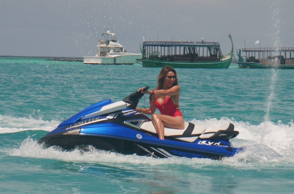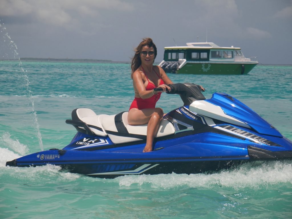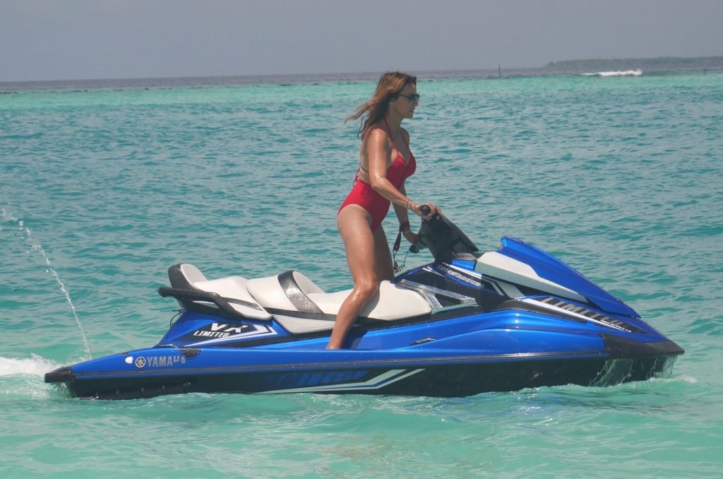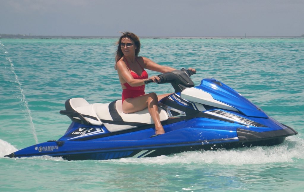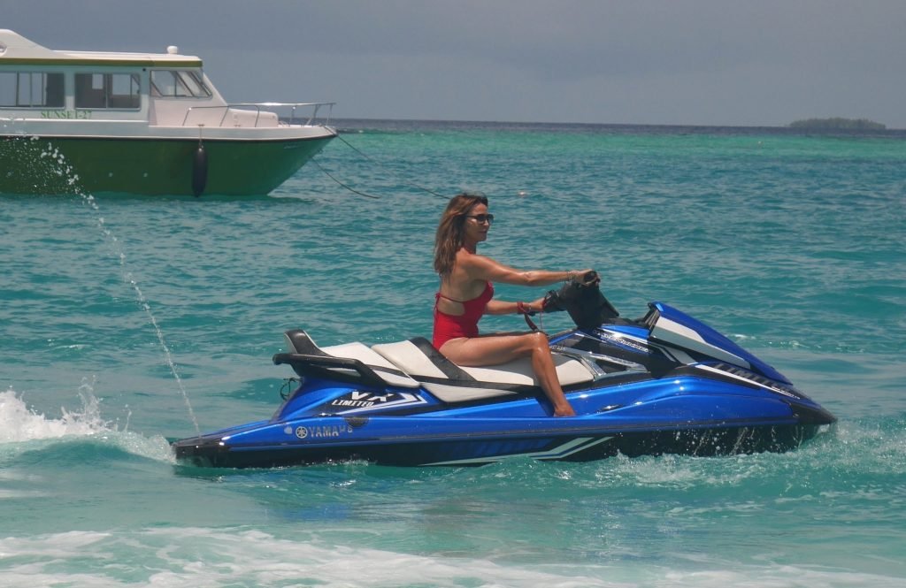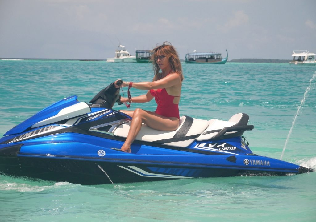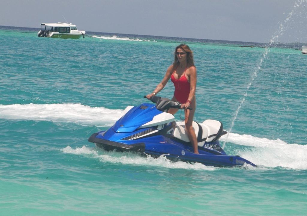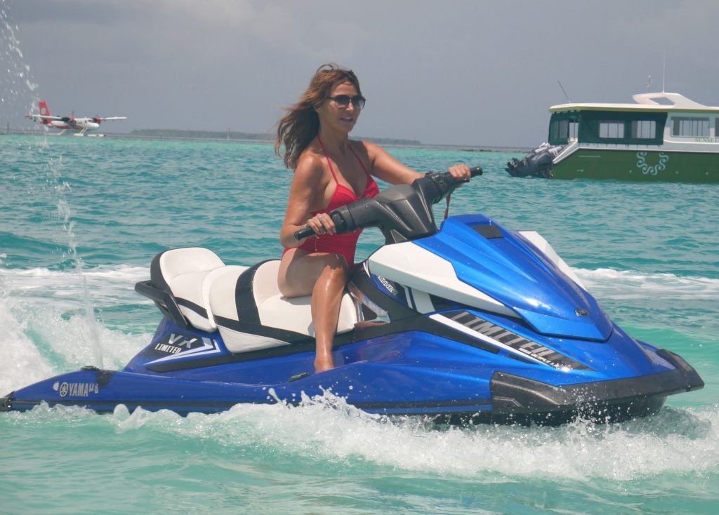 Lizzie Cundy fue vista en el Sun Siyam Iru Fushi Resort en Maldivas, 10/09/2018. Ella logra tomarse un poco de tiempo para relajarse junto a la piscina y se divierte un poco en una moto acuática.