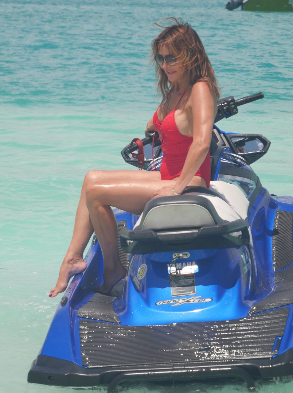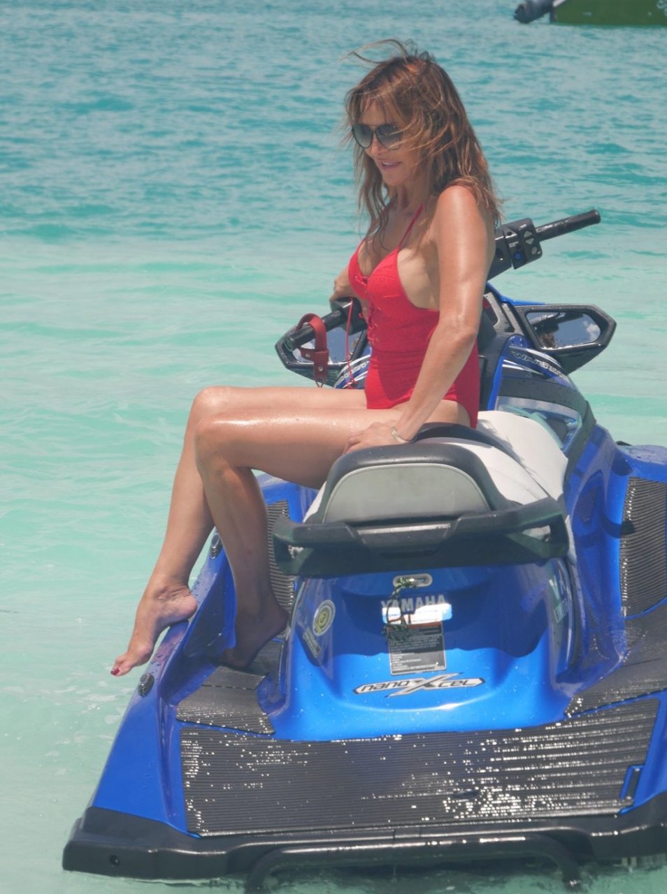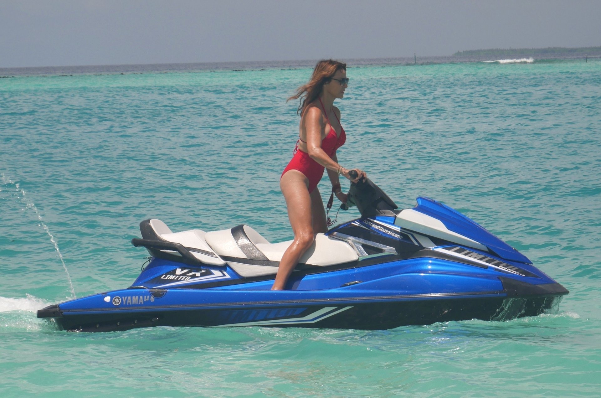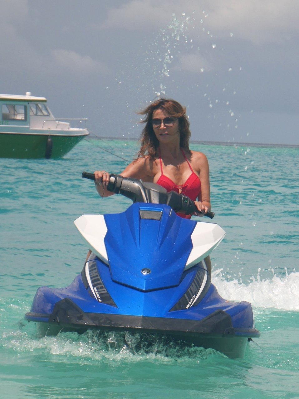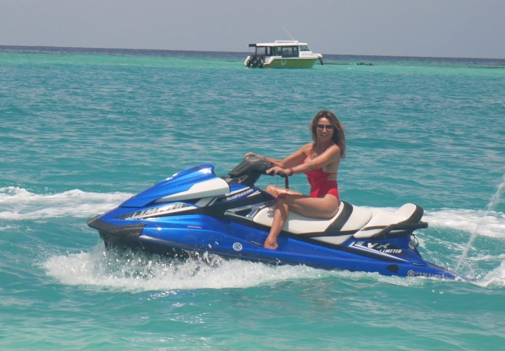 Lizzie Cundy fue vista en el Sun Siyam Iru Fushi Resort en Maldivas, 10/09/2018. Ella logra tomarse un poco de tiempo para relajarse junto a la piscina y se divierte un poco en una moto acuática.