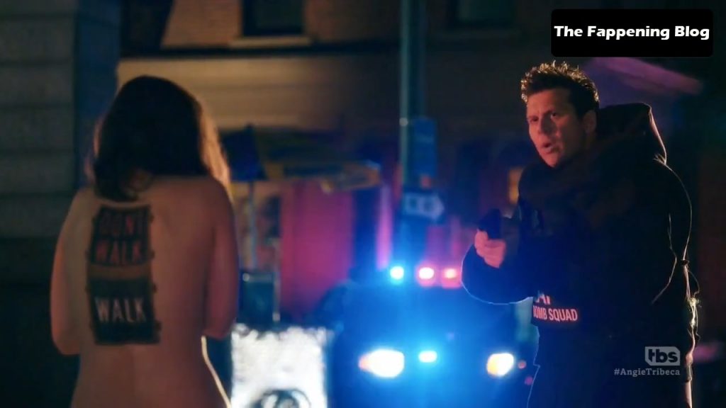 Lizzy Caplan is standing up in the middle of a street surrounded by police and fire trucks, her arms crossed in front of her as she holds her breasts with her hands, and her butt pixelated out.