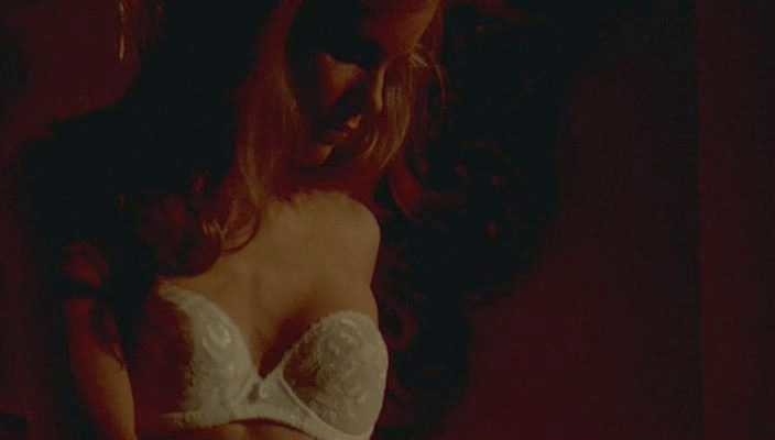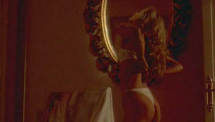 Lori Singer lleva un sujetador blanco y tanga, y luego se quita el sujetador para quedarse sin él antes de ponerse una bata.