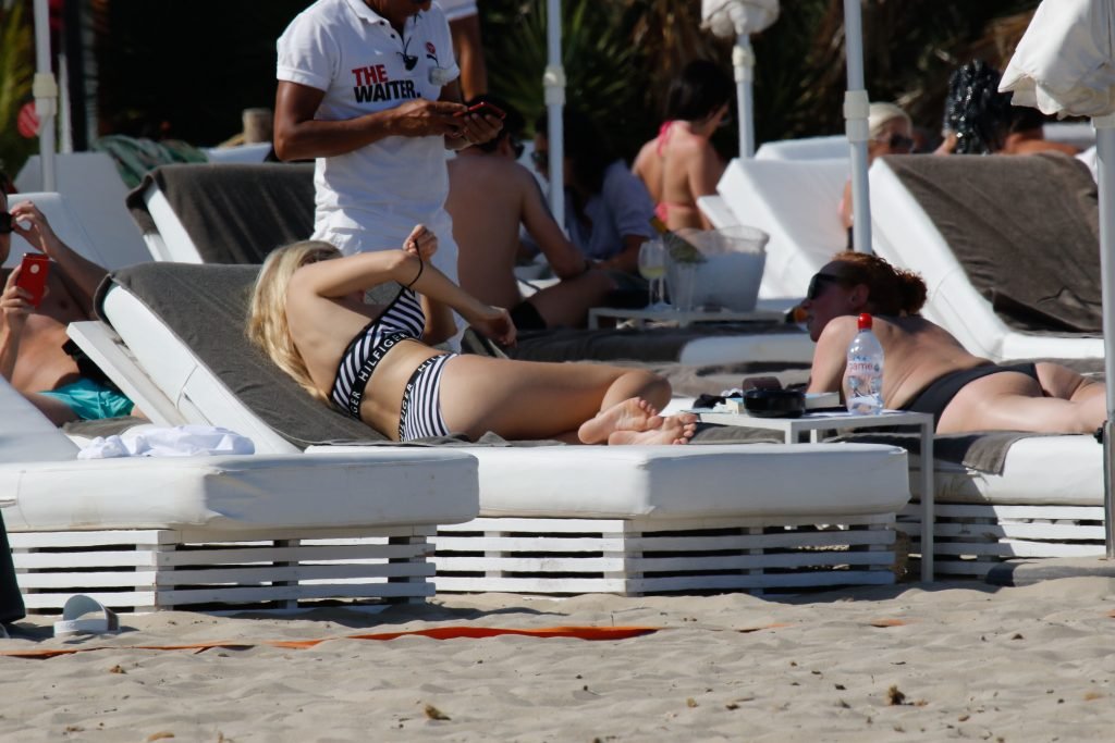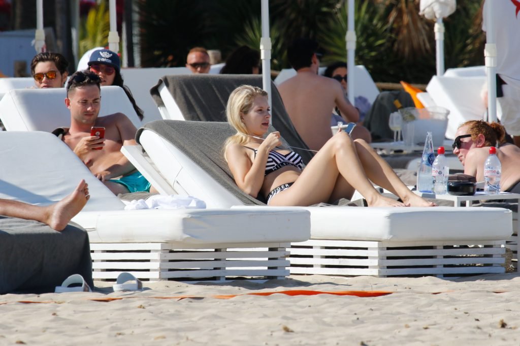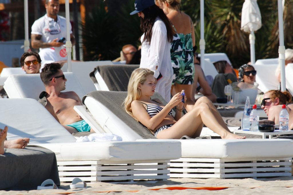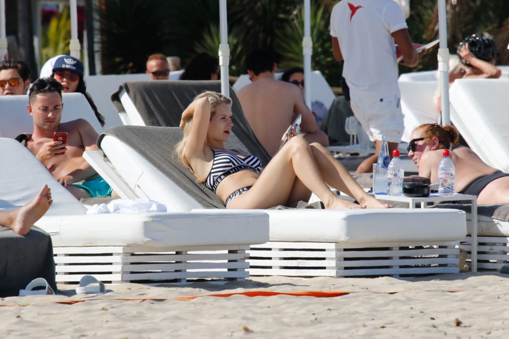 Model Lottie Moss, 20, se relaja en la playa con un bikini Tommy Hilfiger en Ibiza, 23/05/2018. La modelo fue vista relajándose con una amiga al sol, revisando su teléfono y fumando un cigarrillo.