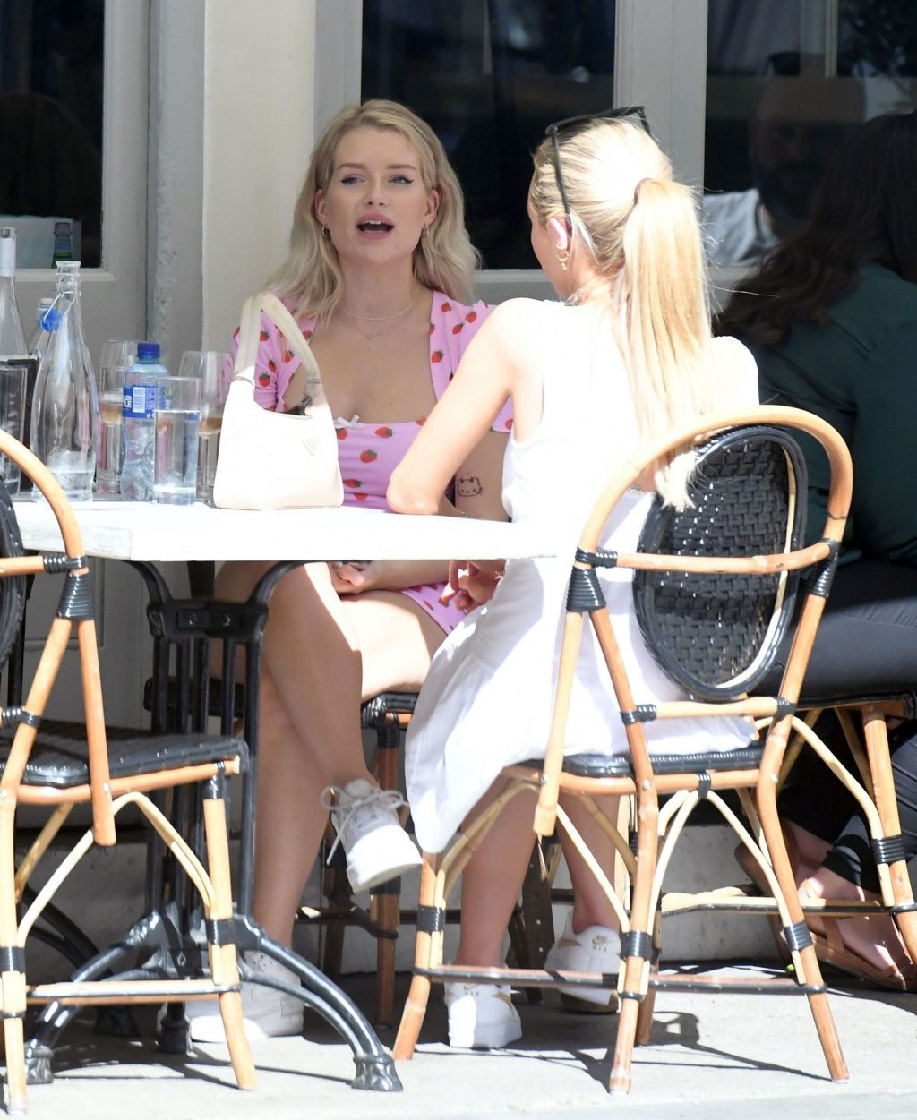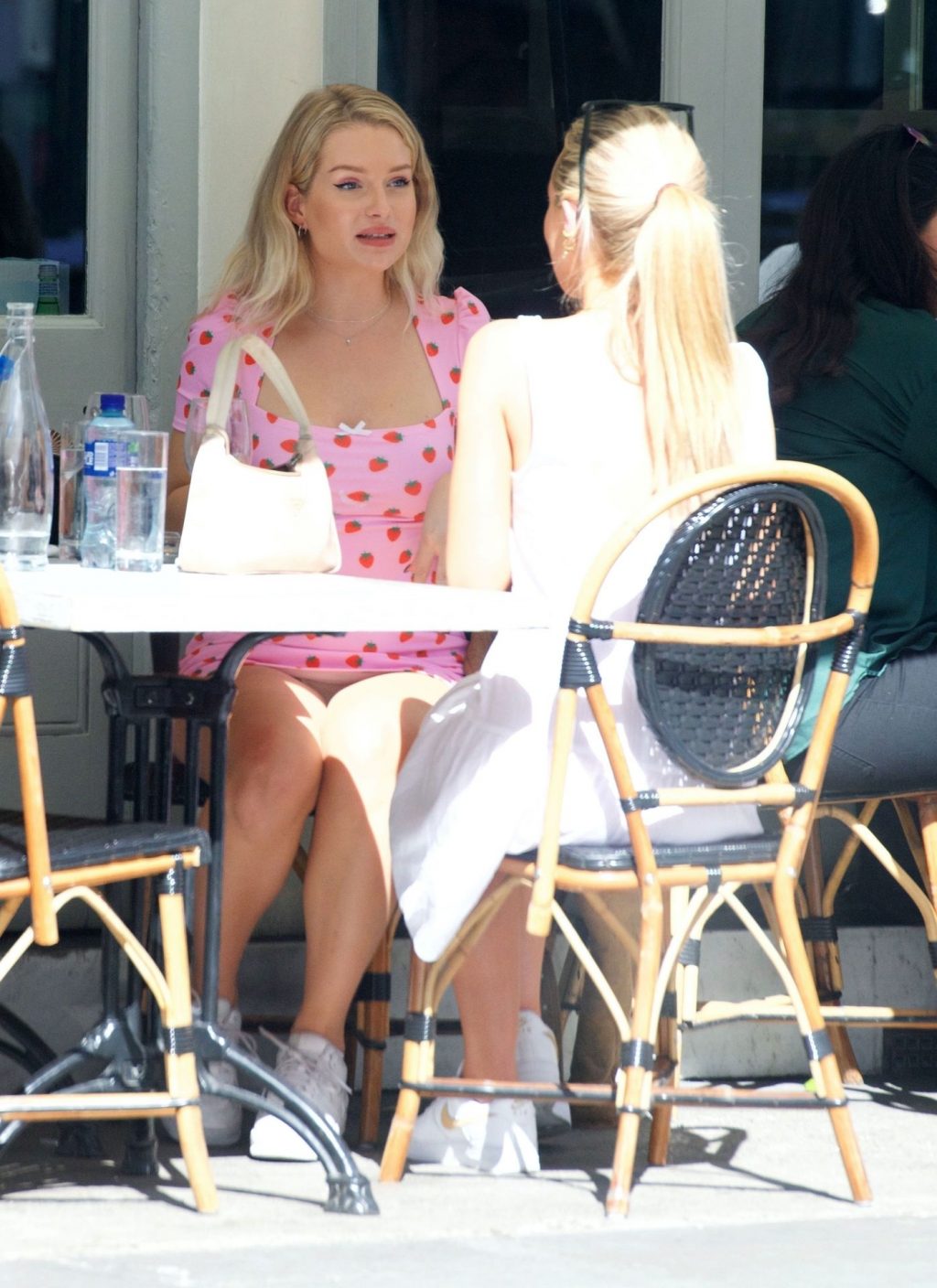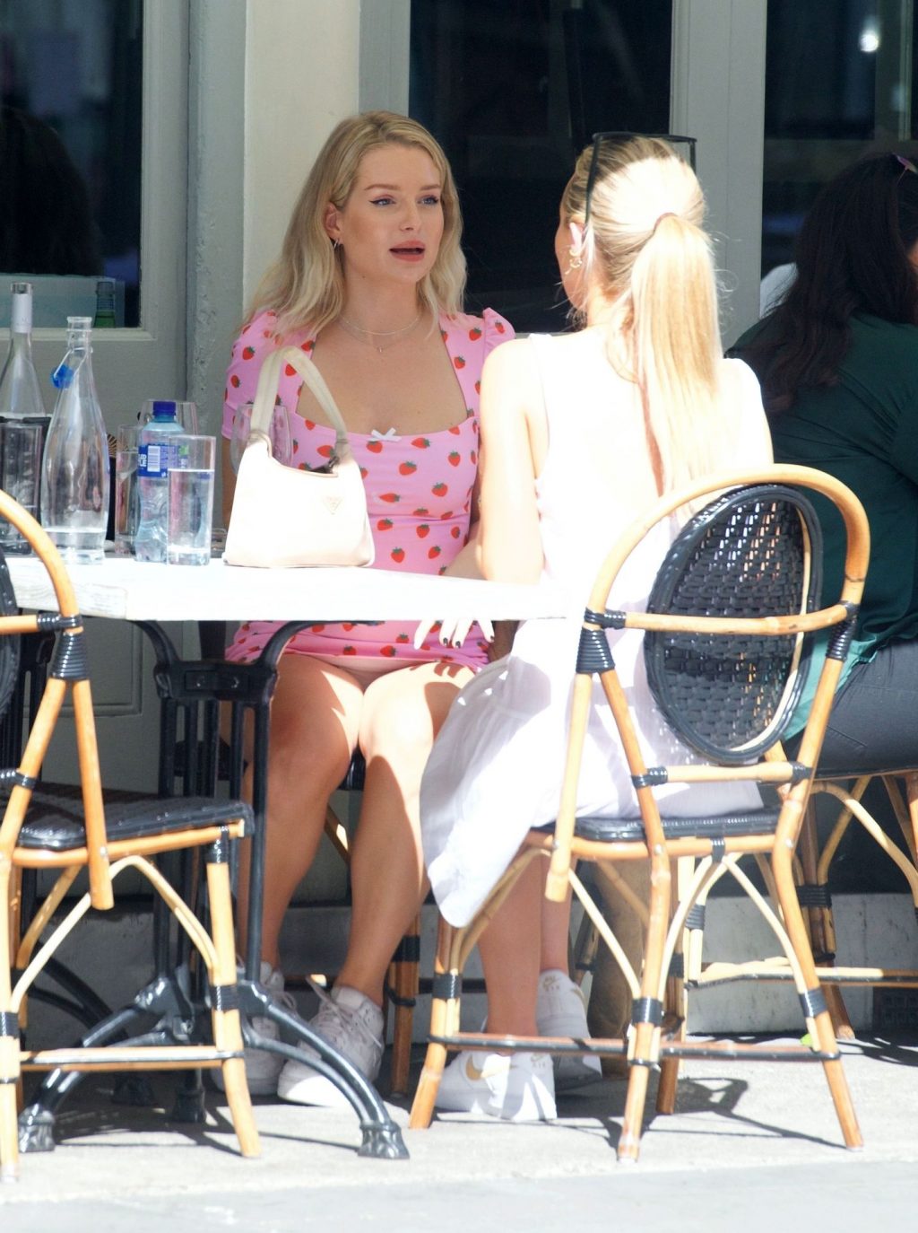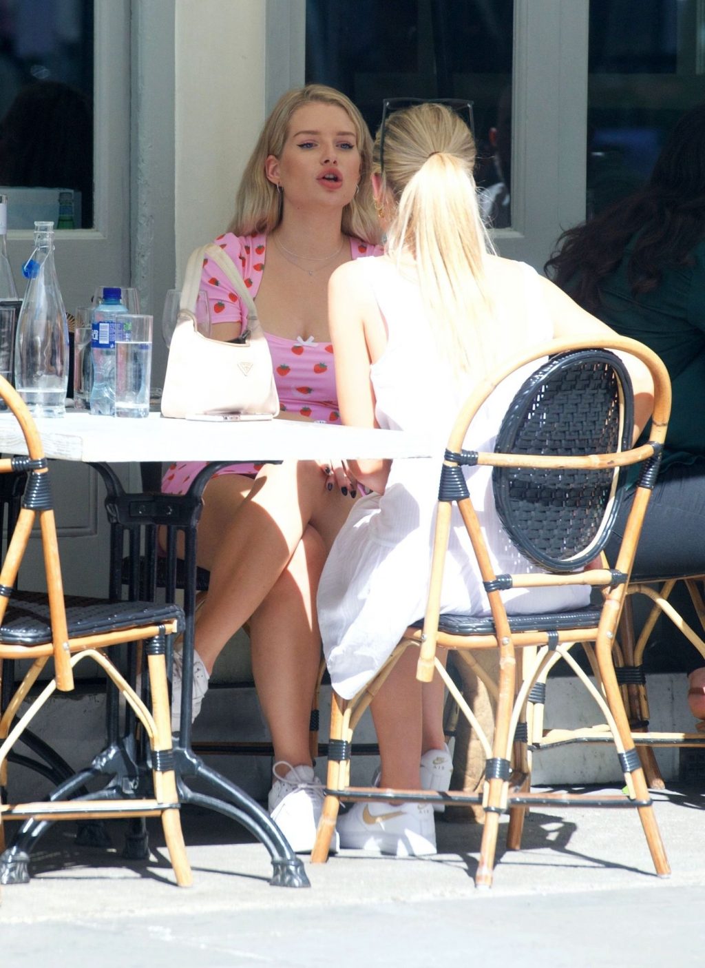 Lottie Moss casi detiene el tráfico mientras lleva un vestido muy corto sentada en una mesa, teniendo una conversación animada con una amiga. Su vestido rosa tenía pequeñas fresas por todas partes. Sin el tenis de Wimbledon este año, que debería haber terminado el domingo pasado, al menos Lottie llevó sus fresas.