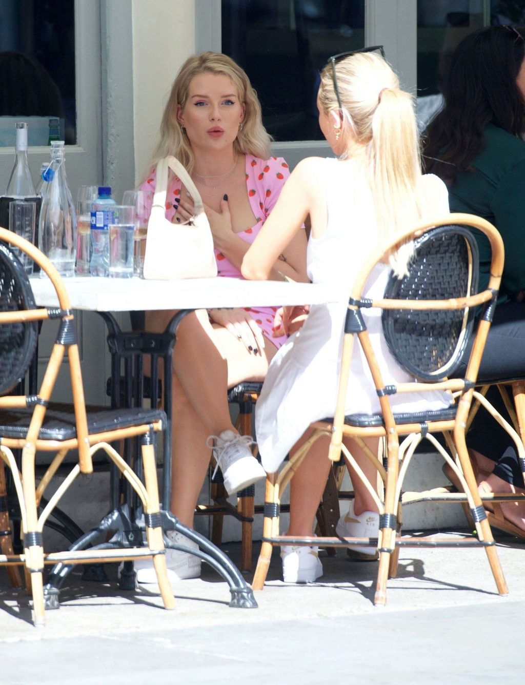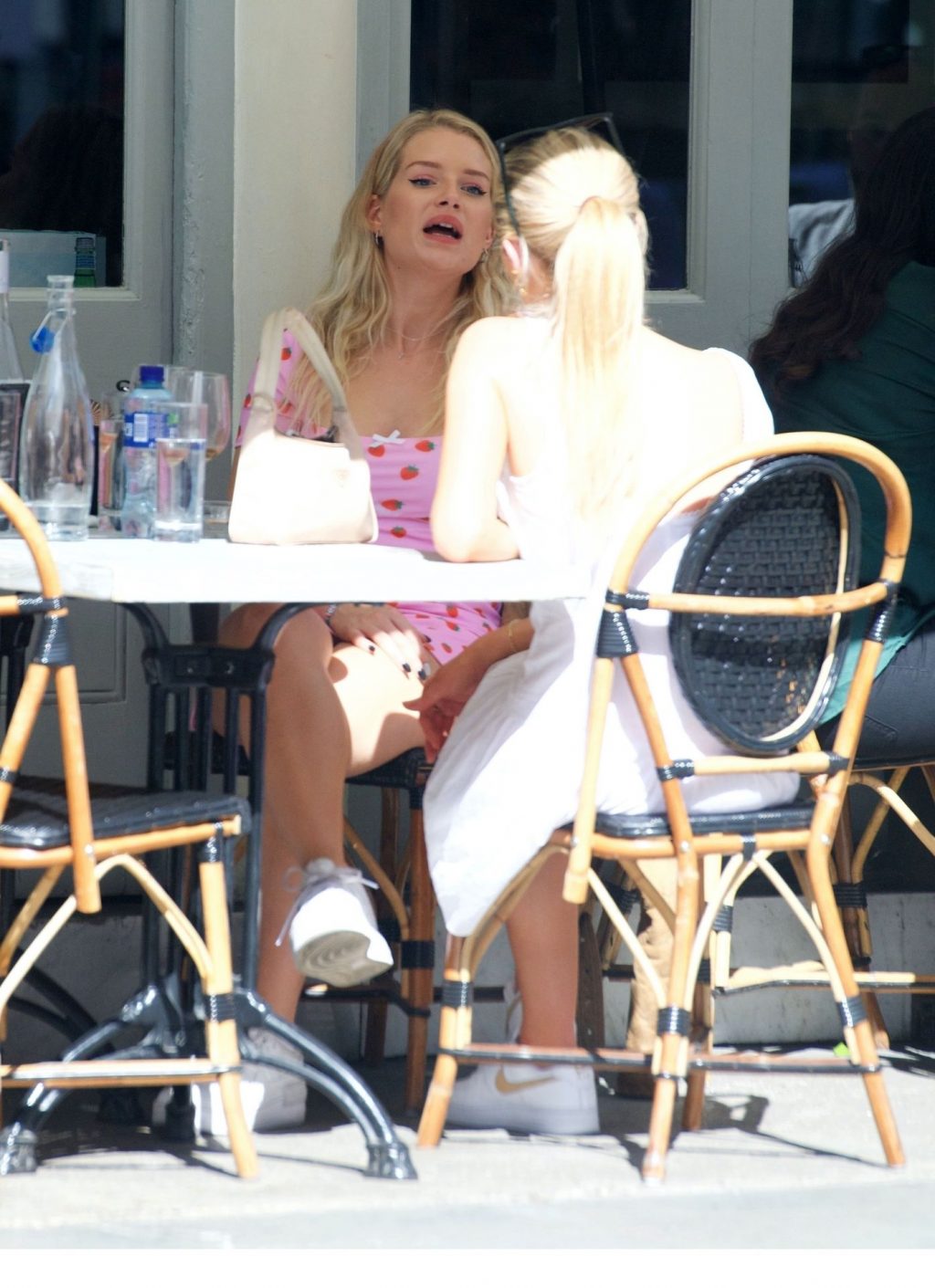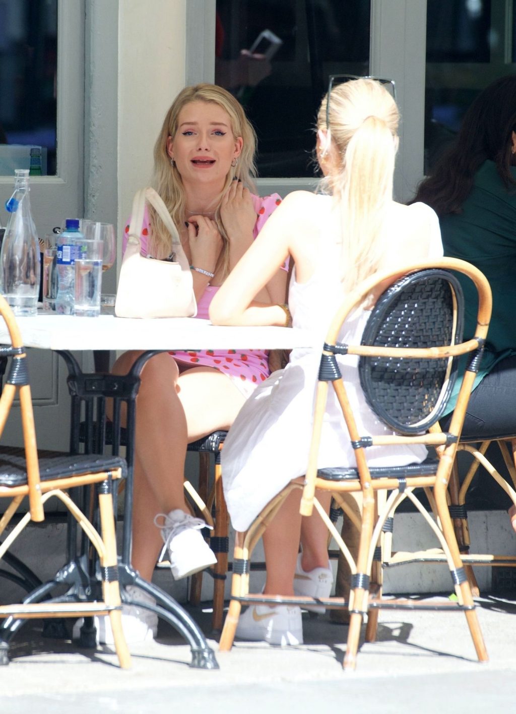 Lottie Moss casi detiene el tráfico mientras lleva un vestido muy corto sentada en una mesa, teniendo una conversación animada con una amiga. Su vestido rosa tenía pequeñas fresas por todas partes. Sin el tenis de Wimbledon este año, que debería haber terminado el domingo pasado, al menos Lottie llevó sus fresas.