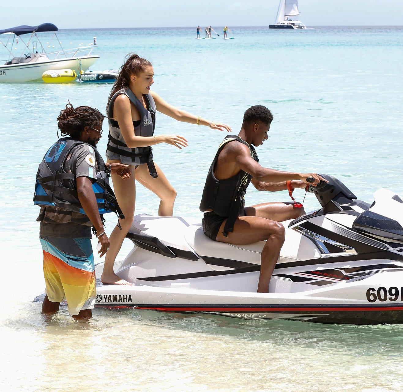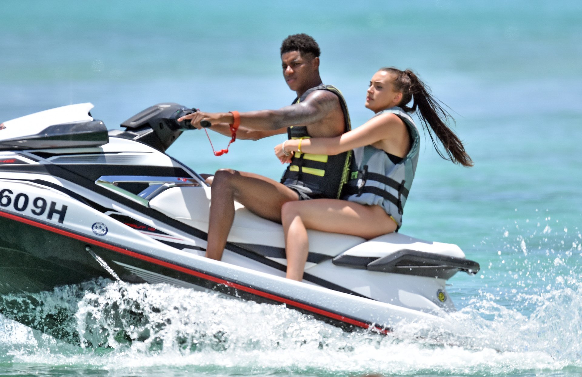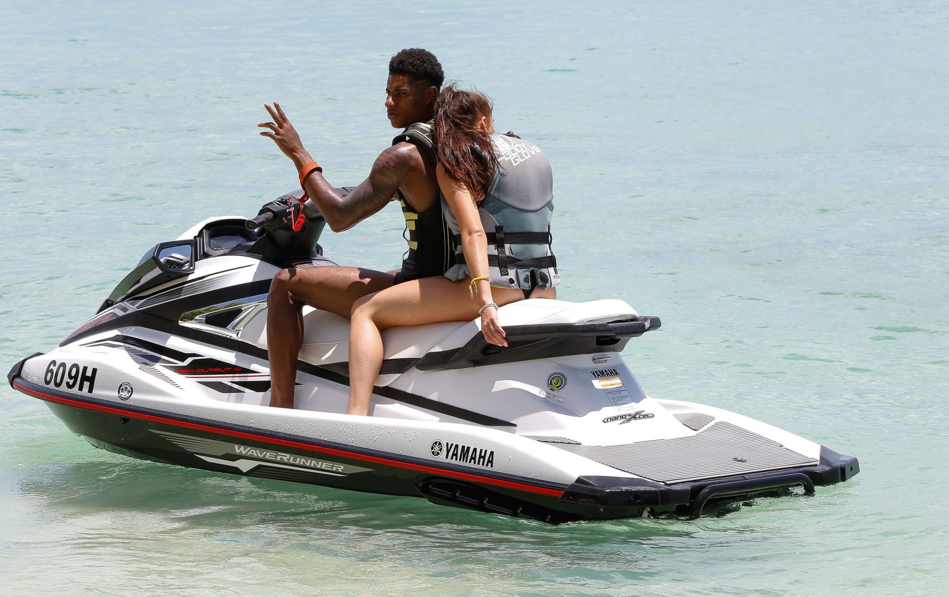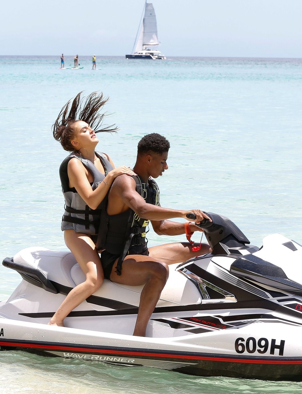 Marcus Rashford y su novia Lucia Loi son fotografiados disfrutando de un paseo en moto acuática durante sus vacaciones en Barbados, 23/07/2018. La joven pareja alquiló el lujoso catamarán Cool Runnings por un día y navegó por la costa oeste de la isla. Lucía Lois es una modelo y actriz de Uruguay.