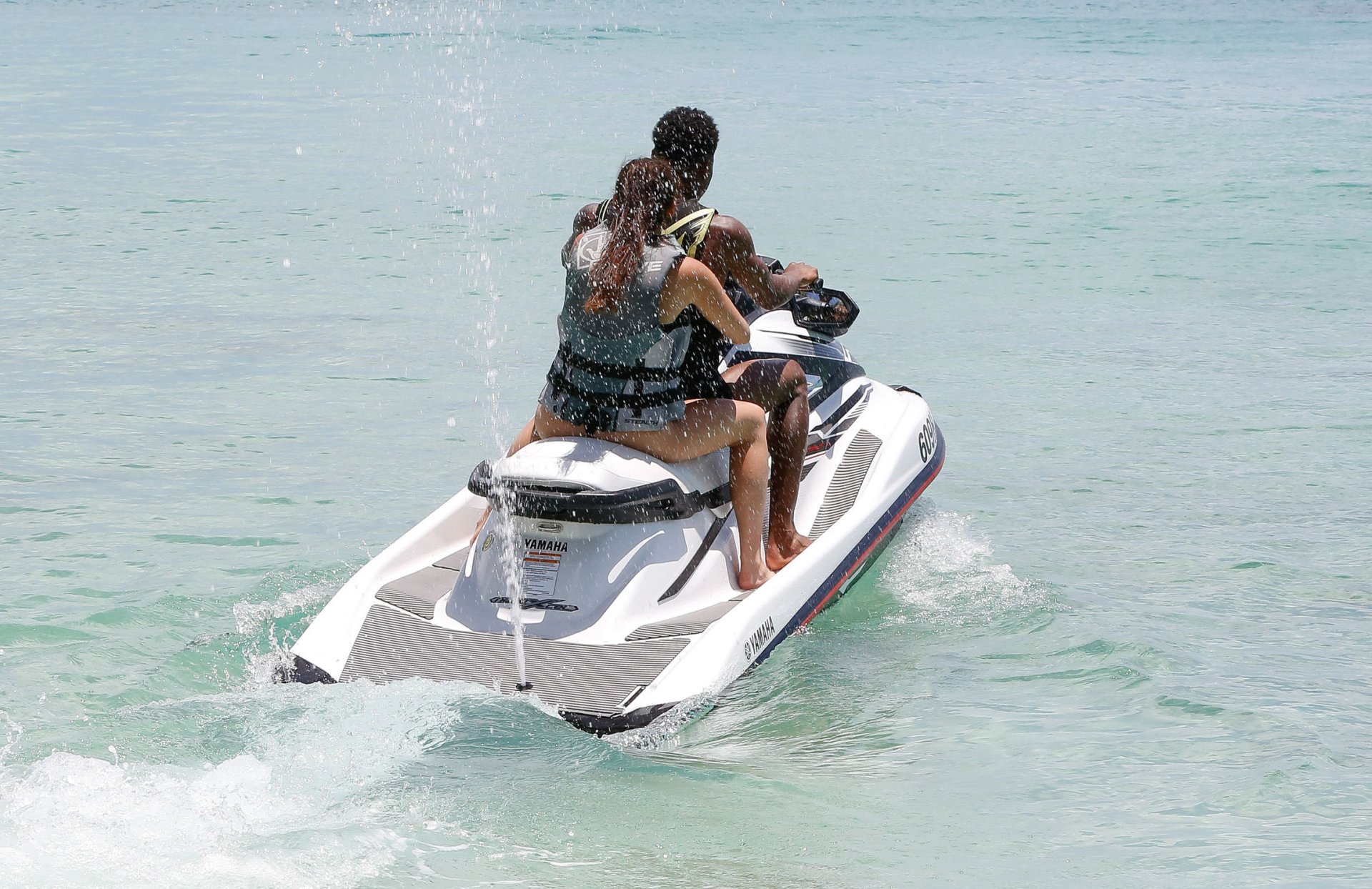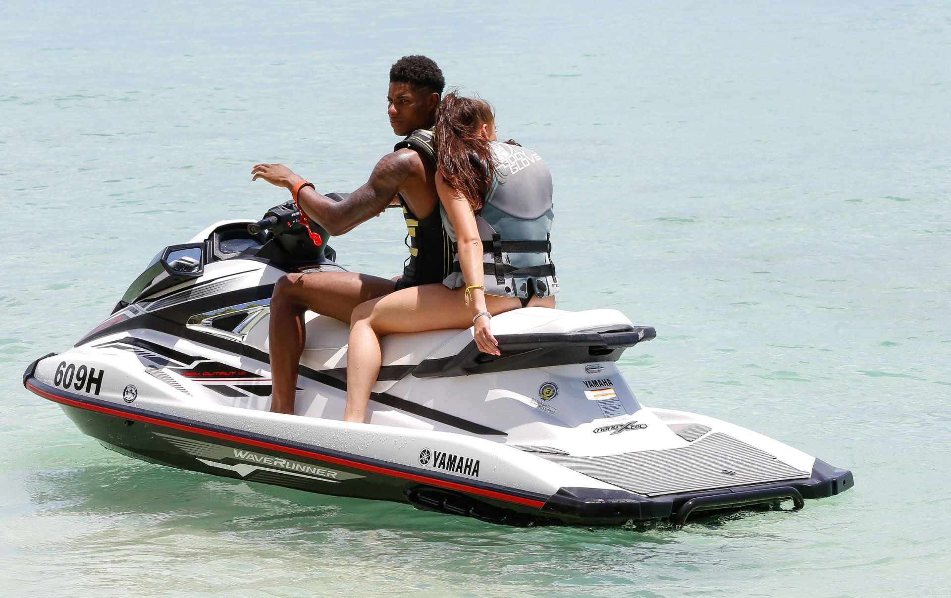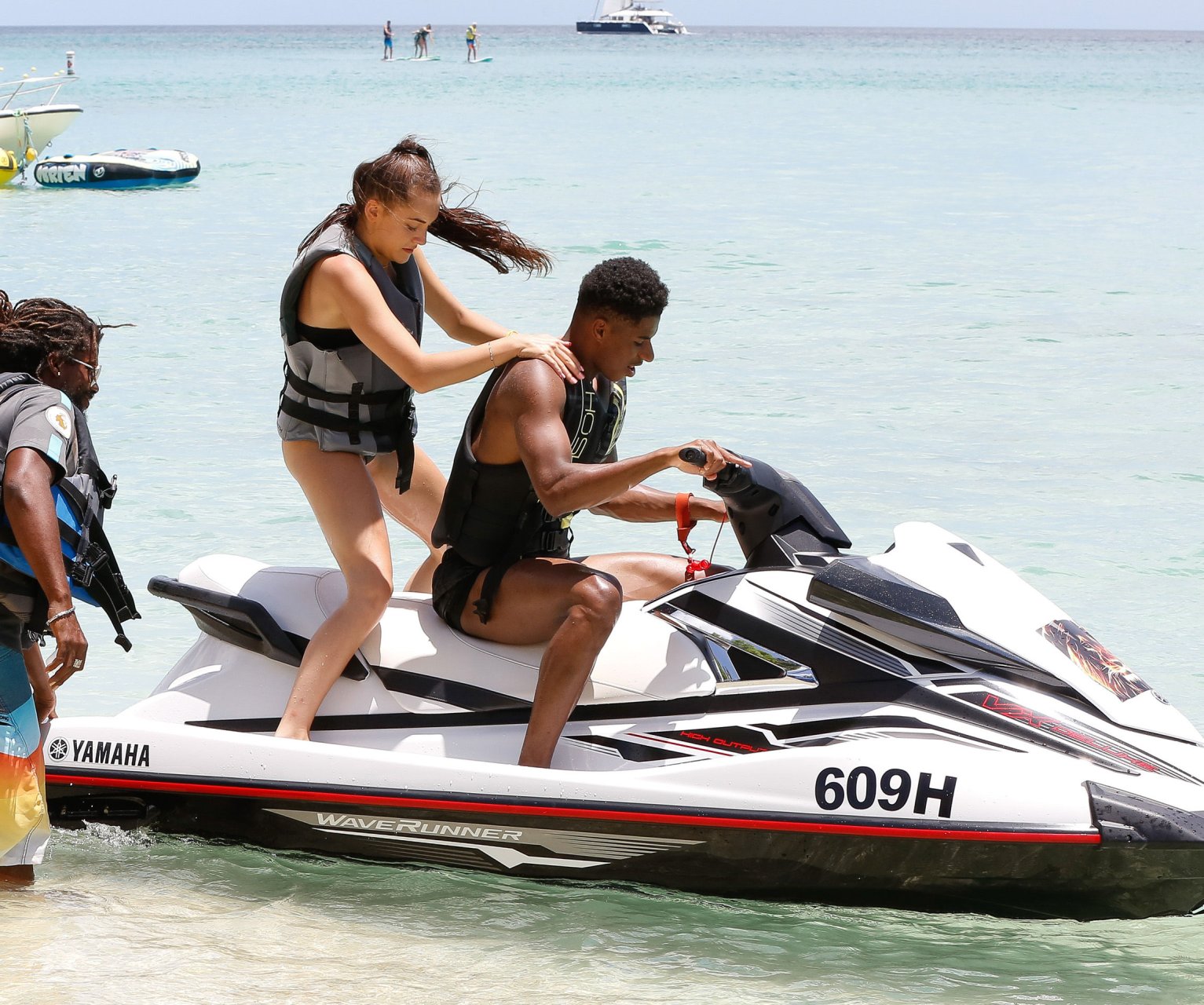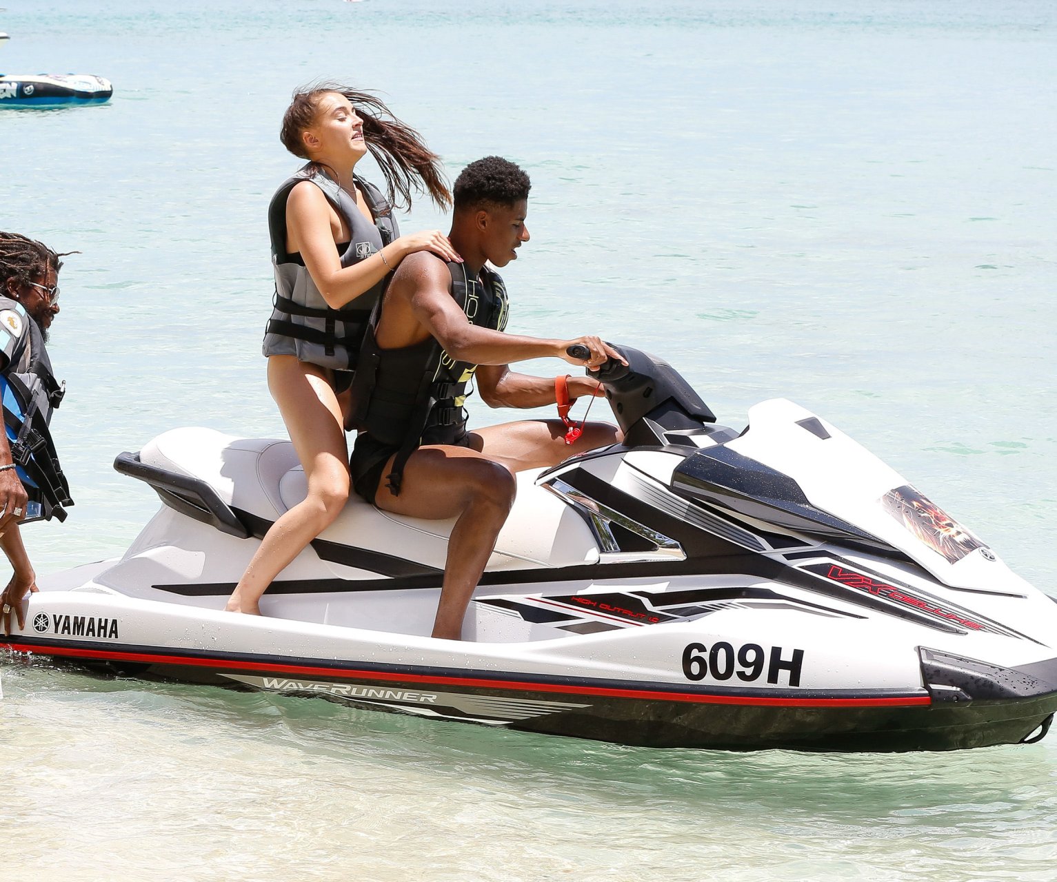 Marcus Rashford y su novia Lucia Loi son fotografiados disfrutando de un paseo en moto acuática durante sus vacaciones en Barbados, 23/07/2018. La joven pareja alquiló el lujoso catamarán Cool Runnings por un día y navegó por la costa oeste de la isla. Lucía Lois es una modelo y actriz de Uruguay.