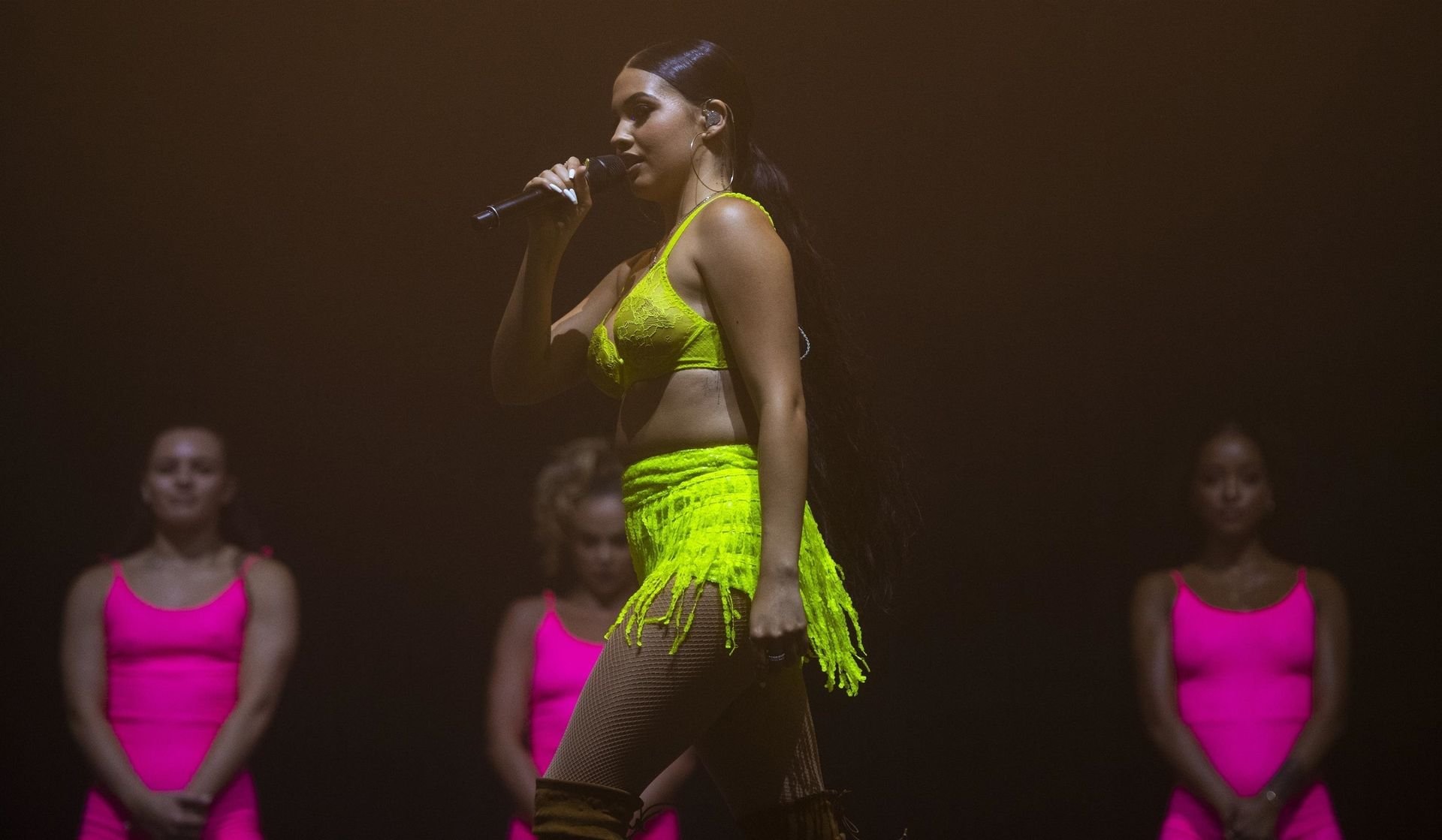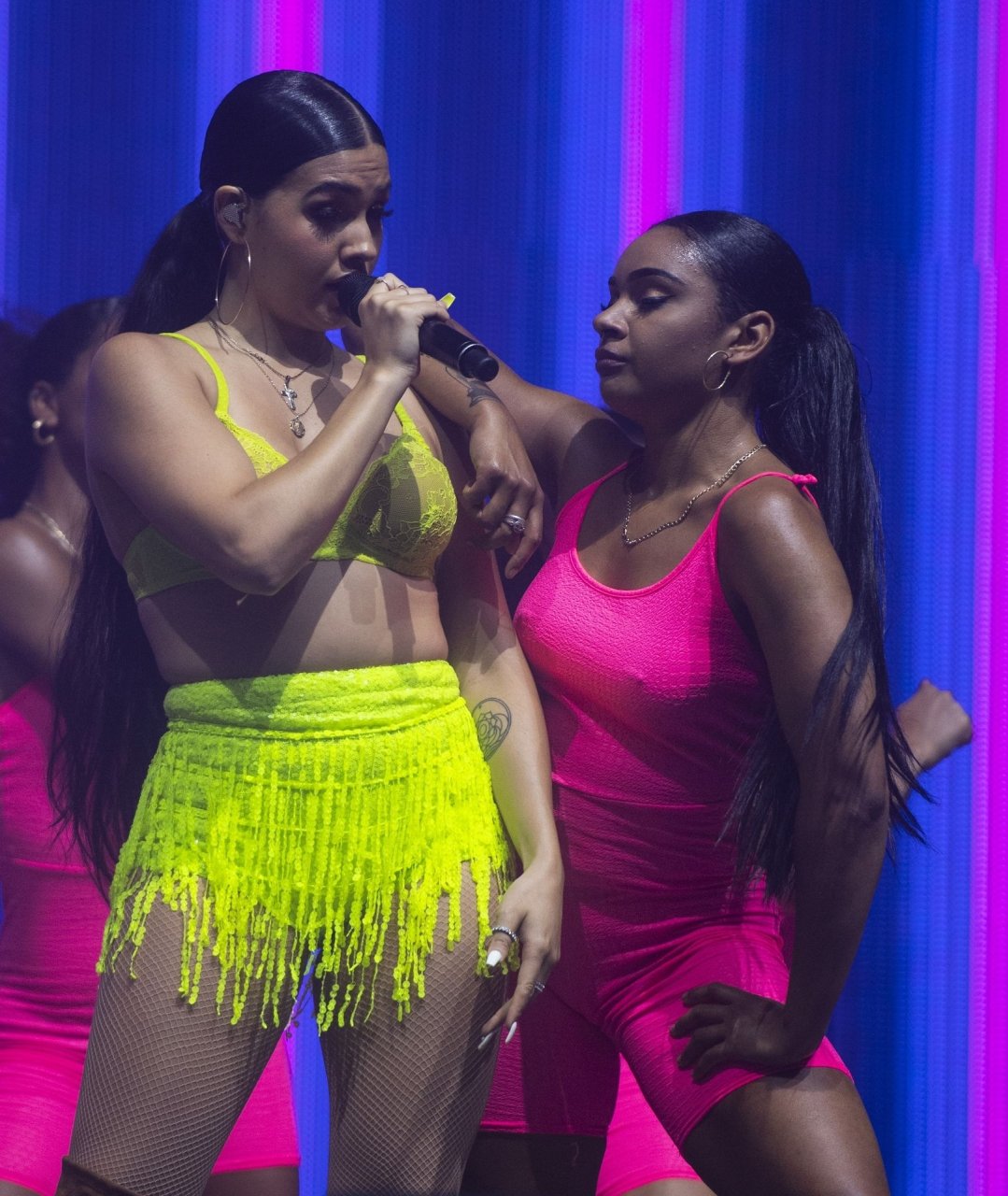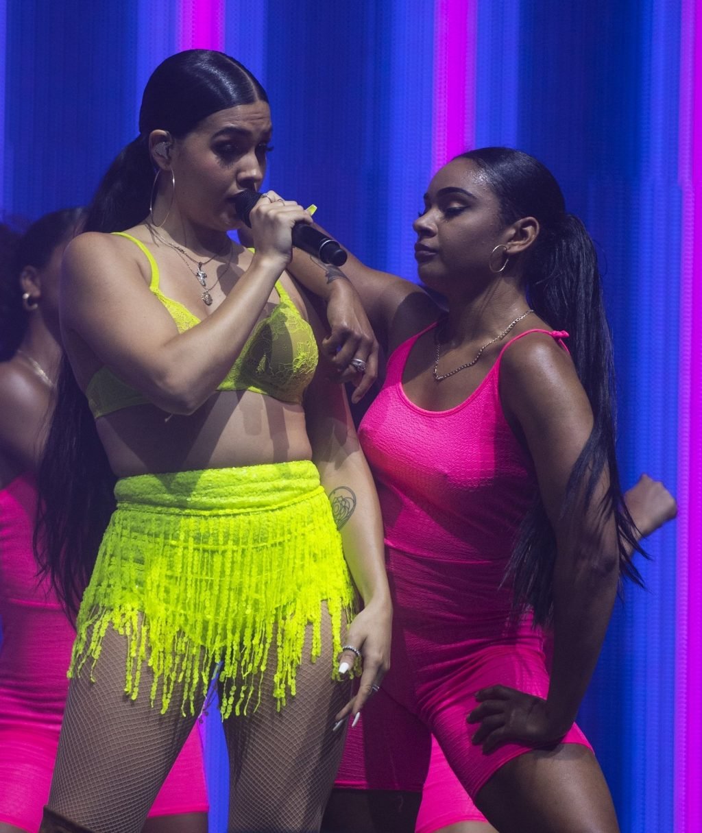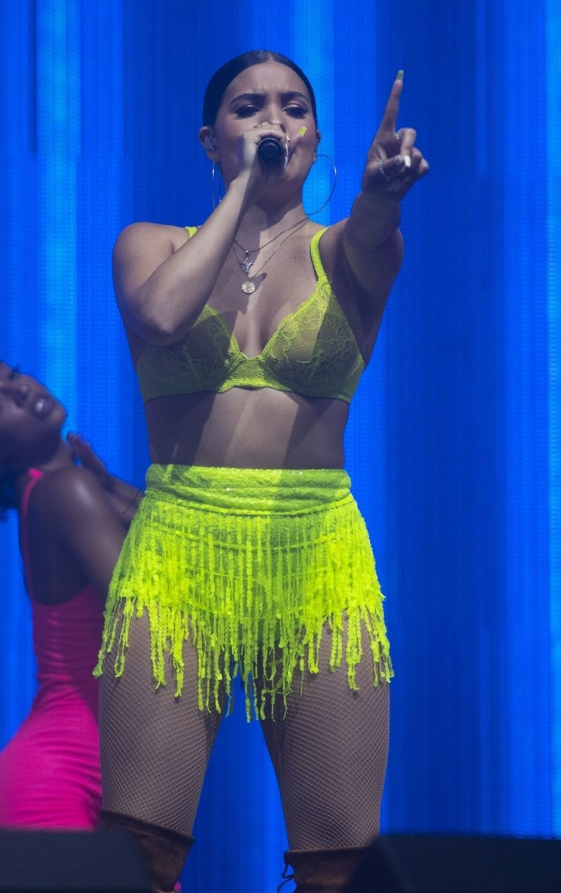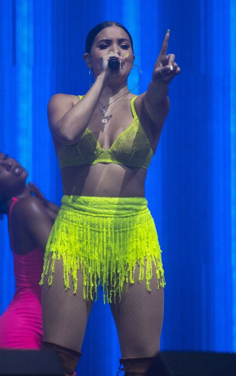 Mabel estaba actuando en vivo con un sujetador y falda verde tóxico en el escenario de Radio 1 en el Leeds Festival 2019.