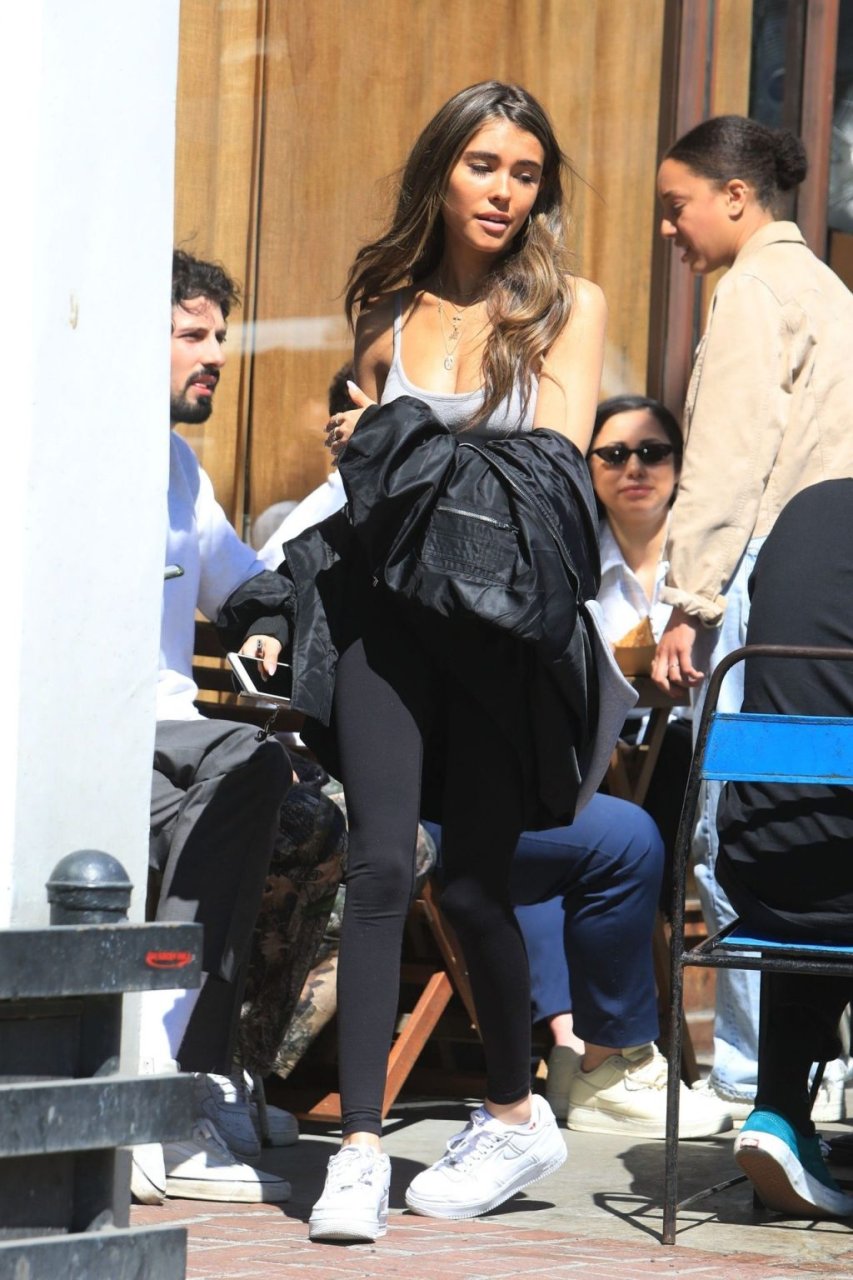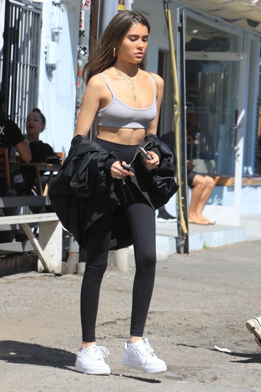 Madison Beer muestra su físico y sus encantos con una amiga en West Hollywood, 04/06/2019. La cantante llevó un sujetador deportivo, leggings y zapatillas blancas.