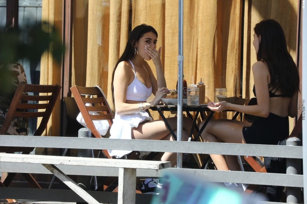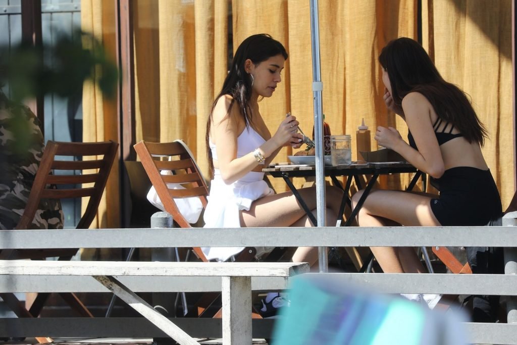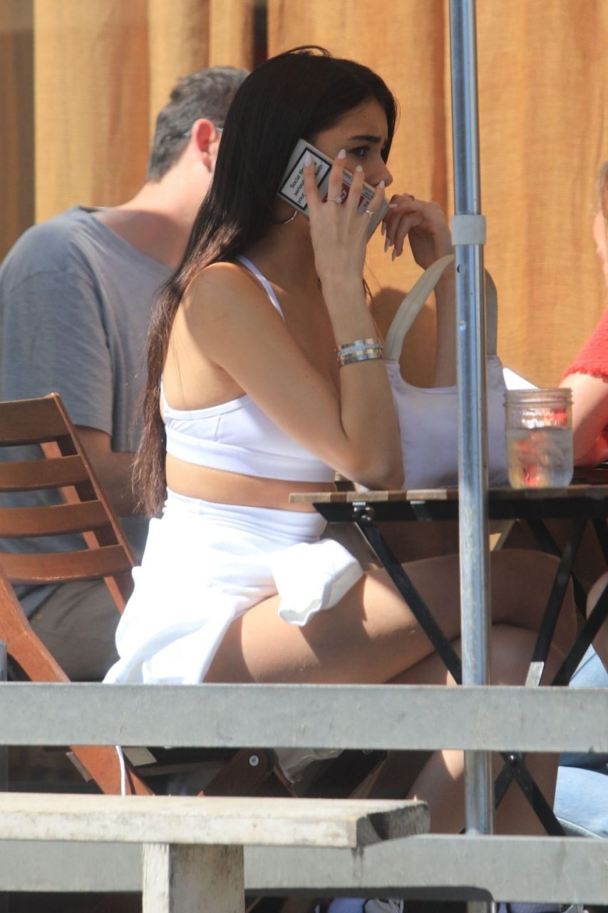 Madison Beer muestra su figura delgada con pantalones cortos blancos y un top corto a juego mientras ella y una amiga compran jeans de mezclilla después de un almuerzo al aire libre juntas en West Hollywood, 18/03/2019.