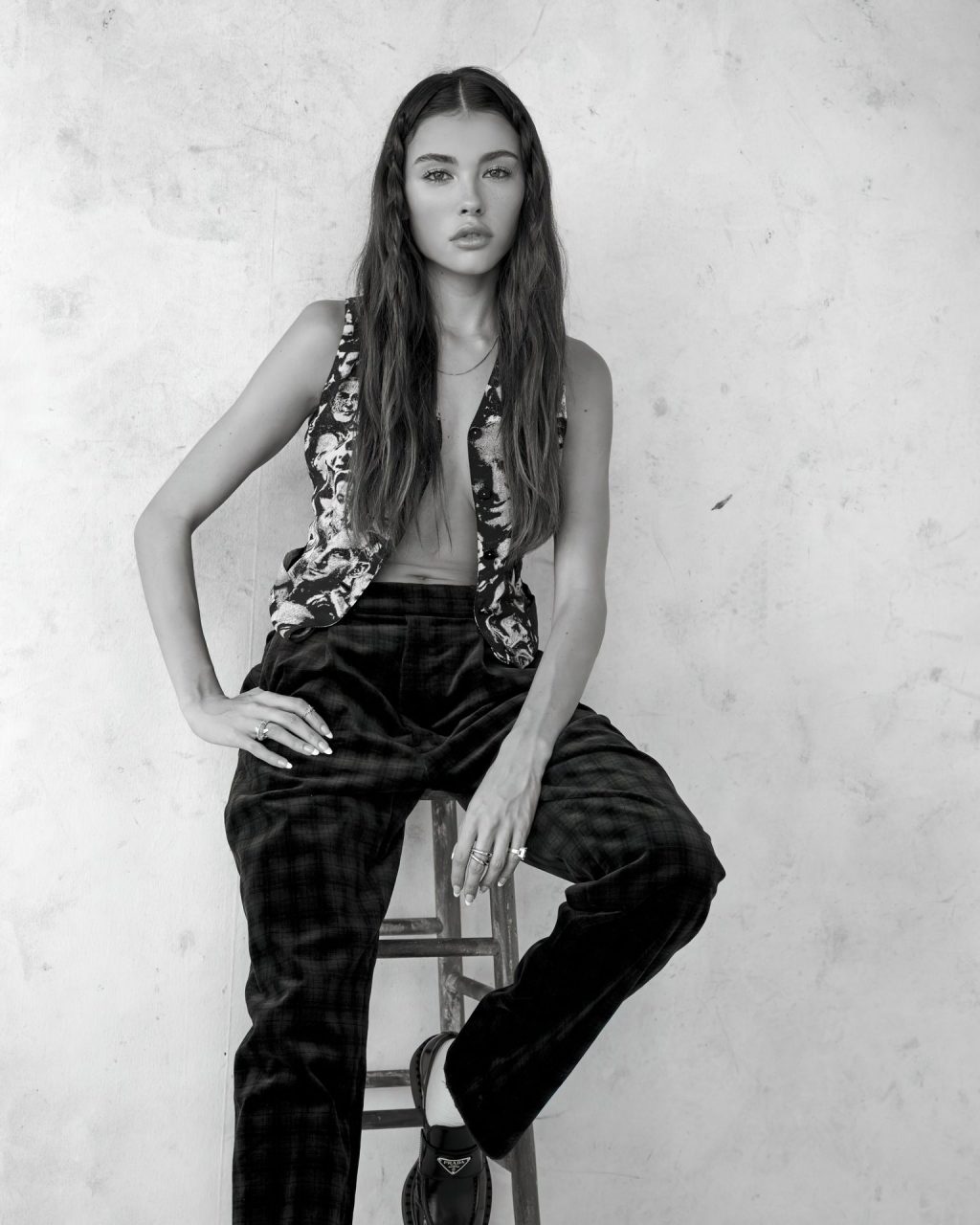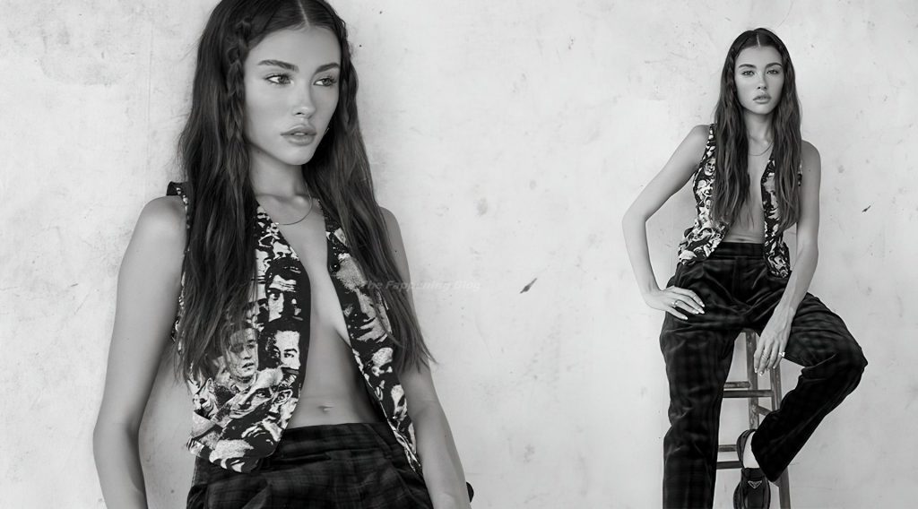 La cantante Madison Beer muestra sus pechos, posando sin sostén con una camisa abierta para la sesión de fotos de la revista Interview realizada por Matthew Priestley (2021).