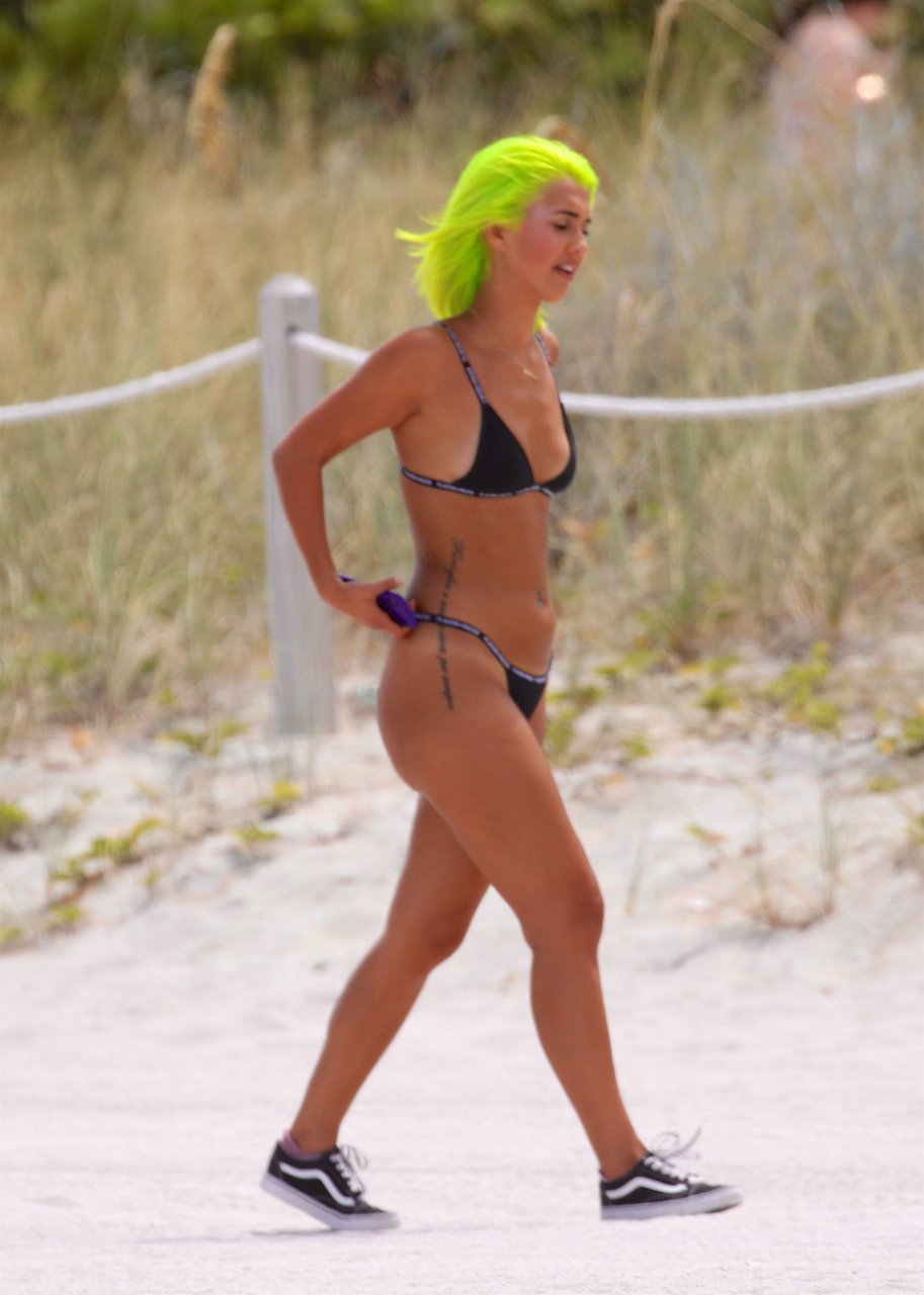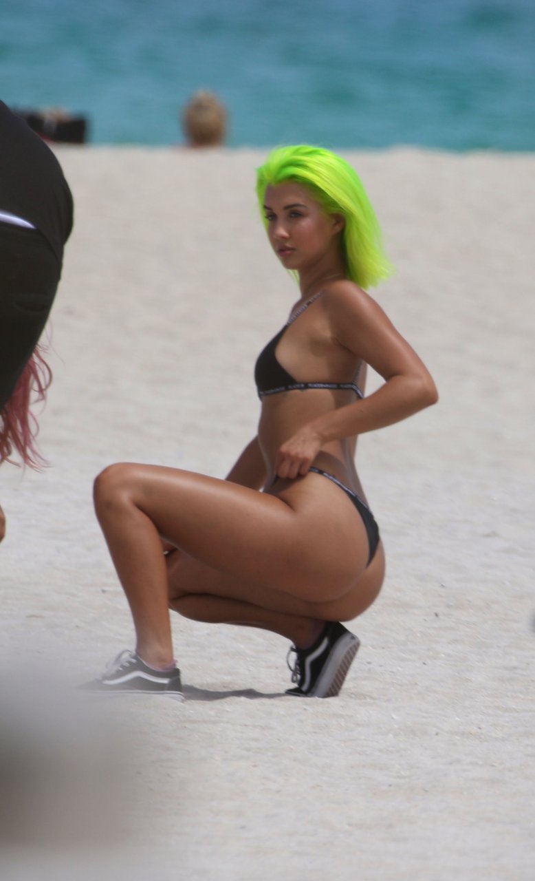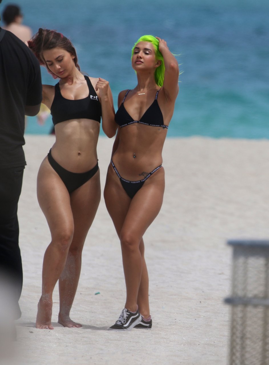 Model y estrella de las redes sociales Madison Skylar, 24, lleva un bikini tanga negro con su amiga Estelle durante una sesión de fotos en la playa de Miami Beach, 12/05/2018. Las jóvenes mostraron sus perfectos cuerpos bronceados para los fotógrafos.