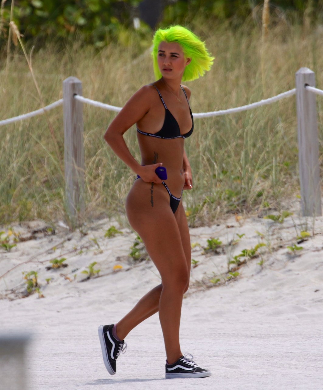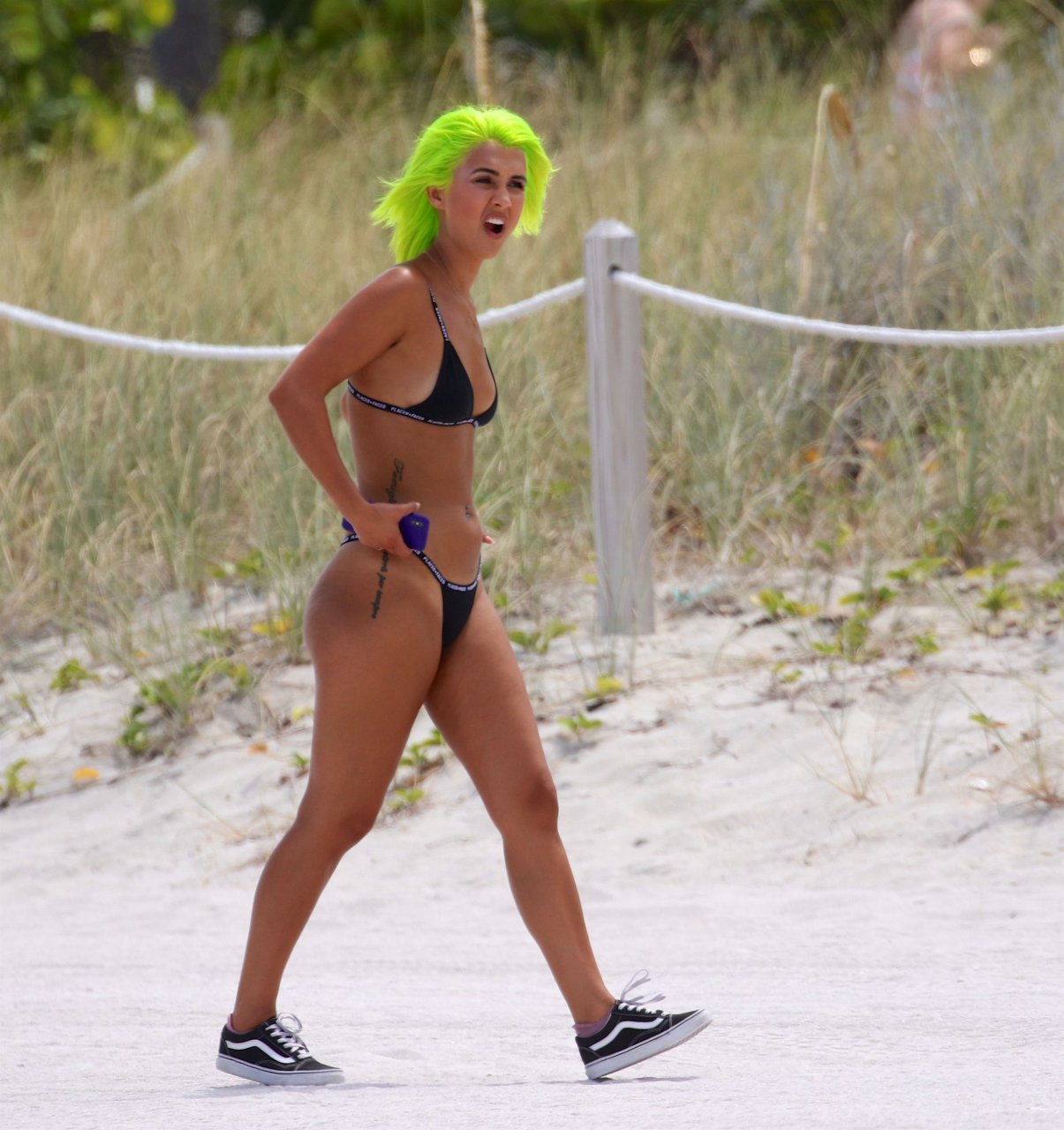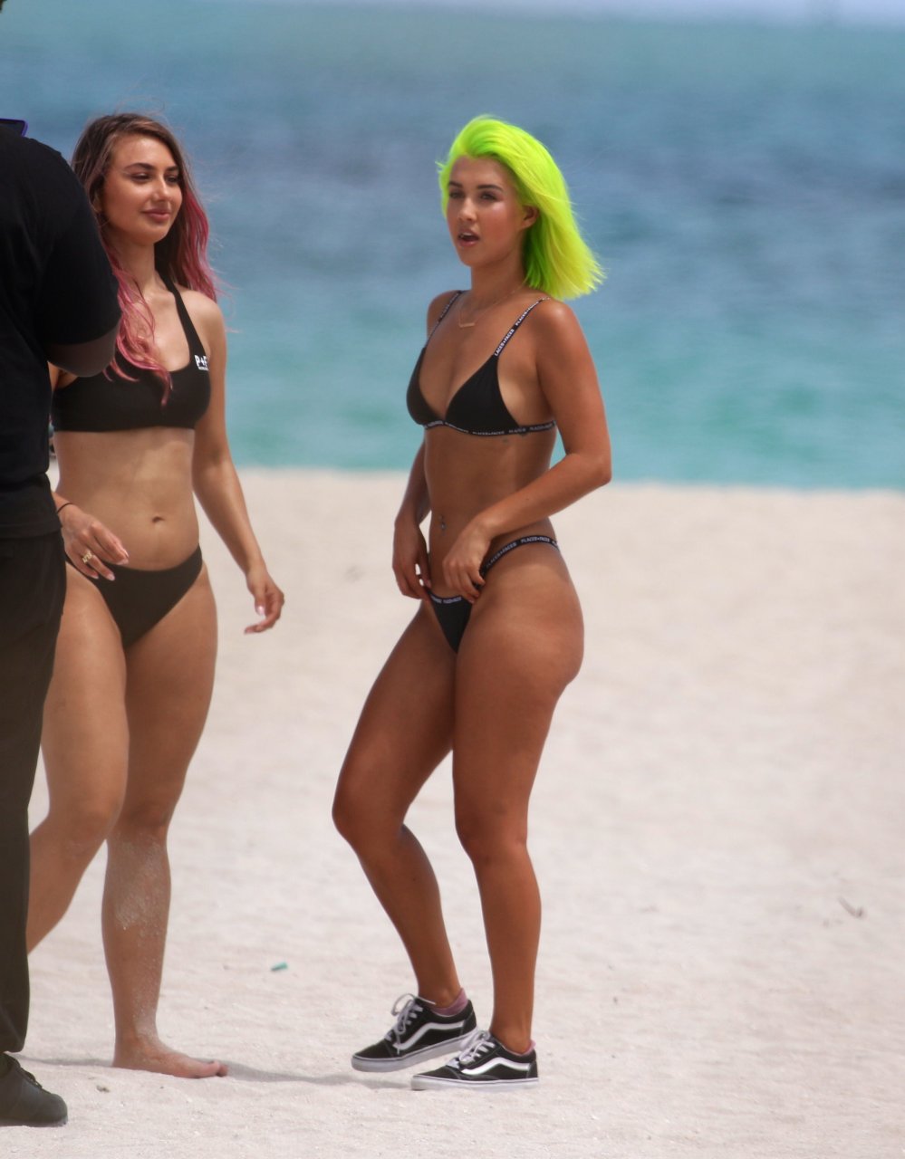 Model y estrella de las redes sociales Madison Skylar, 24, lleva un bikini tanga negro con su amiga Estelle durante una sesión de fotos en la playa de Miami Beach, 12/05/2018. Las jóvenes mostraron sus perfectos cuerpos bronceados para los fotógrafos.