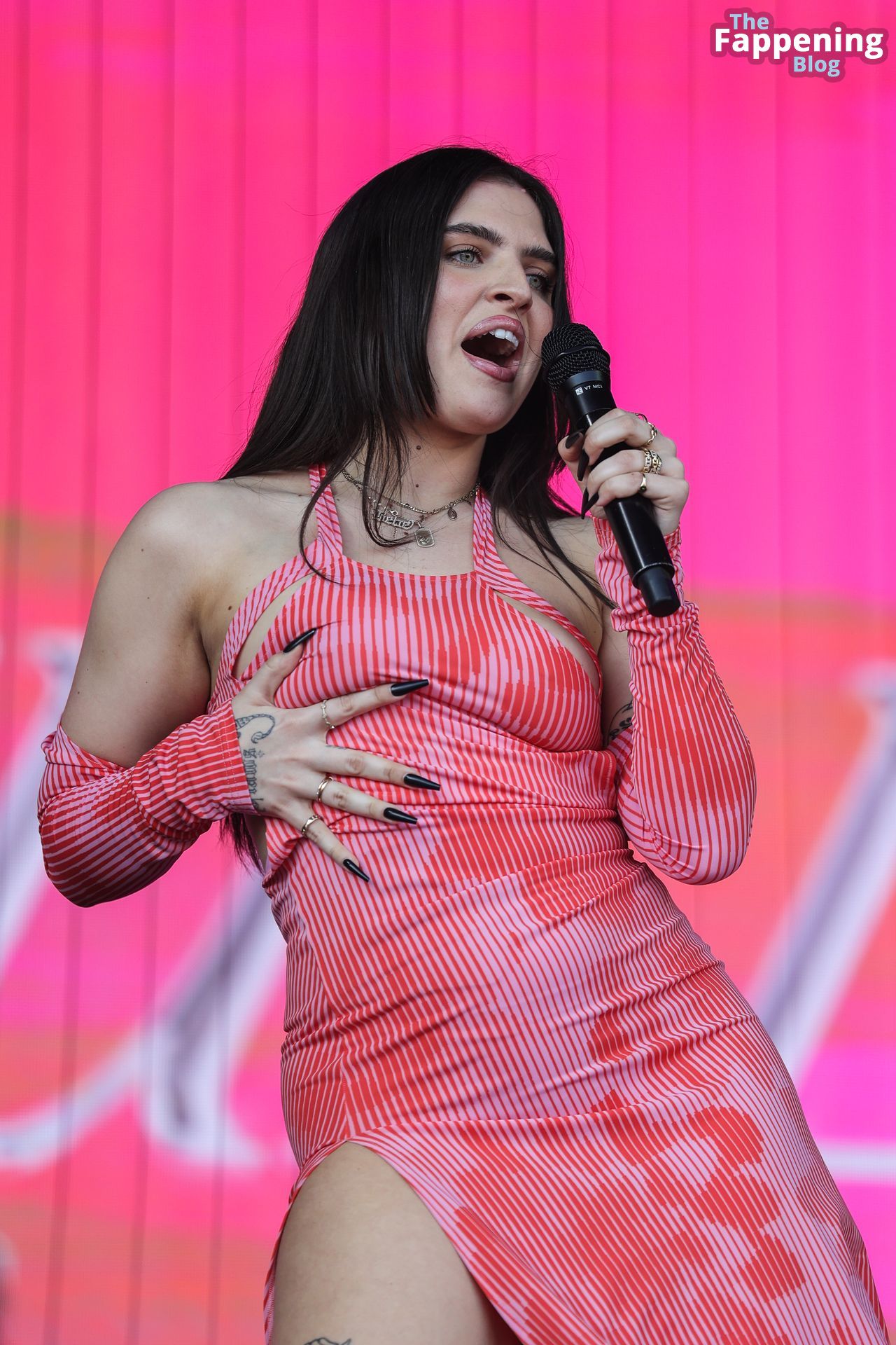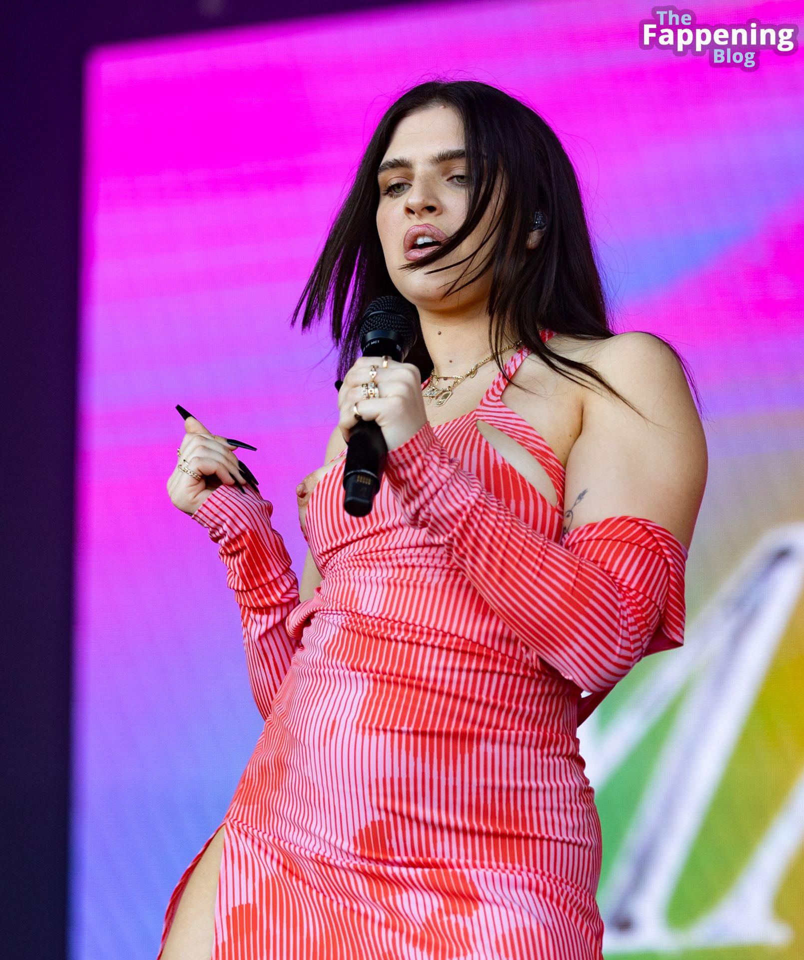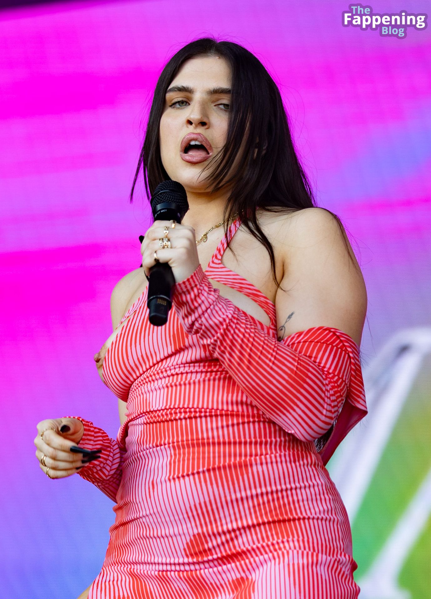 Mae Miller sufre un fallo de vestuario en el escenario del Pride de Birmingham. La cantante mostró su pecho desnudo sin vergüenza durante el concierto, agitando el micrófono como toda una jefa.