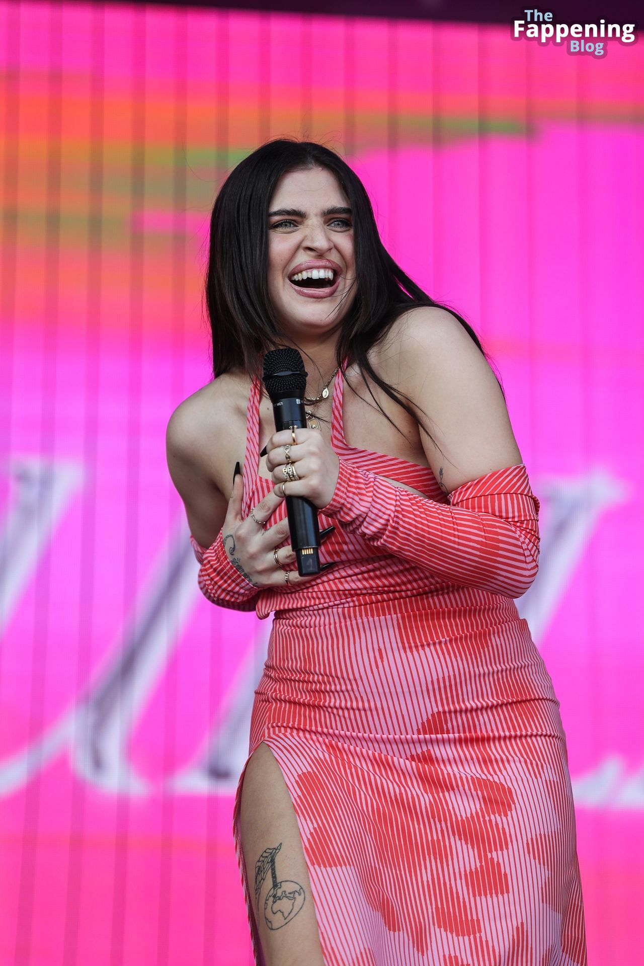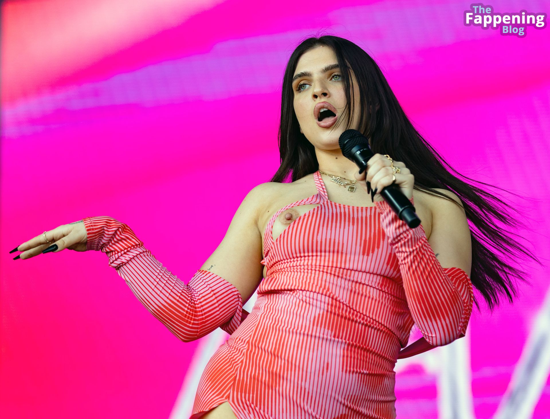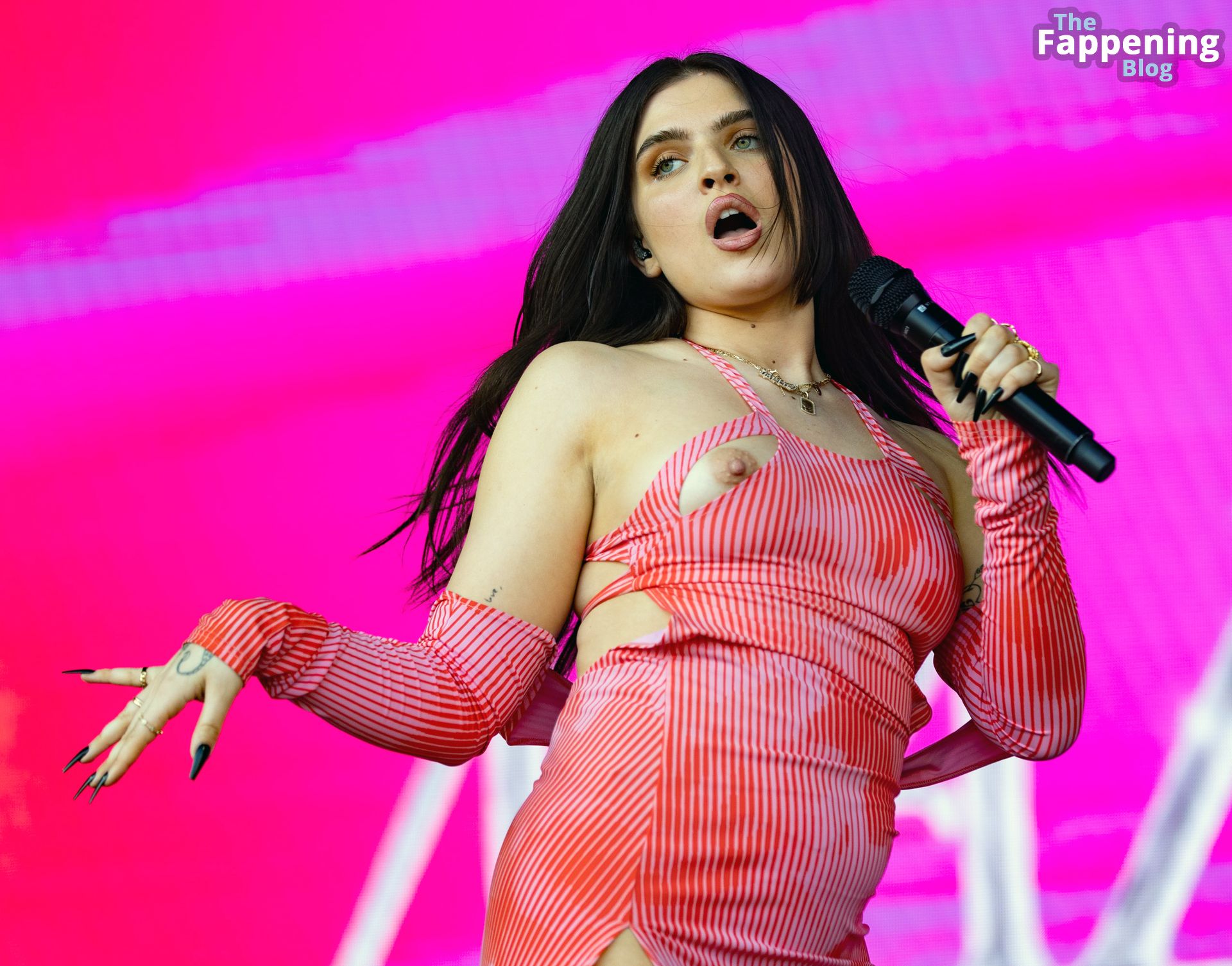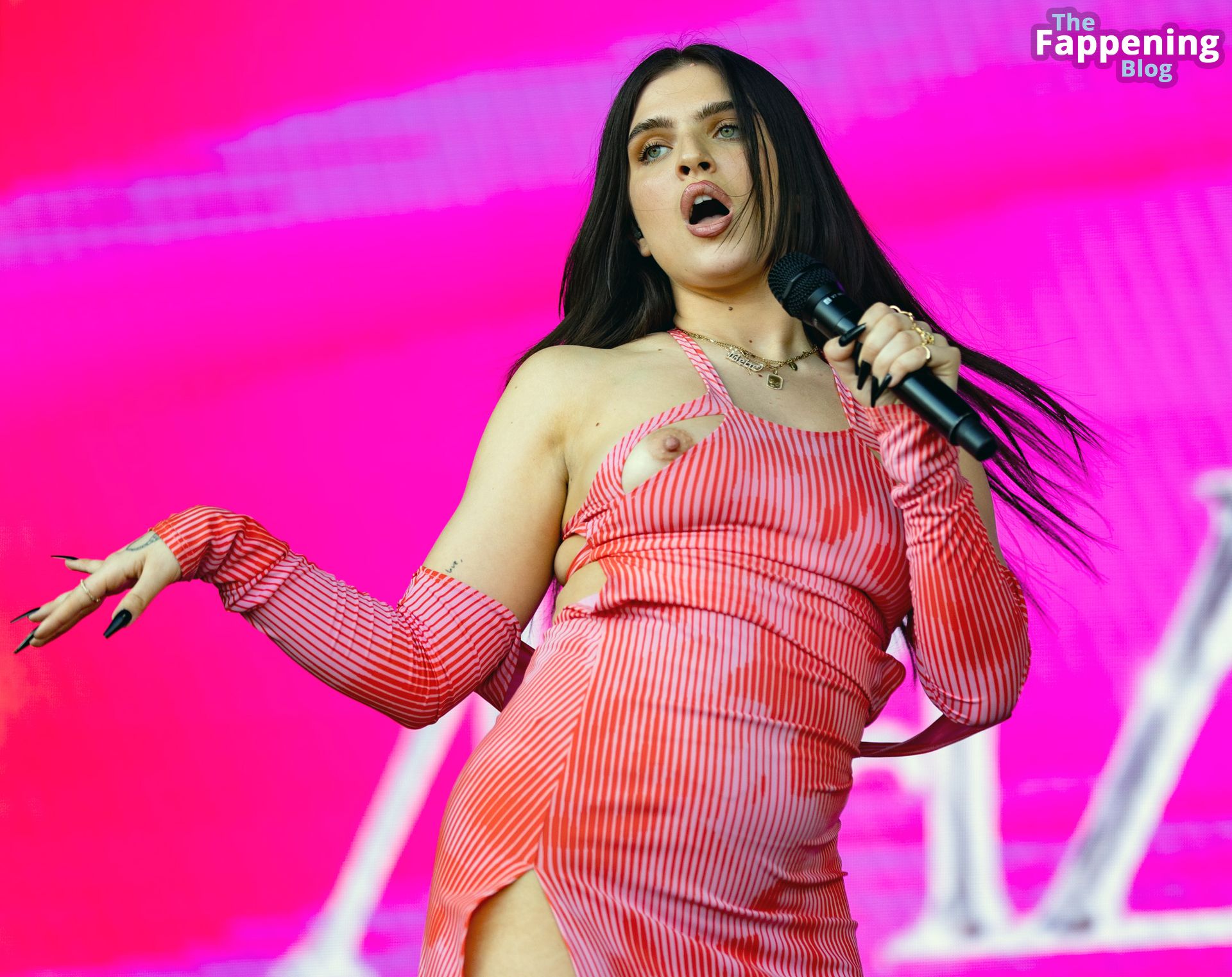 Mae Miller sufre un fallo de vestuario en el escenario del Pride de Birmingham. La cantante mostró su pecho desnudo sin vergüenza durante el concierto, agitando el micrófono como toda una jefa.