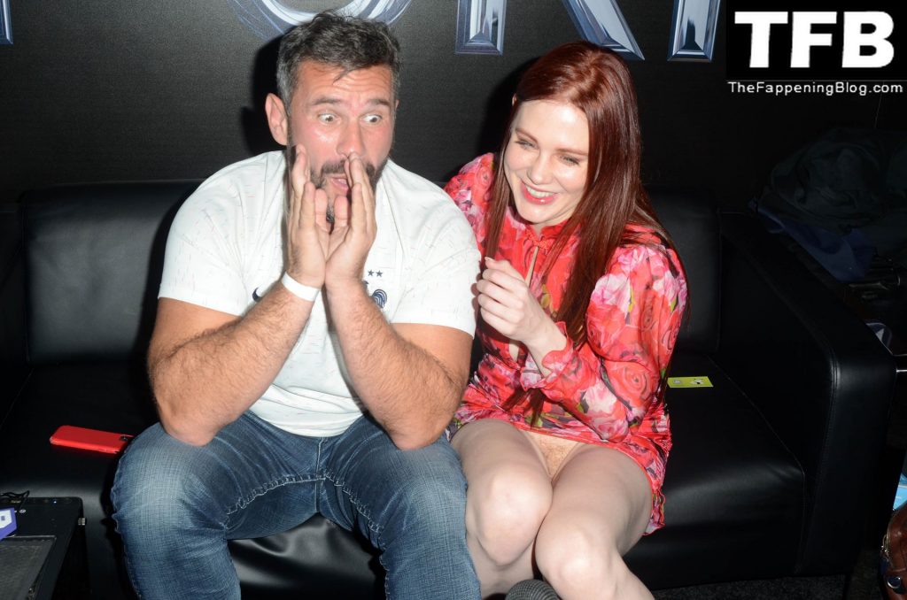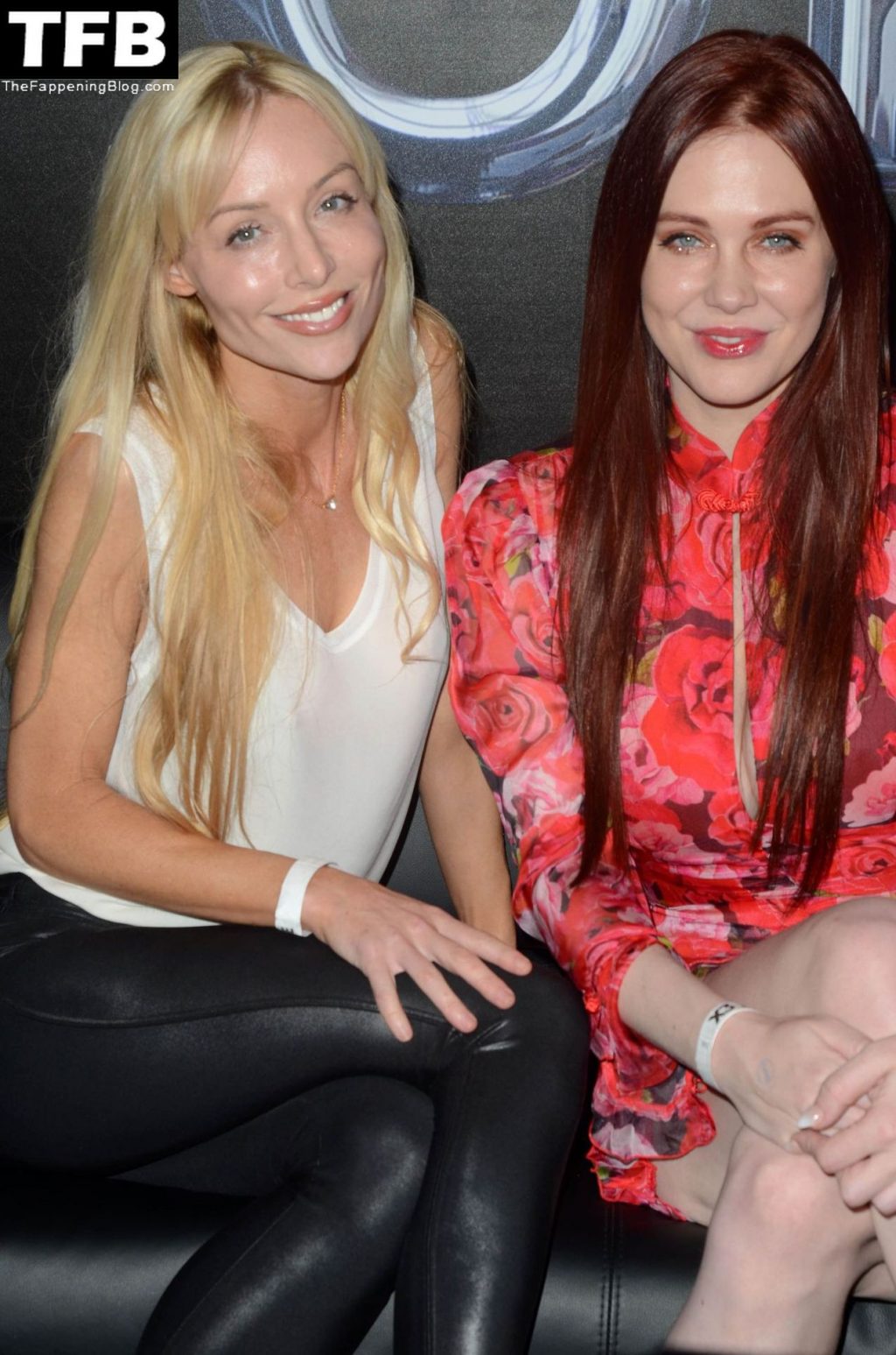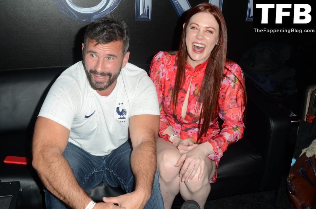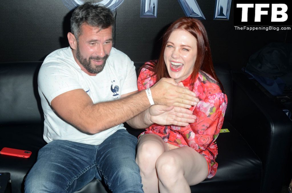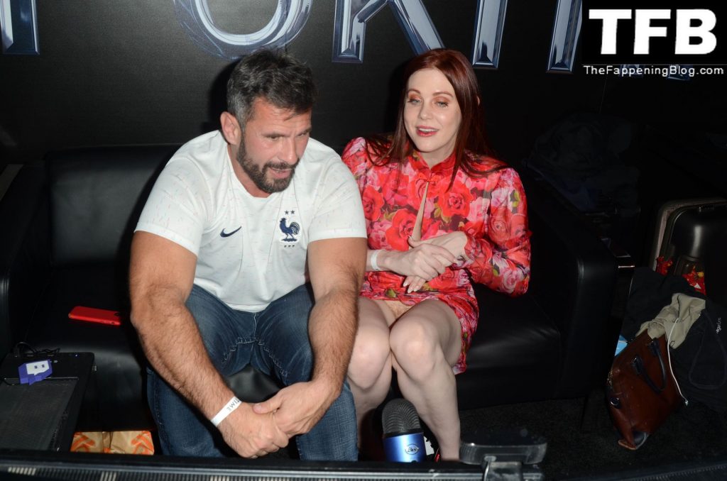 Maitland Ward tiene un serio fallo de vestuario mientras es entrevistada por su coprotagonista adulto Manuel Ferrara en la convención X3 en el Hollywood Palladium, 01/07/2022.