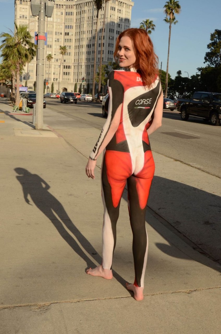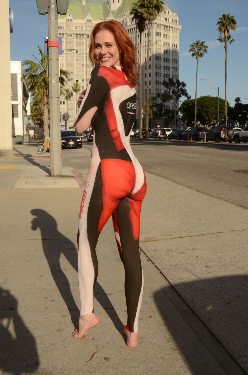 “La estrella de “Boy Meets World” Maitland Ward se pinta el cuerpo como una chica Ducati antes de asistir a una fiesta de disfraces de Cinco de Mayo en Long Beach, 05/05/2019.