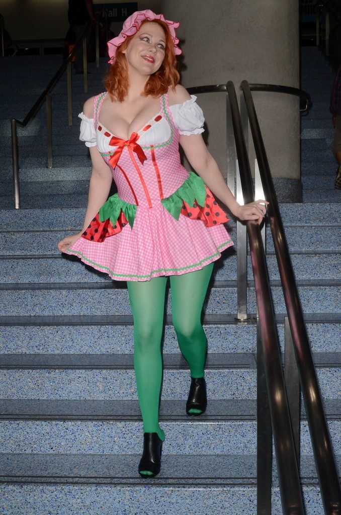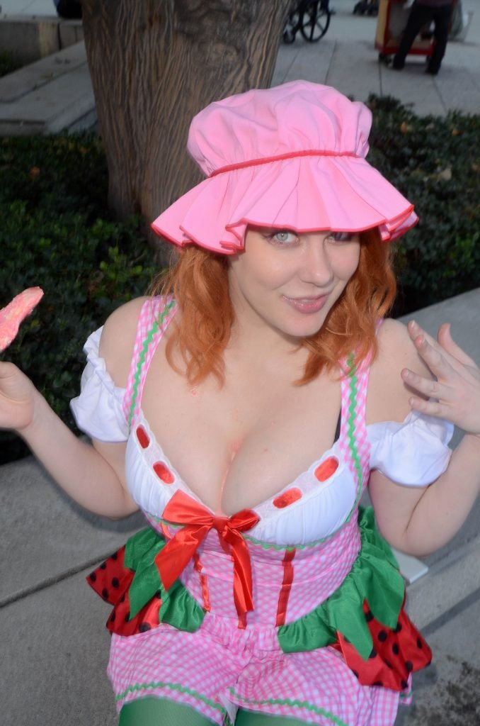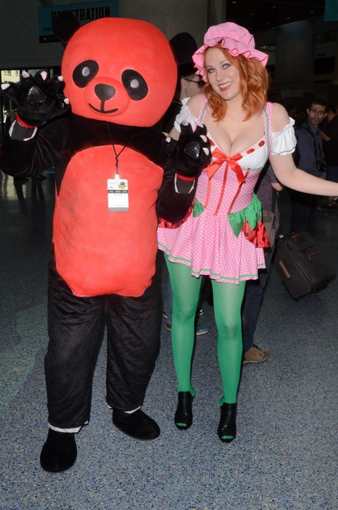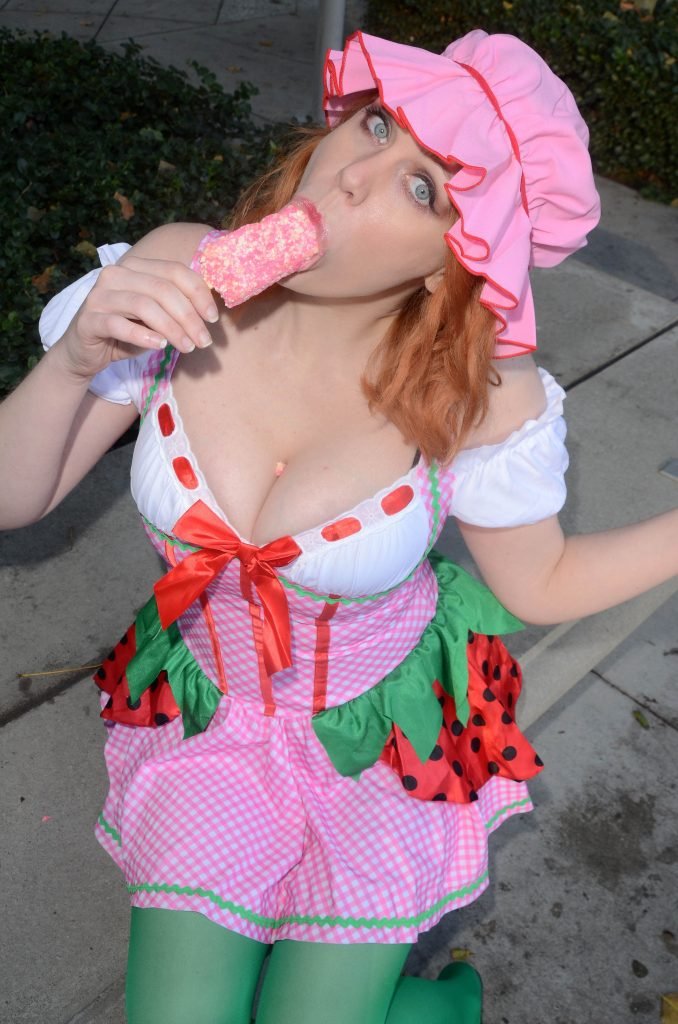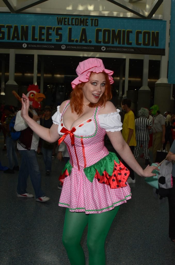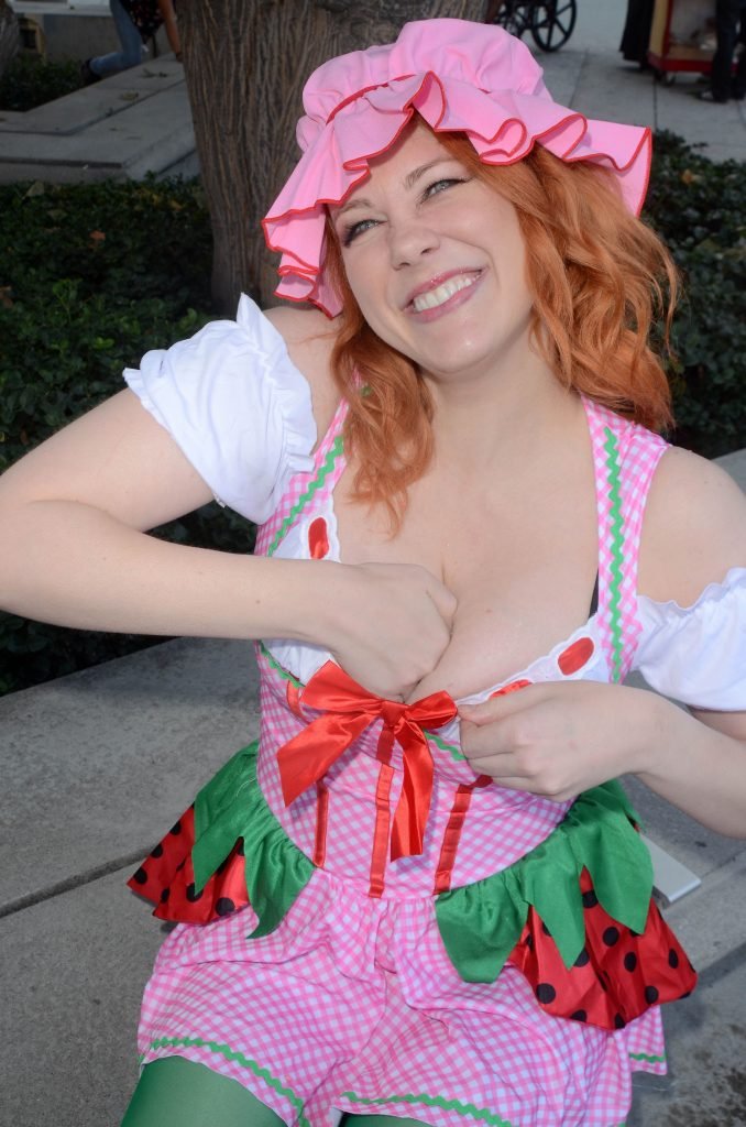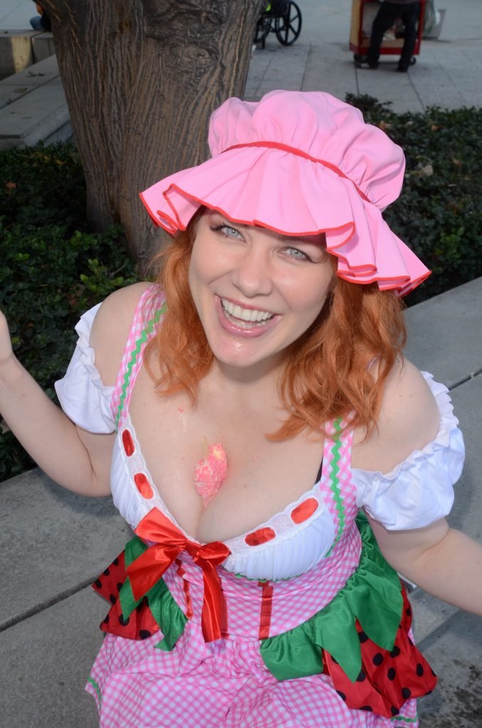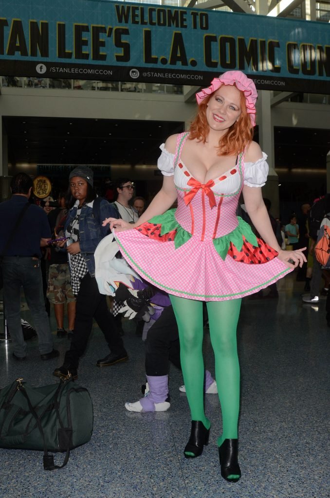 “Boy Meets World” la guapa Maitland Ward, vestida como “Strawberry Shortcake” en el Comic-Con de Los Ángeles de Stan Lee, se ensucia mientras come un helado de Strawberry Shortcake, 28/10/2017.