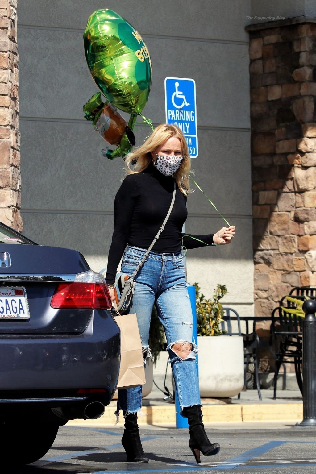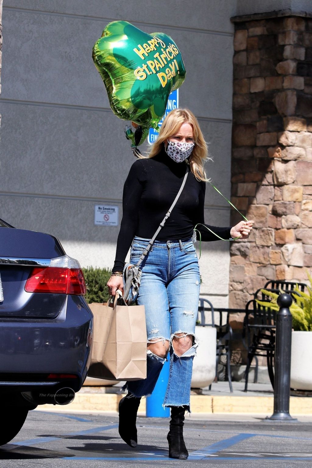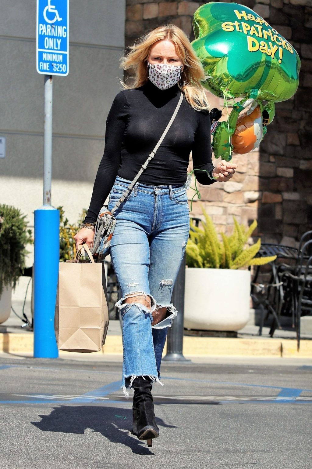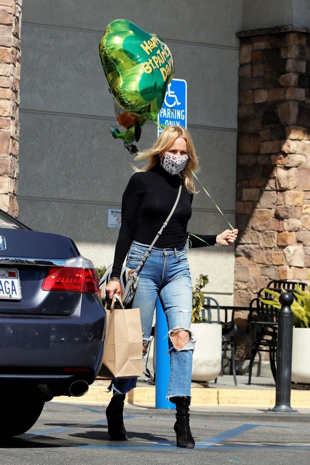 Malin Akerman sale de un mercado de Los Ángeles con grandes globos verdes en celebración del Día de San Patricio, 17/03/2021.