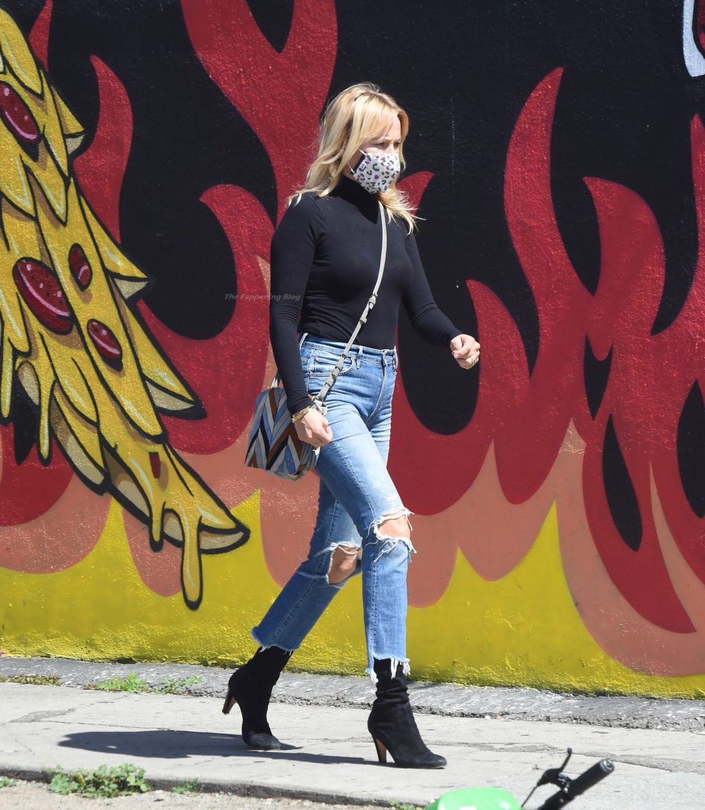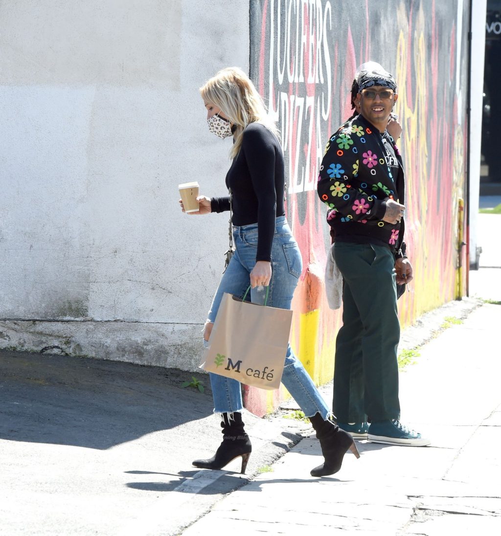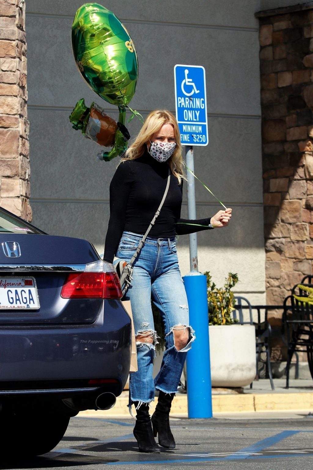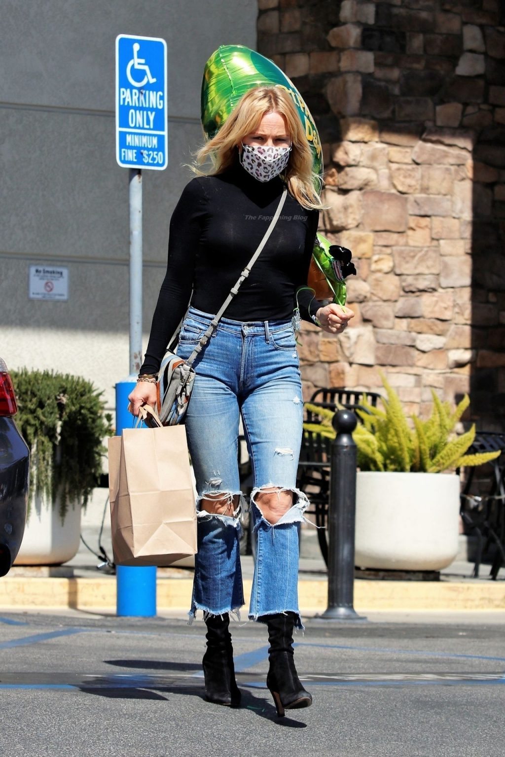 Malin Akerman sale de un mercado de Los Ángeles con grandes globos verdes en celebración del Día de San Patricio, 17/03/2021.
