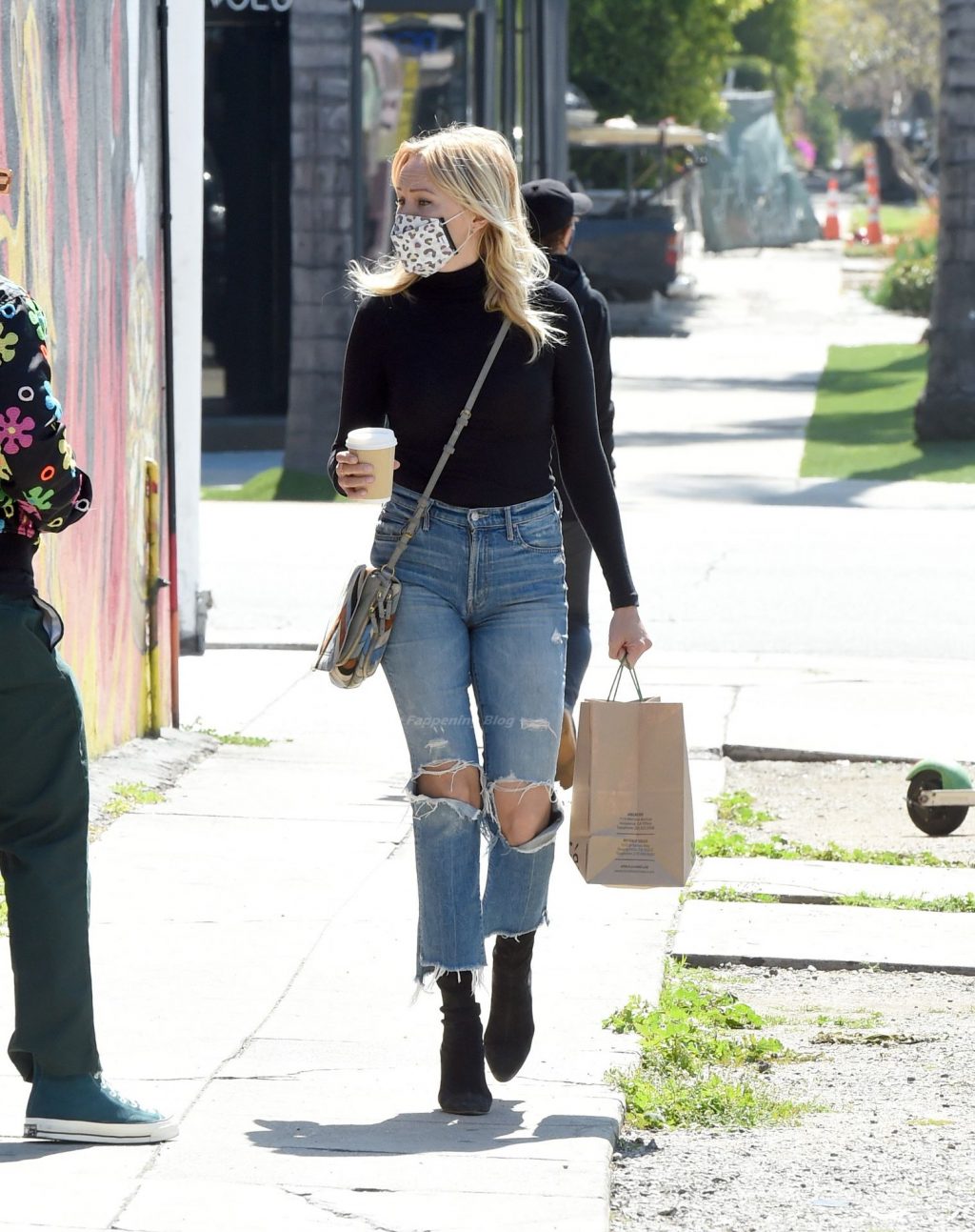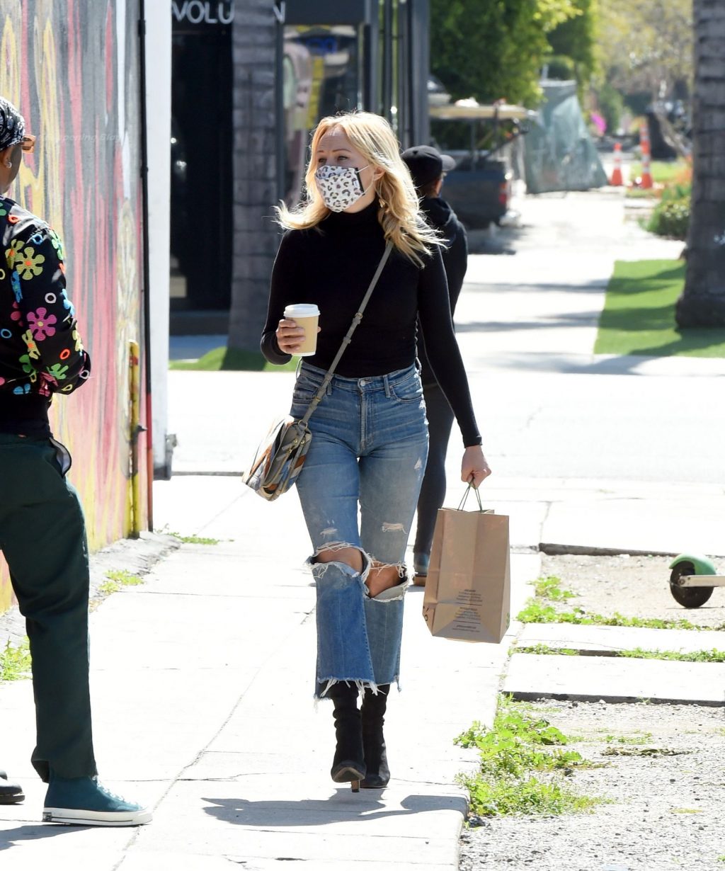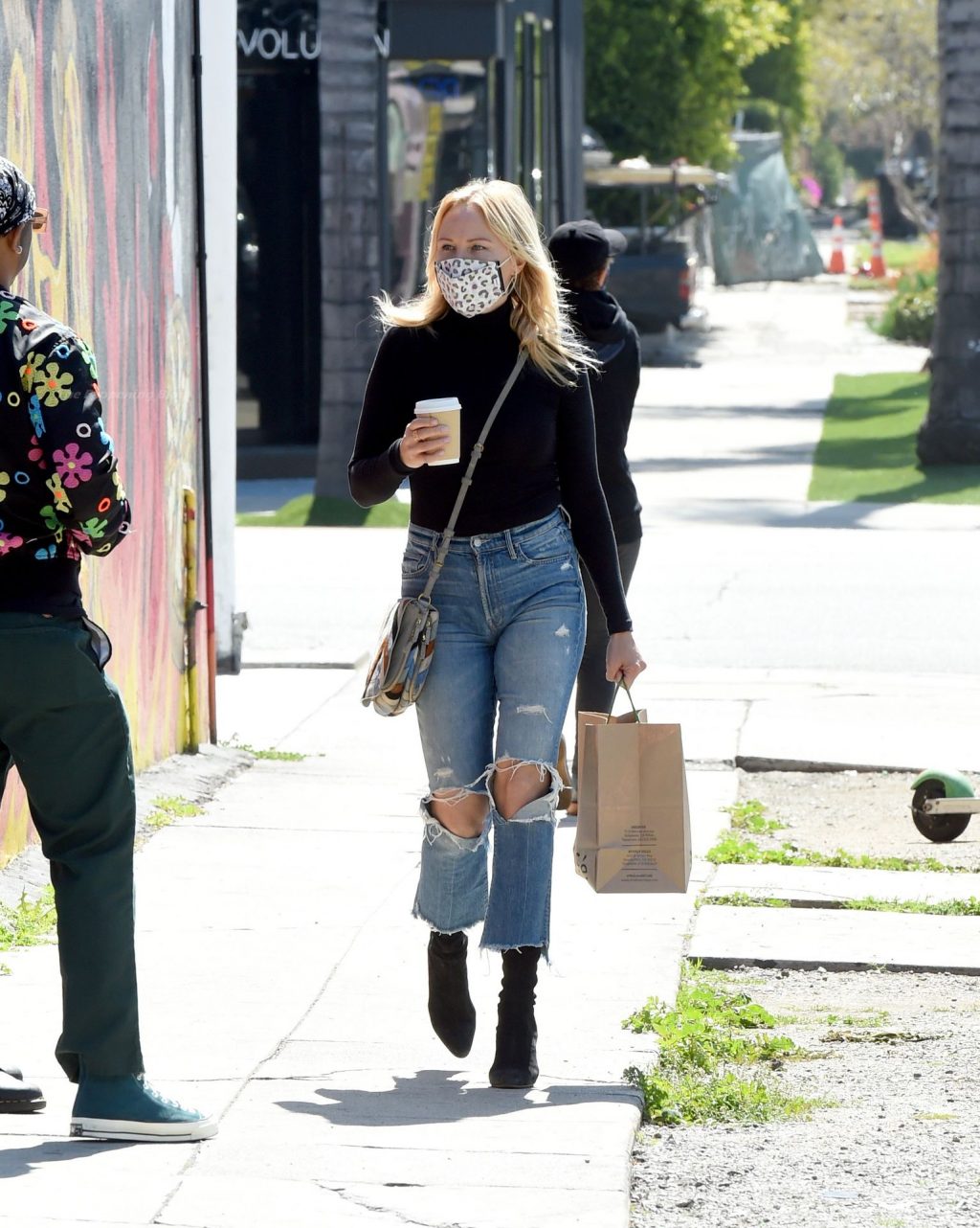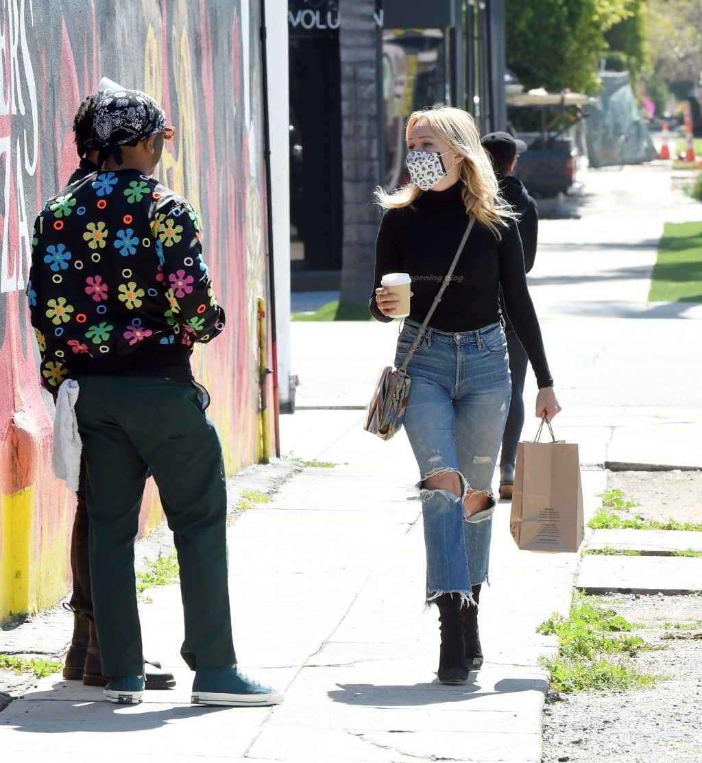 Malin Akerman sale de un mercado de Los Ángeles con grandes globos verdes en celebración del Día de San Patricio, 17/03/2021.