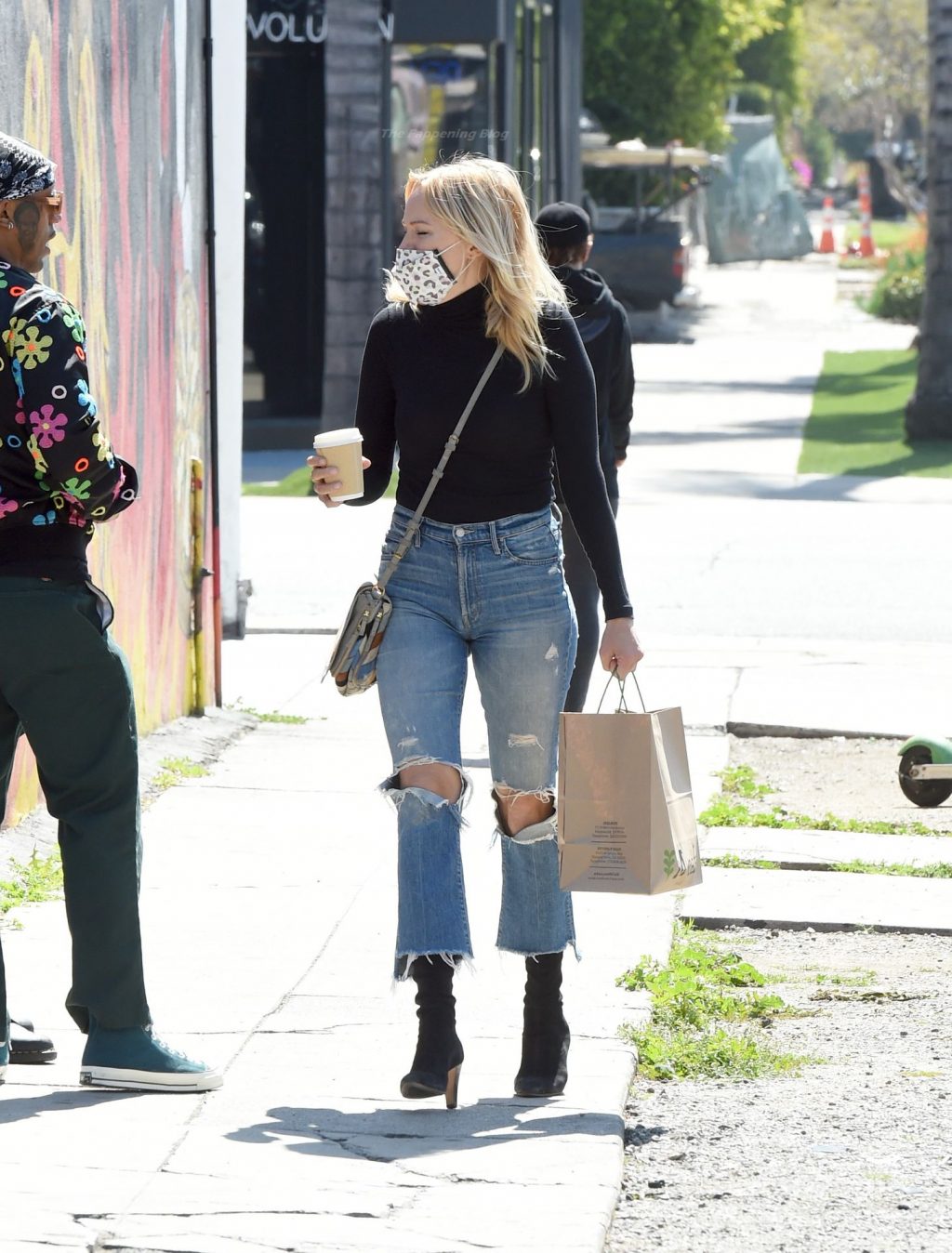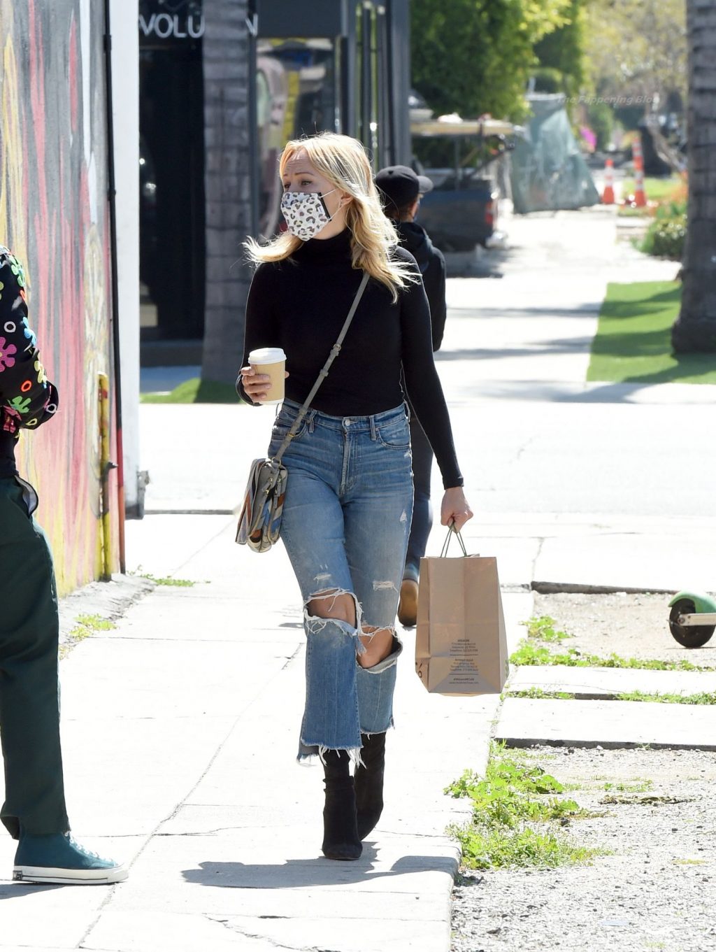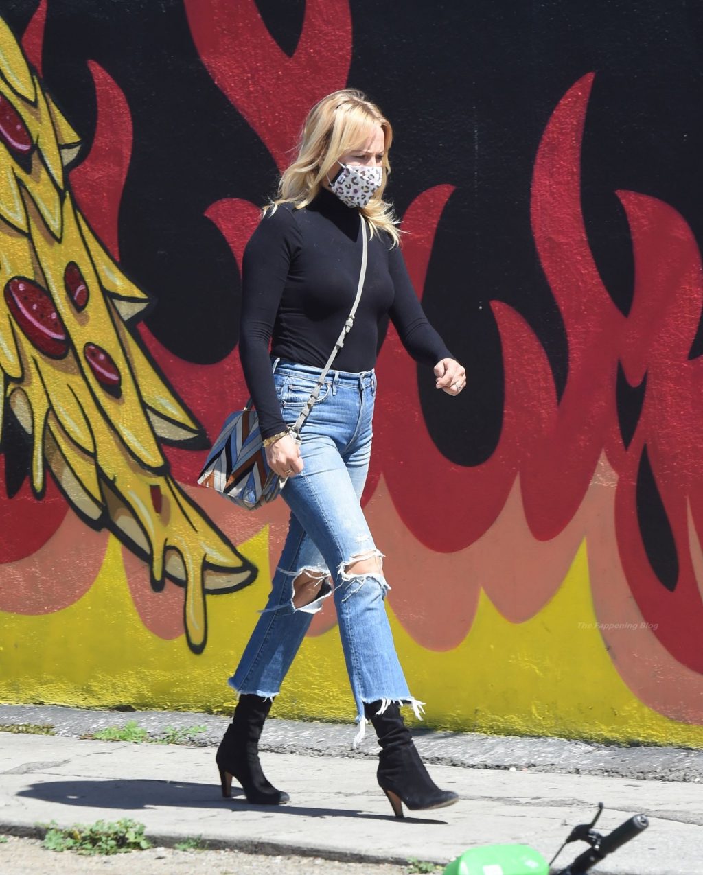 La actriz de 42 años lleva jeans azules rasgados, botas negras y una camisa negra de manga larga.