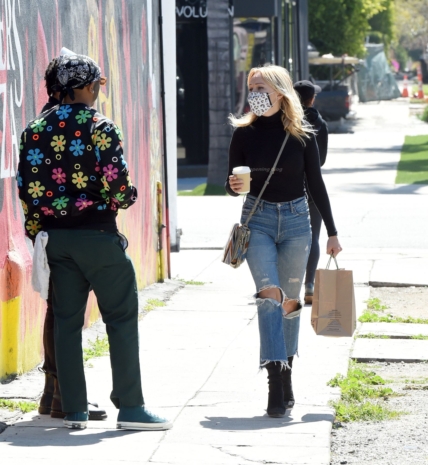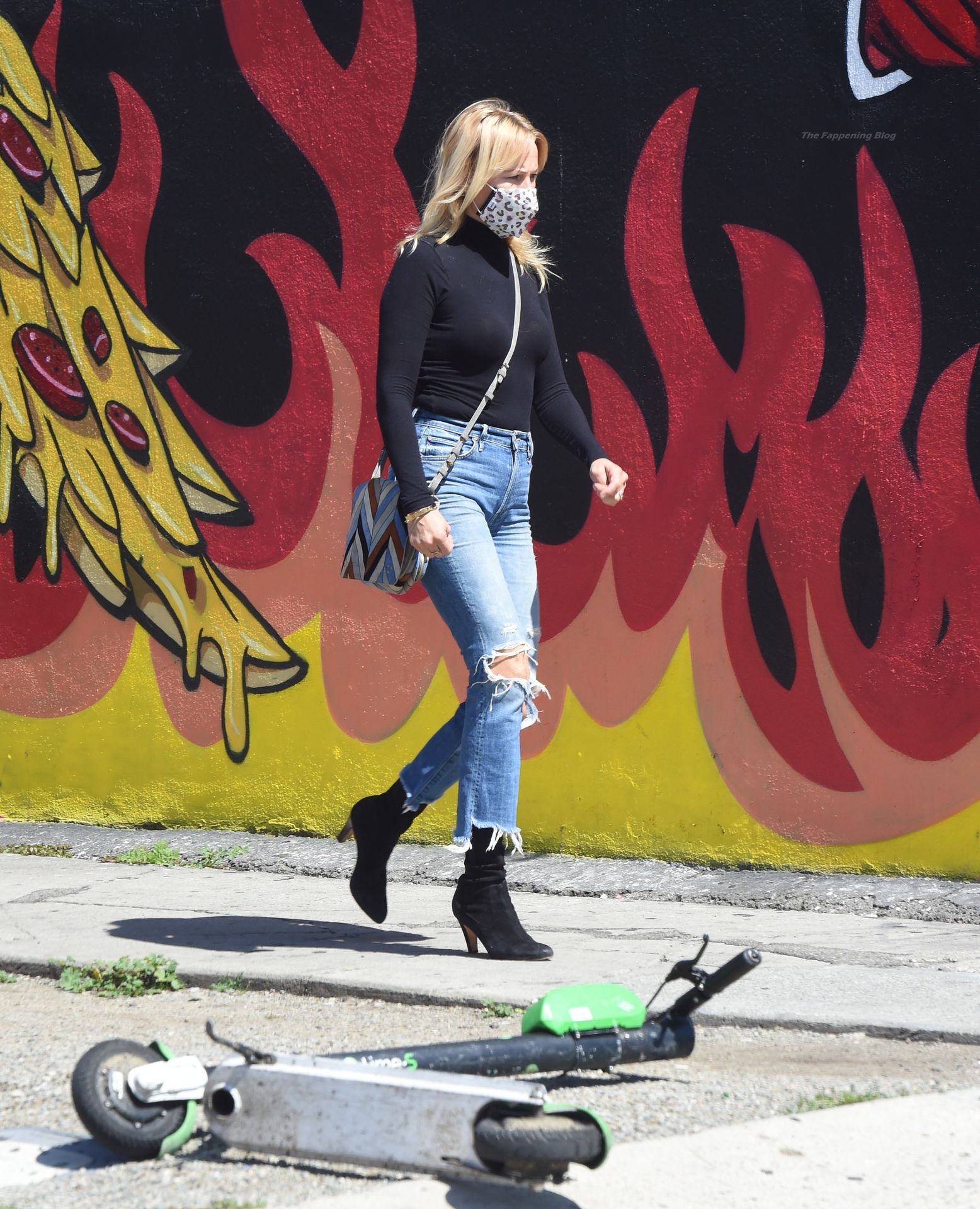 La actriz de 42 años lleva jeans azules rasgados, botas negras y una camisa negra de manga larga.