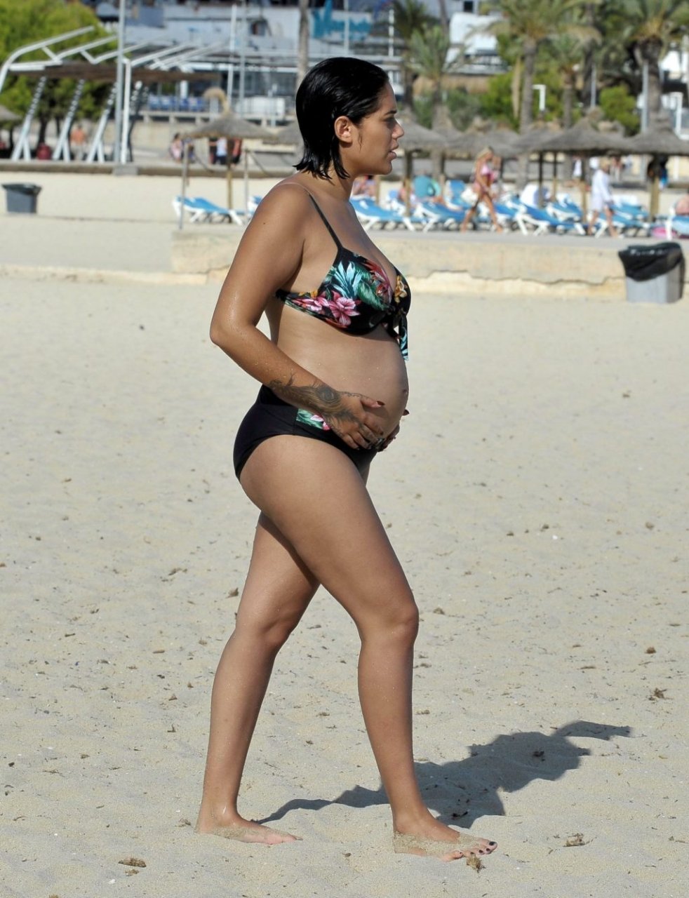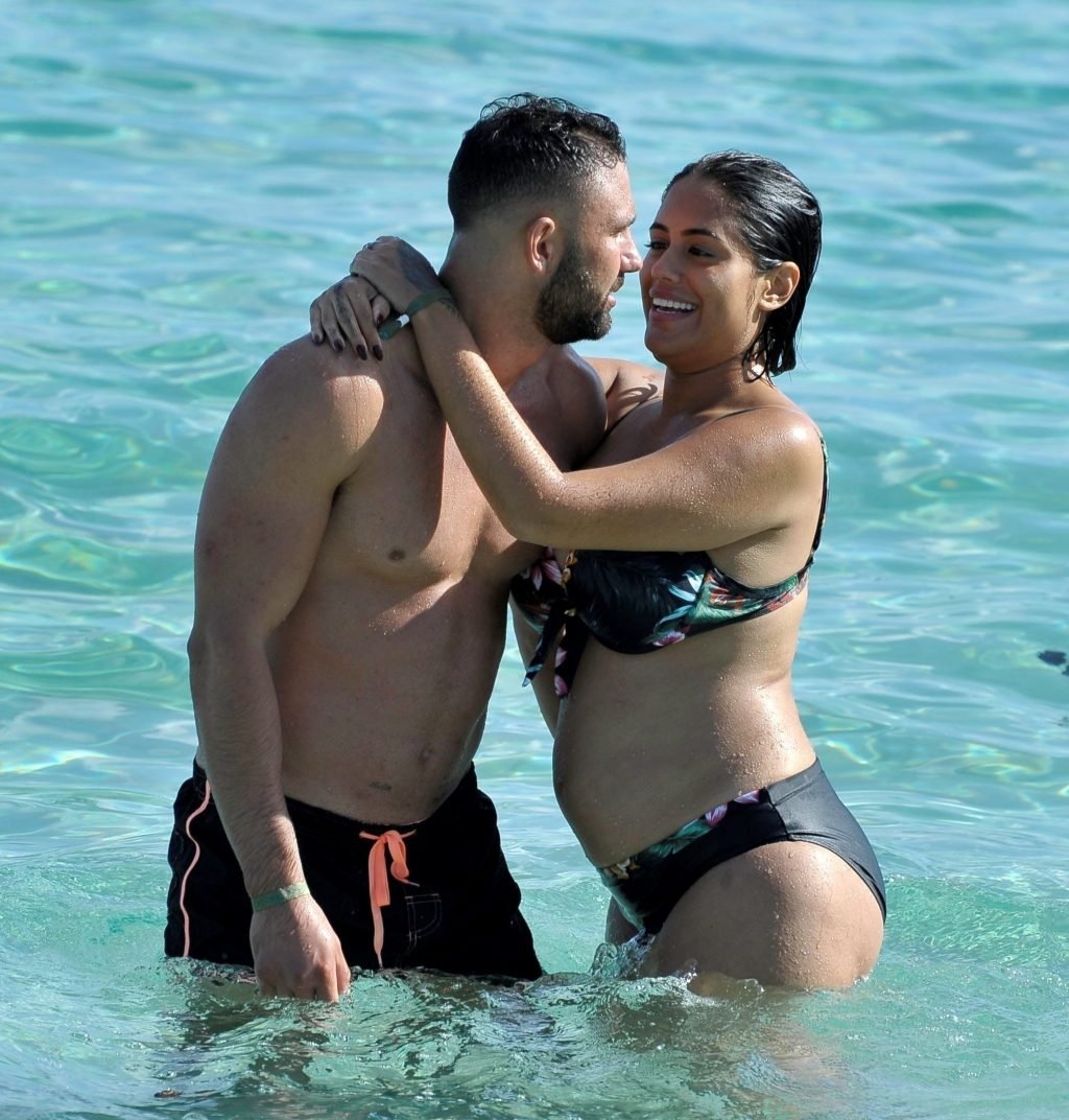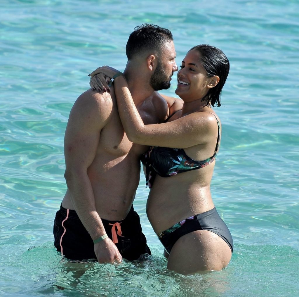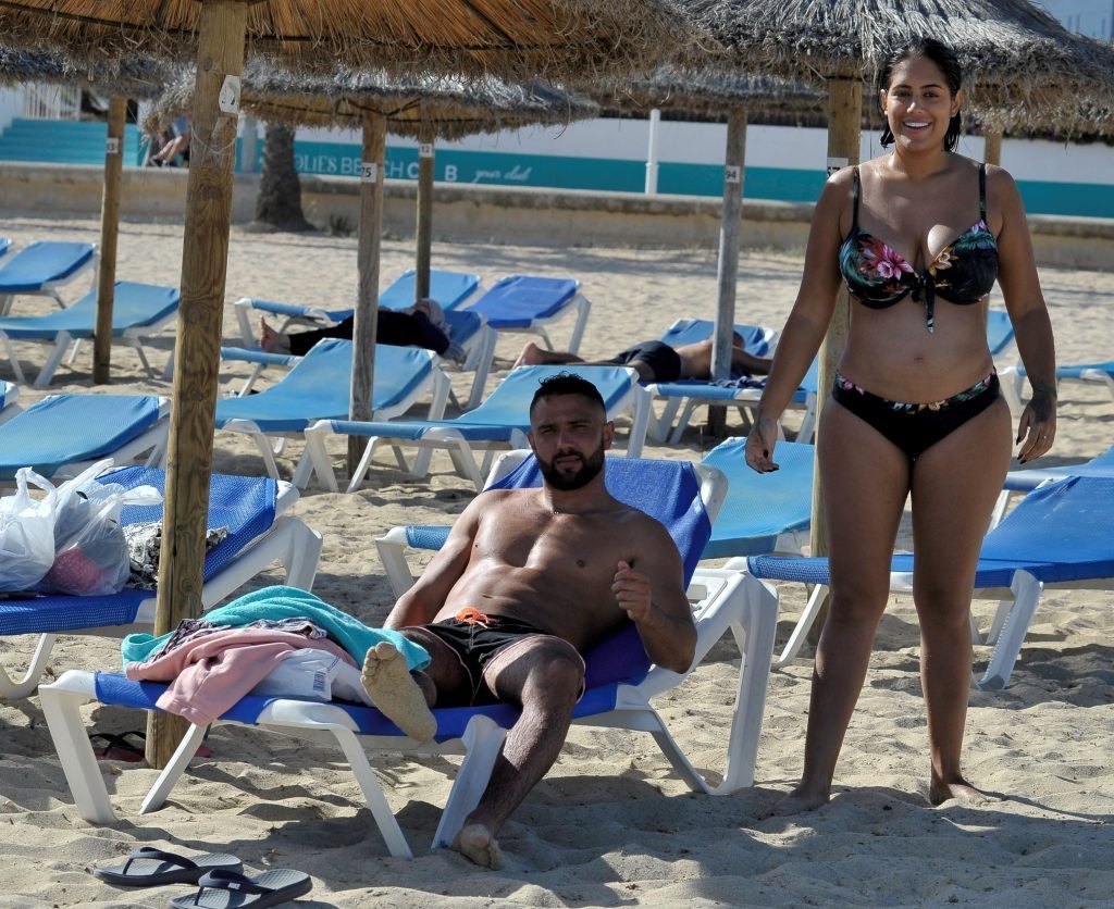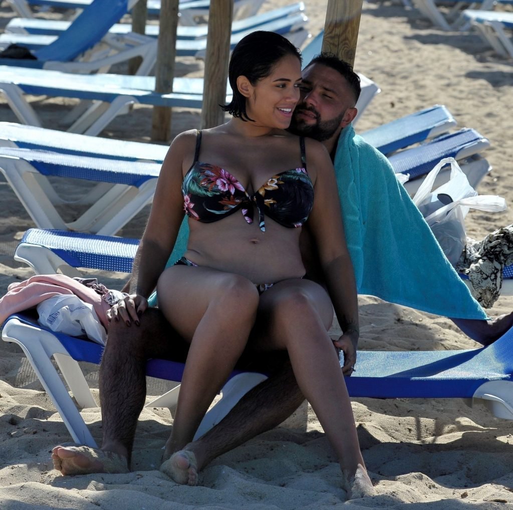 La estrella de “Love Island” Malin Andersson y su novio infiel Tom Kemp muestran afecto en público durante una escapada a España, mientras ella exhibe su barriga de embarazada y recibe un masaje en la playa, 10/06/2018.