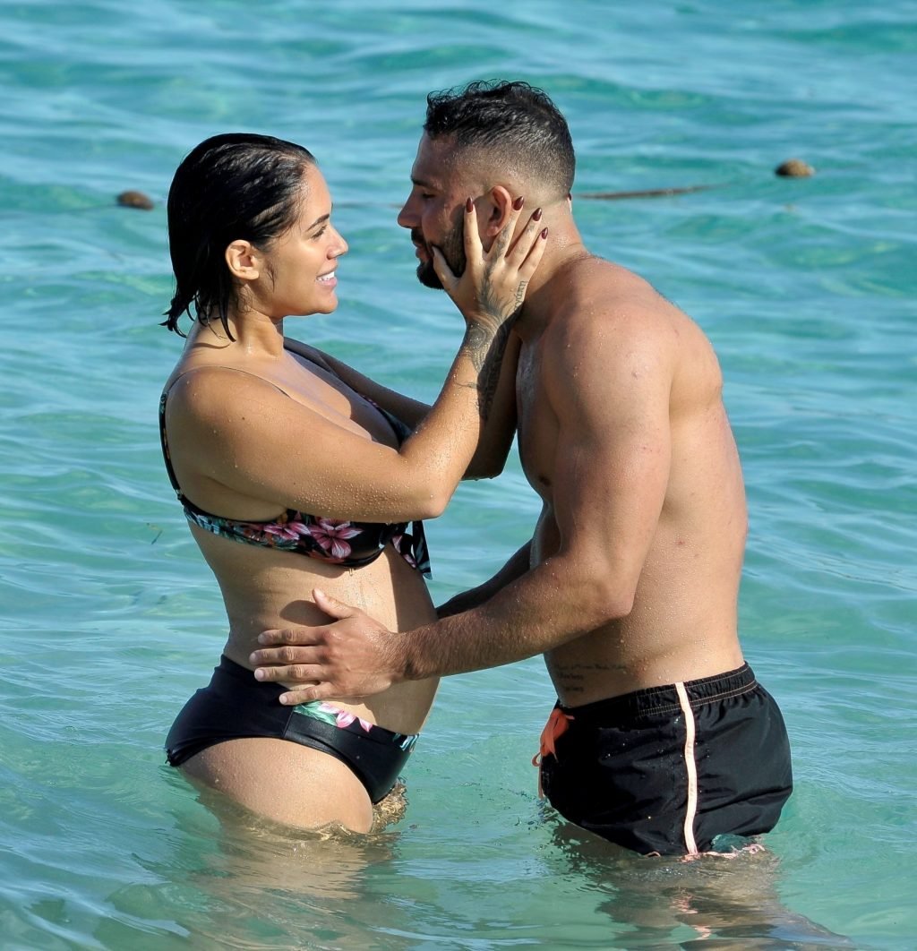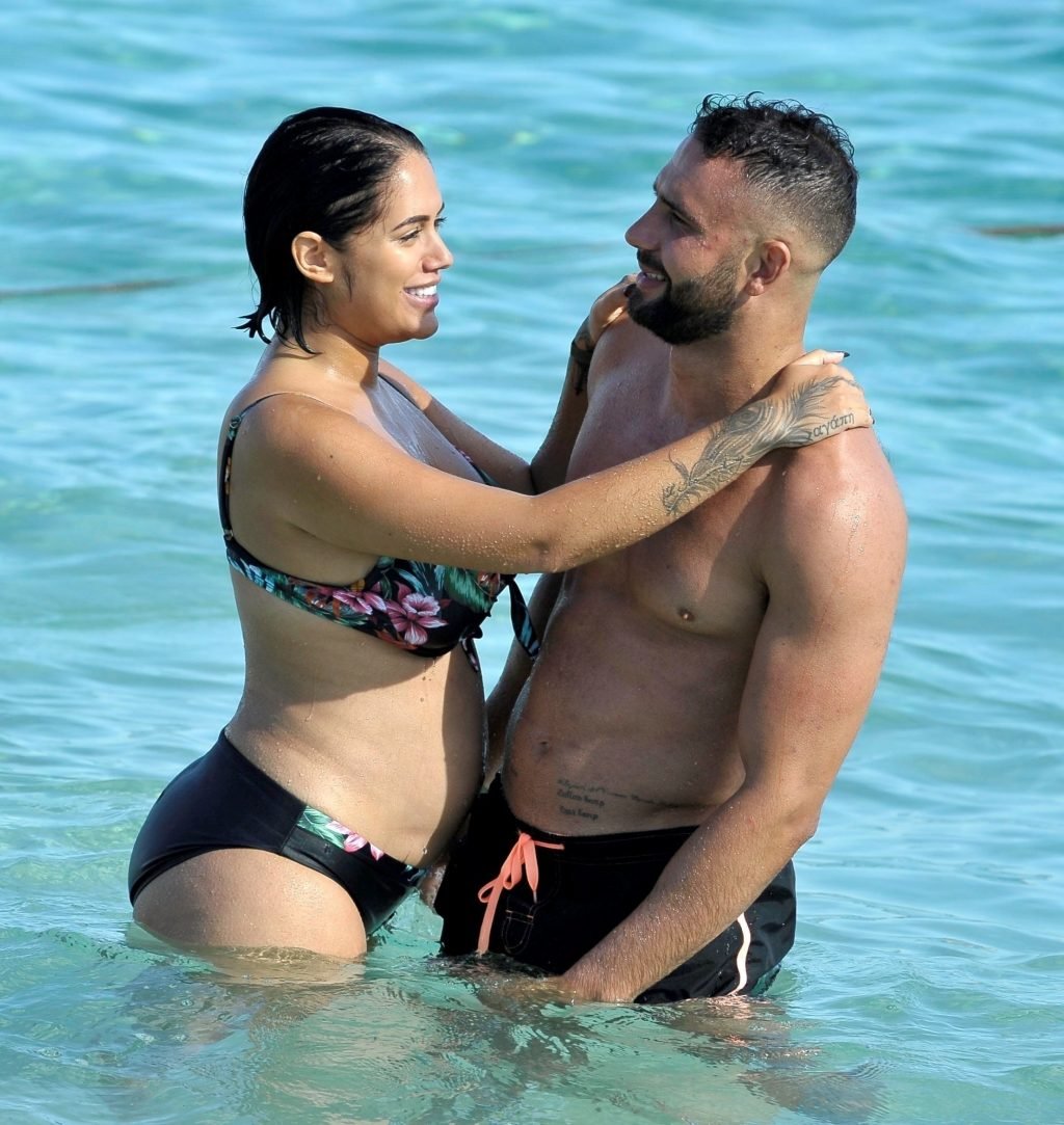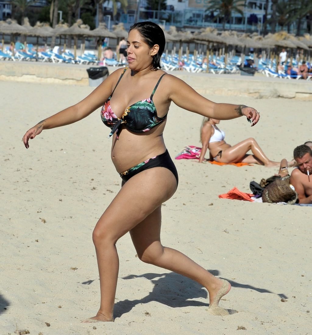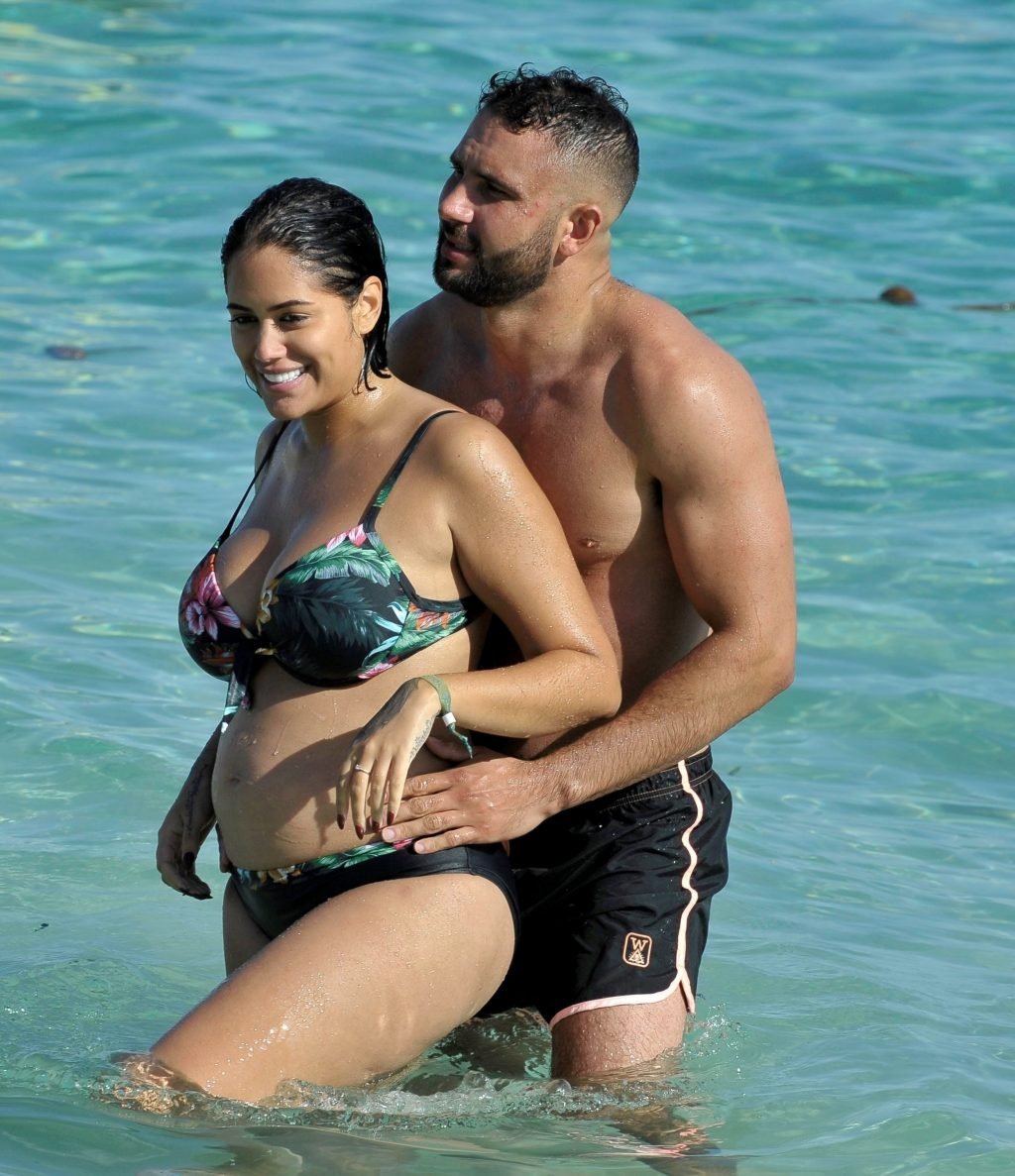 La estrella de “Love Island” Malin Andersson y su novio infiel Tom Kemp muestran afecto en público durante una escapada a España, mientras ella exhibe su barriga de embarazada y recibe un masaje en la playa, 10/06/2018.