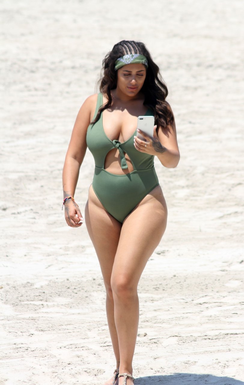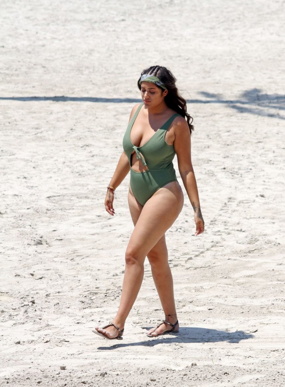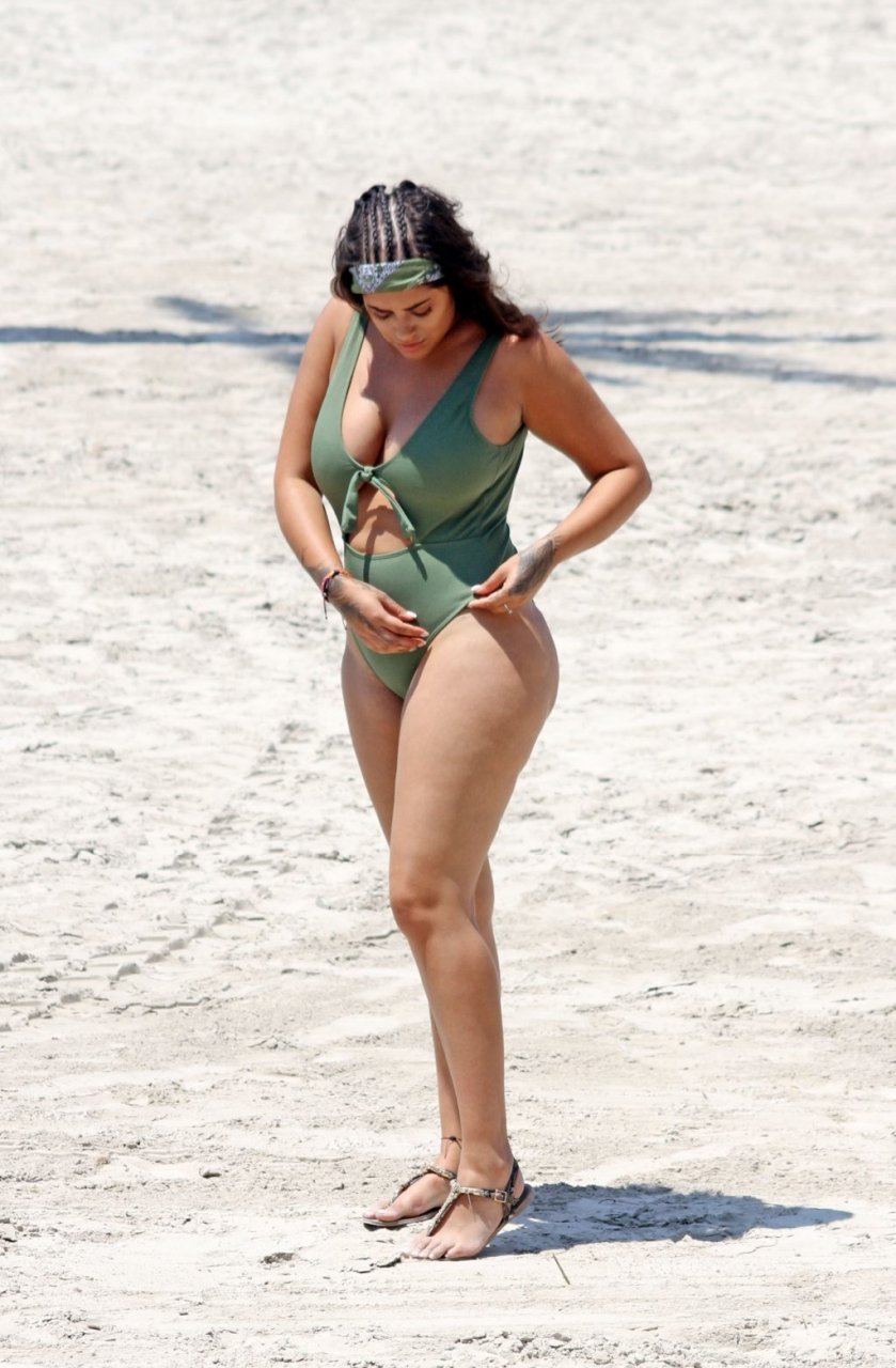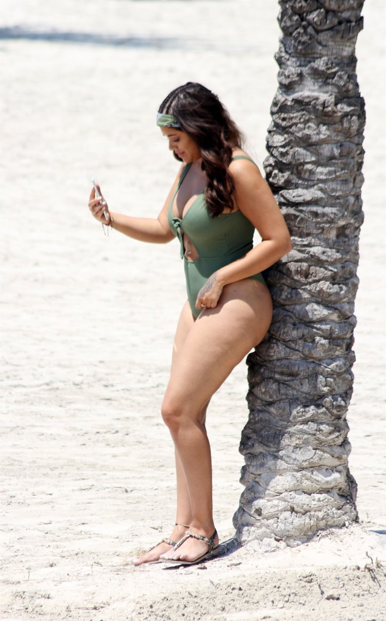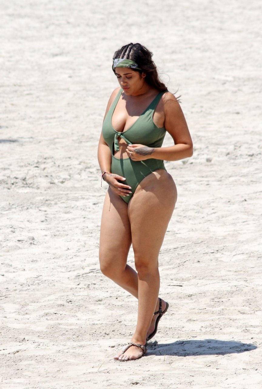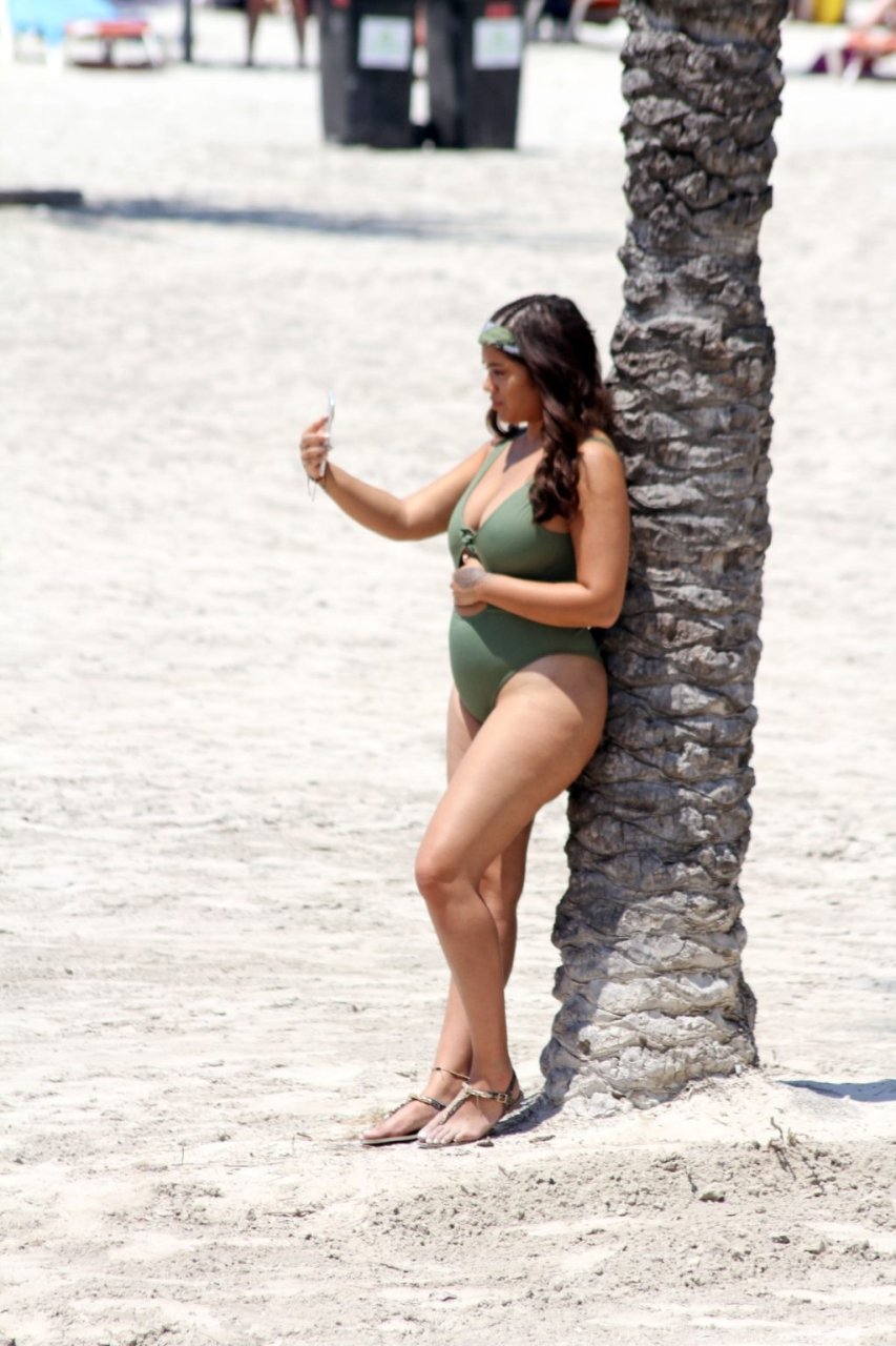 Malin llevaba un bikini de una pieza color verde oliva y se la vio sosteniendo su estómago (mano sobre la barriga de embarazada) y tomando selfies junto a una palmera durante su paseo. Malin, que recientemente anunció que está embarazada, muestra su barriga de embarazada y su levantamiento de pecho y glúteos 7k mientras caminaba por la playa de arena blanca.