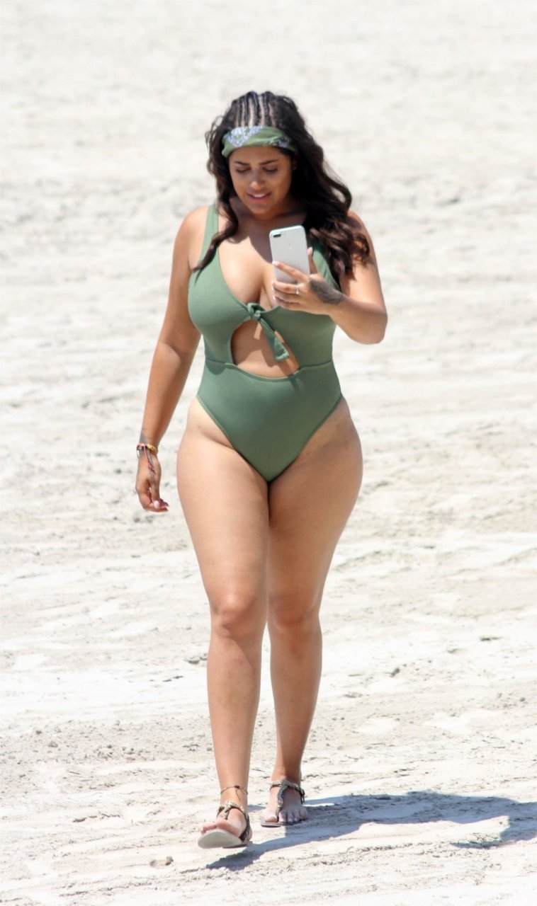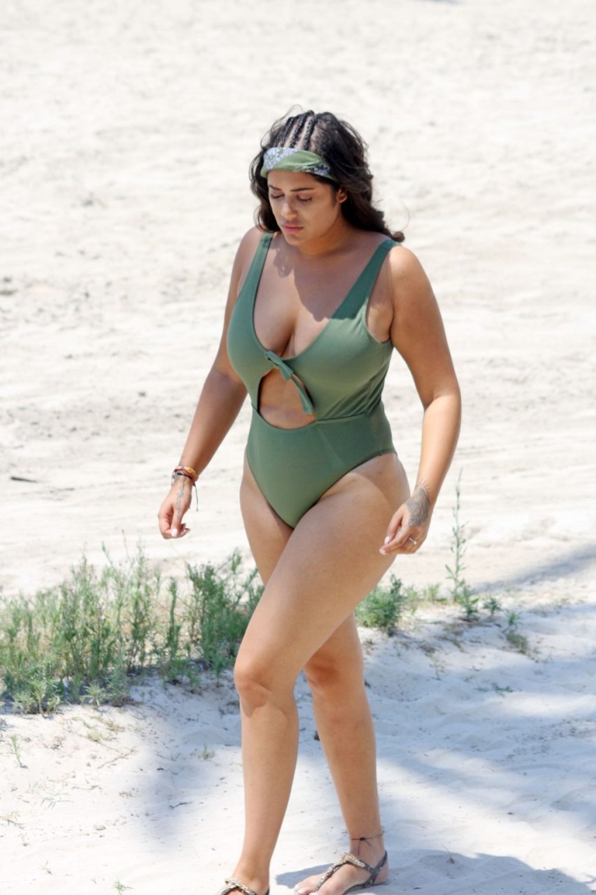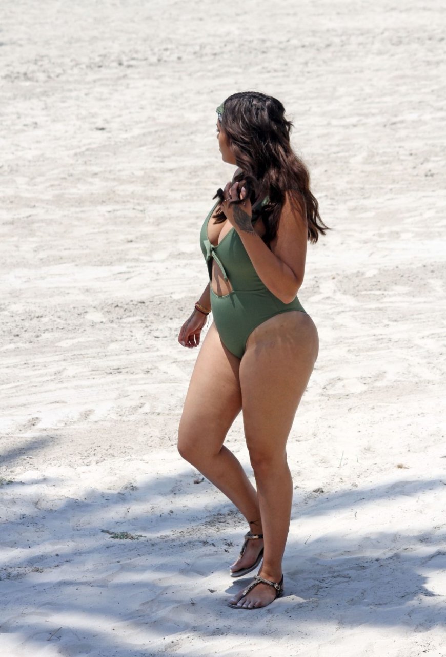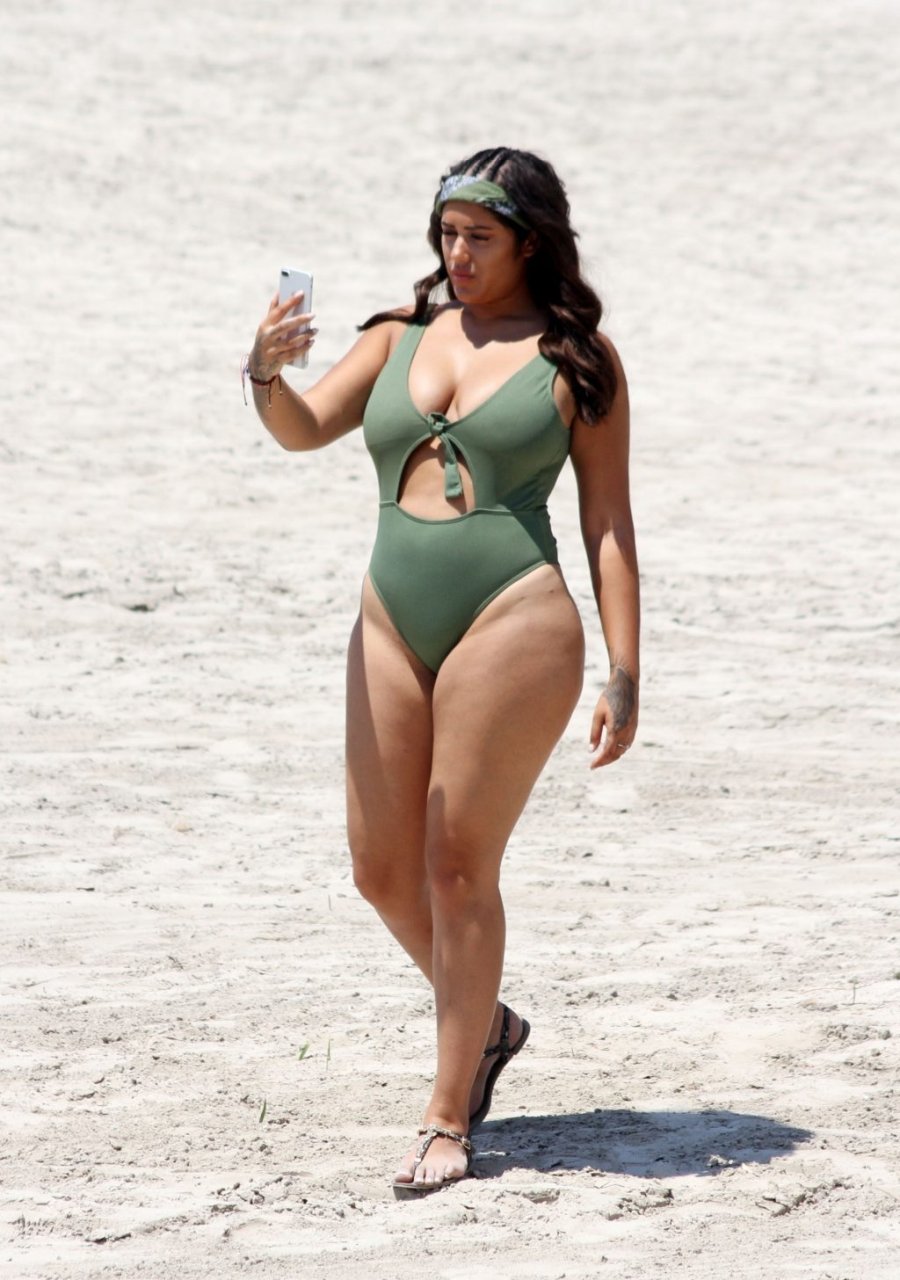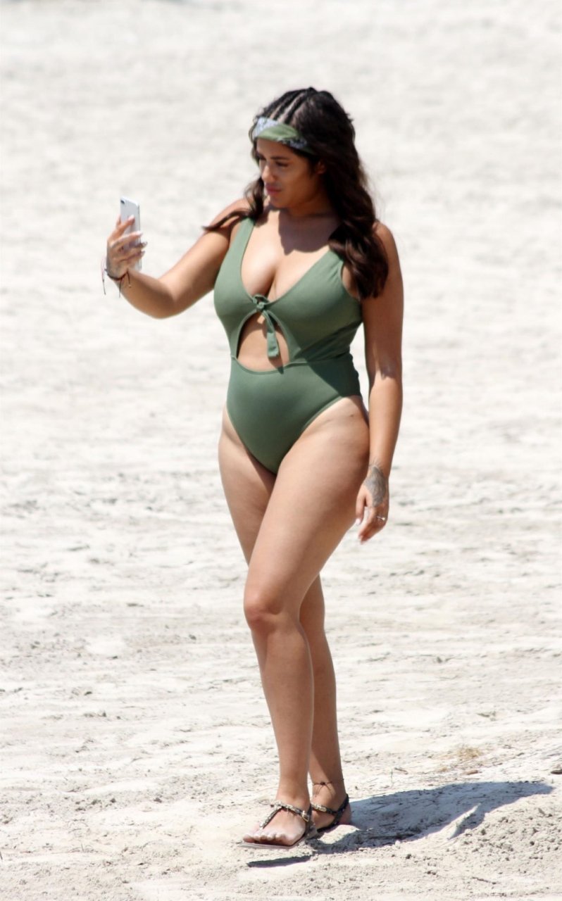 Malin llevaba un bikini de una pieza color verde oliva y se la vio sosteniendo su estómago (mano sobre la barriga de embarazada) y tomando selfies junto a una palmera durante su paseo. Malin, que recientemente anunció que está embarazada, muestra su barriga de embarazada y su levantamiento de pecho y glúteos 7k mientras caminaba por la playa de arena blanca.