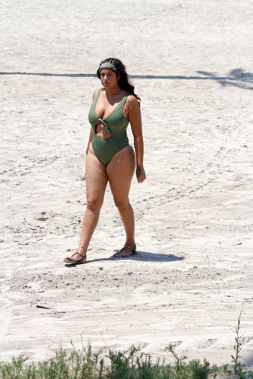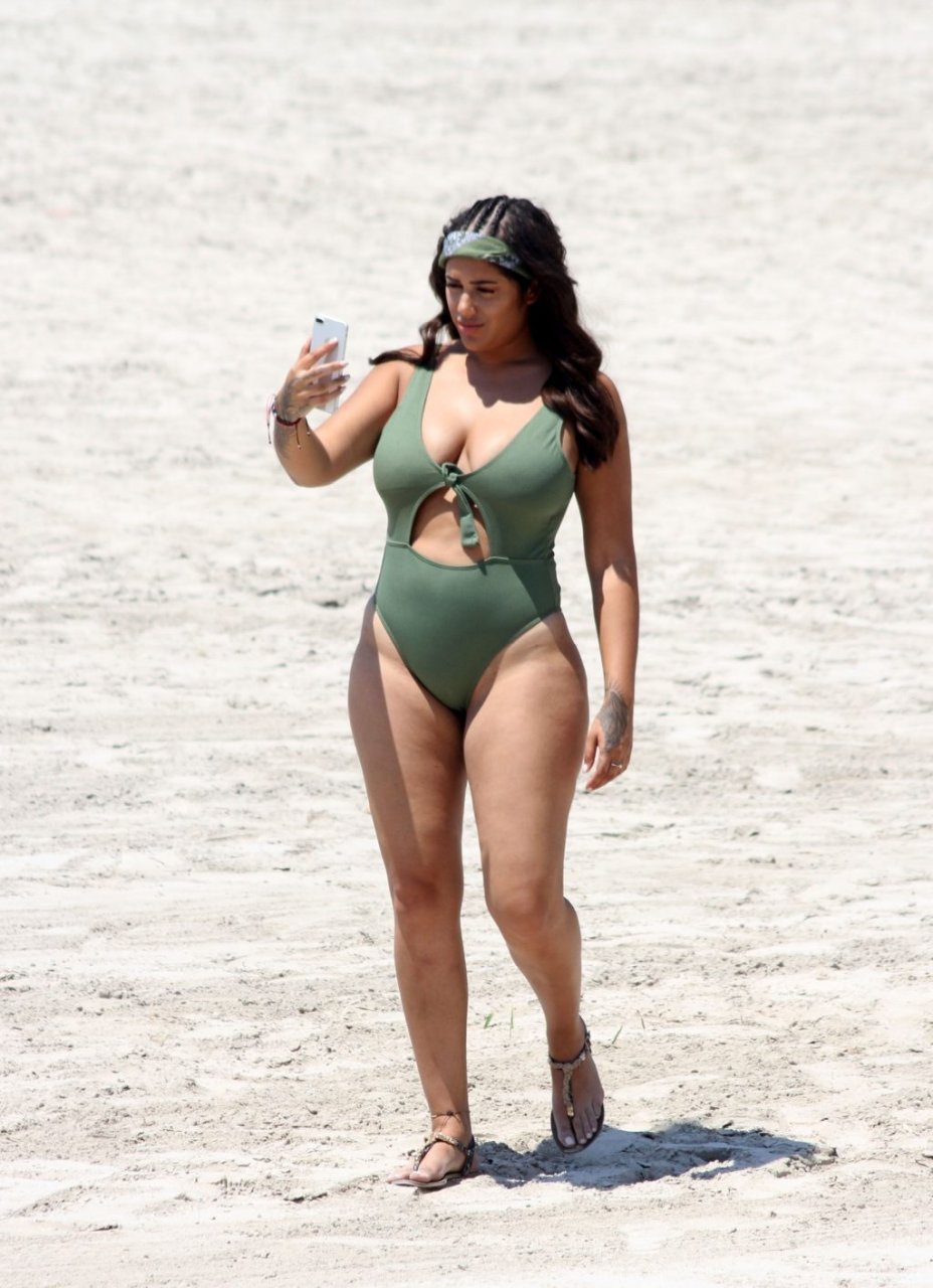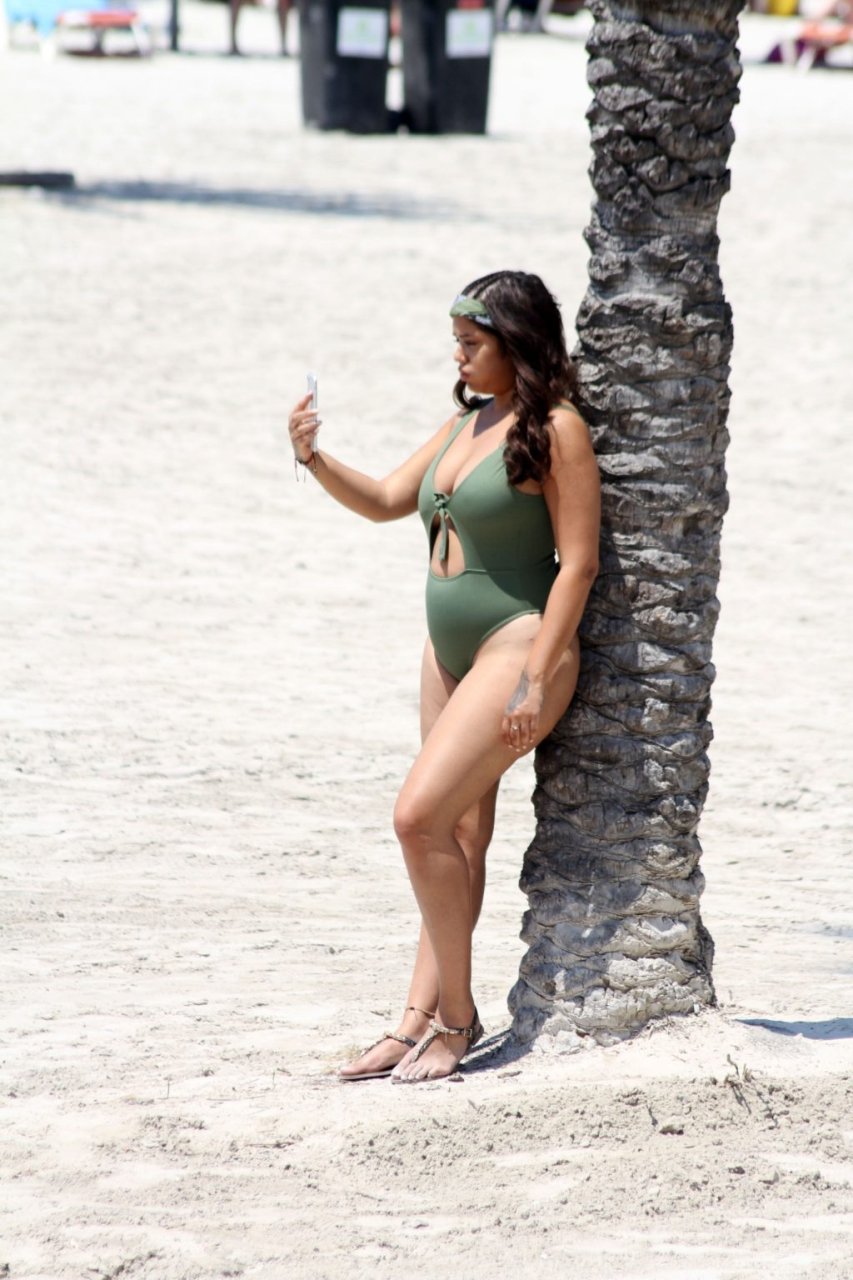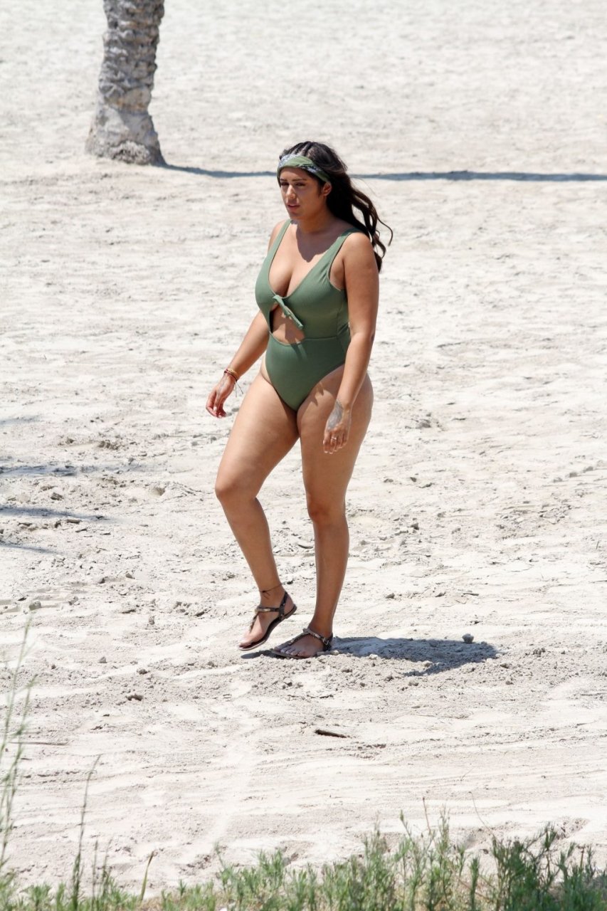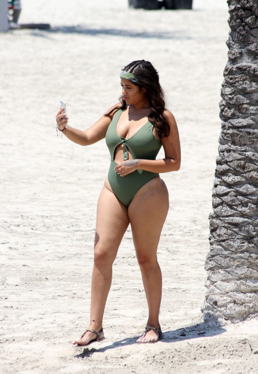 Malin llevaba un bikini de una pieza color verde oliva y se la vio sosteniendo su estómago (mano sobre la barriga de embarazada) y tomando selfies junto a una palmera durante su paseo. Malin, que recientemente anunció que está embarazada, muestra su barriga de embarazada y su levantamiento de pecho y glúteos 7k mientras caminaba por la playa de arena blanca.